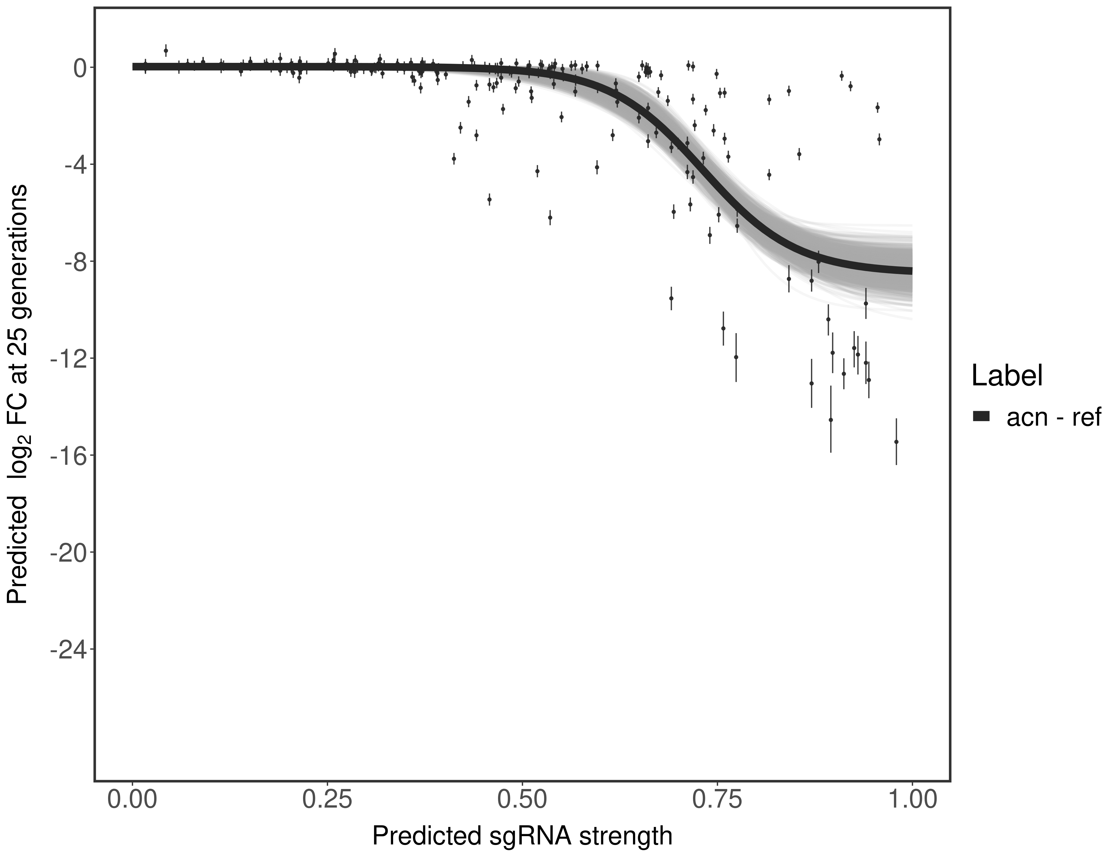 In order to quantify gene vulnerability, data were subsequently analyzed with a hierarchical model at the sgRNA level (two-line model) and gene level (Hill curve). The vulnerability quantification is shown below. [More information]