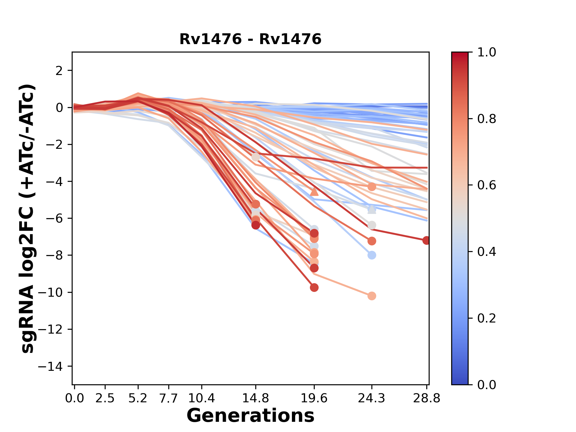 Here, we show sgRNA log2 fold-change values (L2FC) (plus versus minus ATc) over consecutive generations for sgRNAs targeting the gene you selected.