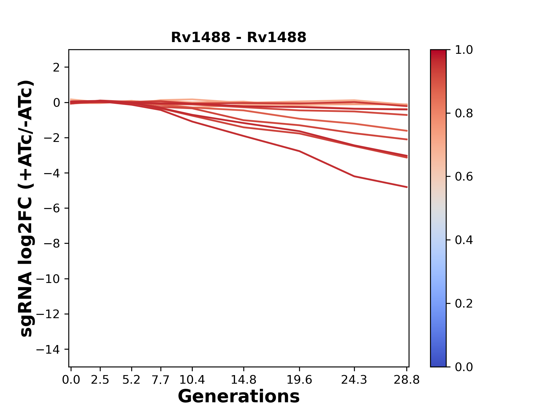 Here, we show sgRNA log2 fold-change values (L2FC) (plus versus minus ATc) over consecutive generations for sgRNAs targeting the gene you selected.