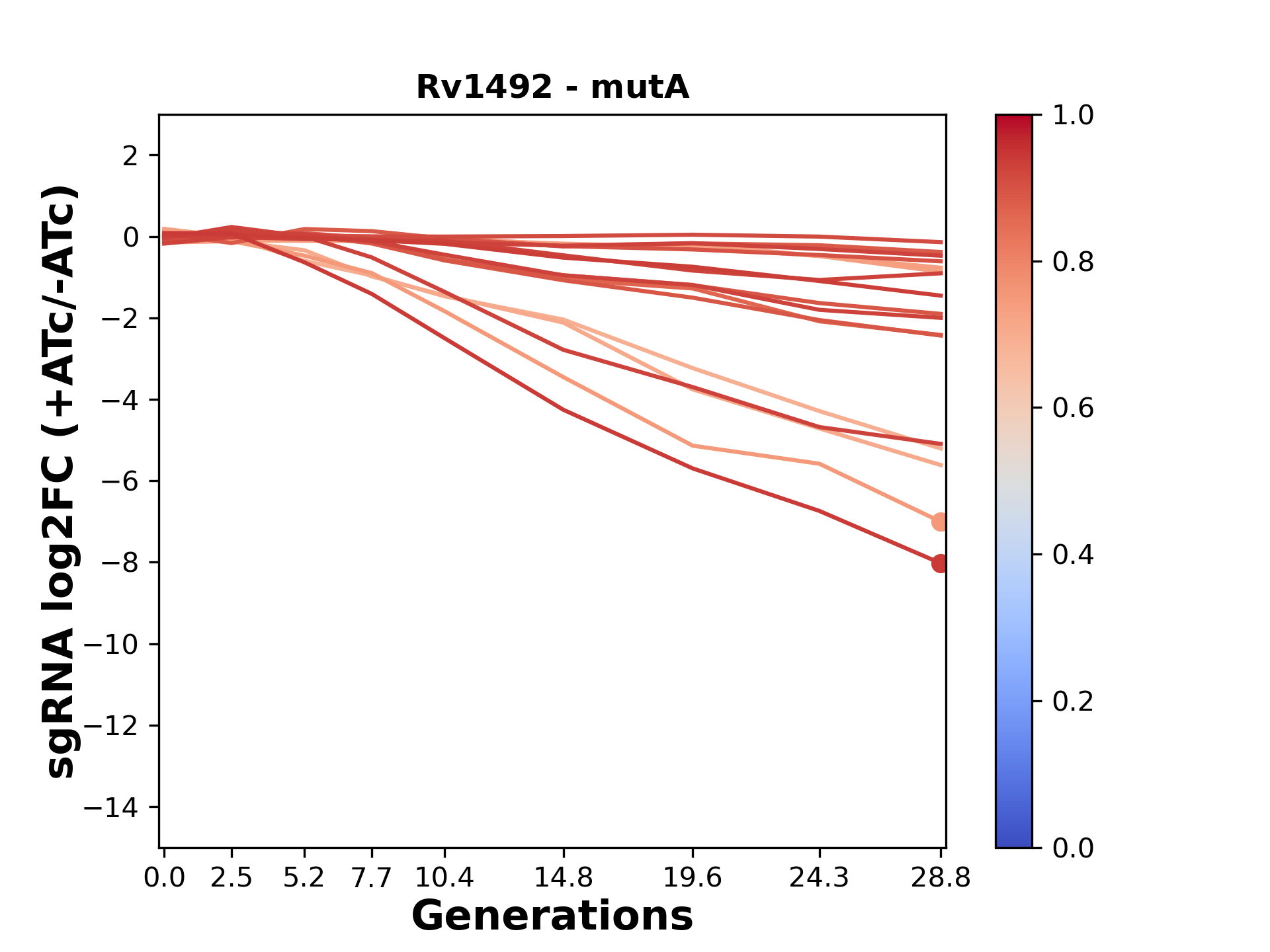 Here, we show sgRNA log2 fold-change values (L2FC) (plus versus minus ATc) over consecutive generations for sgRNAs targeting the gene you selected.