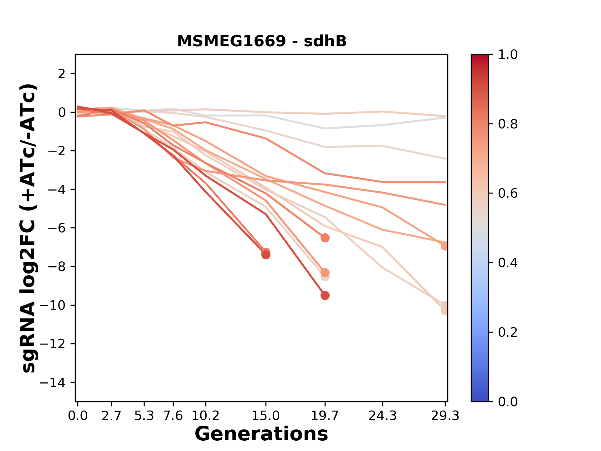 Here, we show sgRNA log2 fold-change values (L2FC) (plus versus minus ATc) over consecutive generations for sgRNAs targeting the gene you selected.