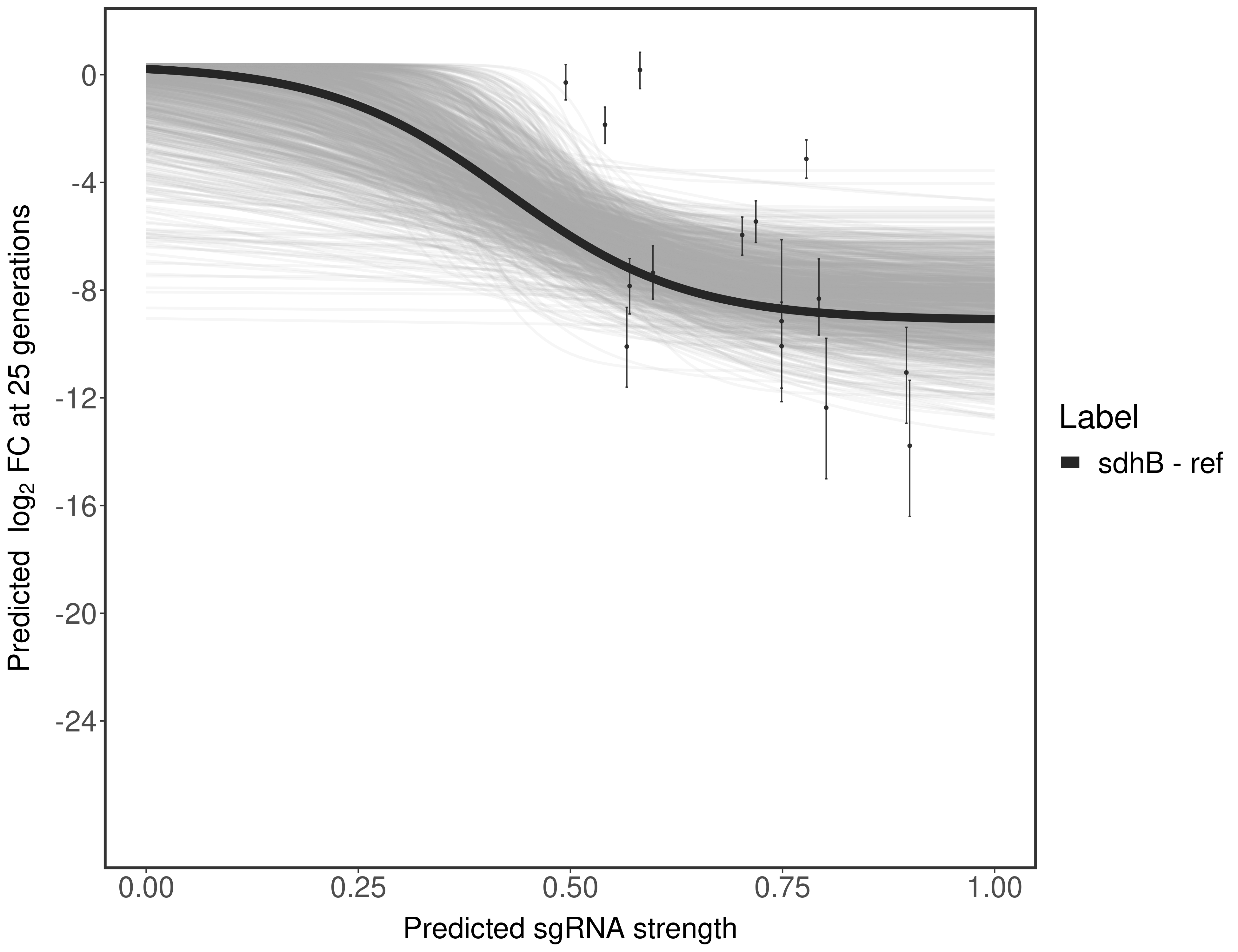 In order to quantify gene vulnerability, data were subsequently analyzed with a hierarchical model at the sgRNA level (two-line model) and gene level (Hill curve). The vulnerability quantification is shown below. [More information]