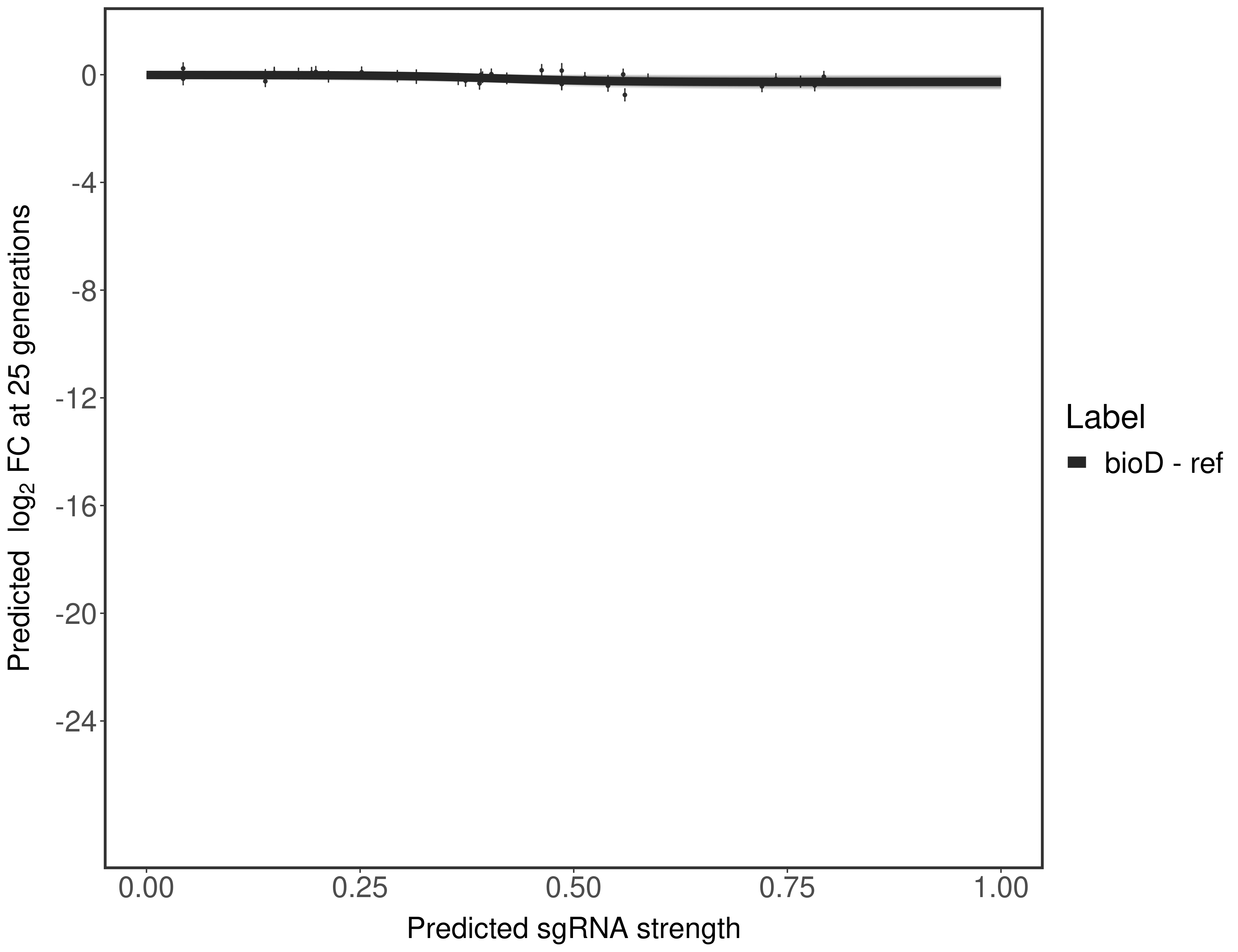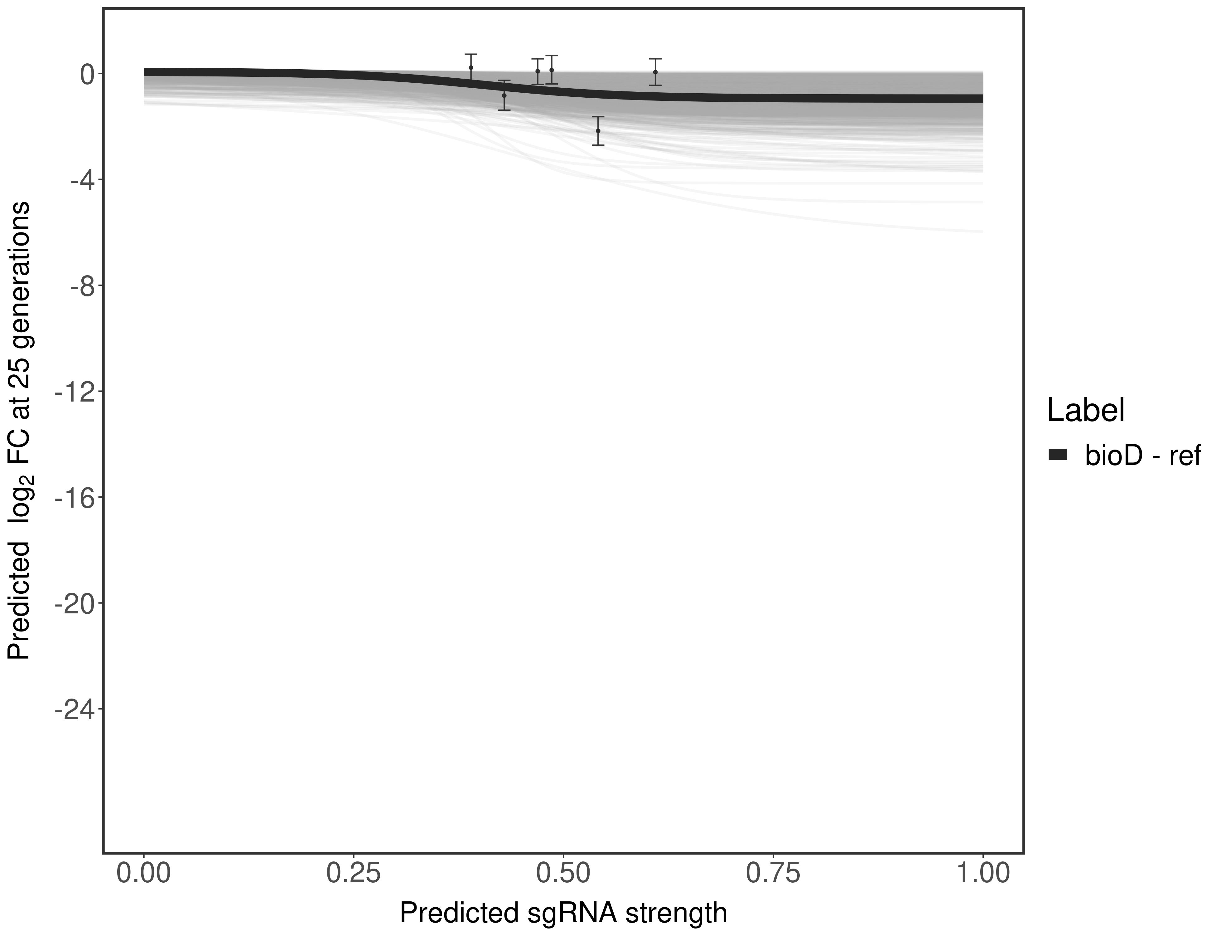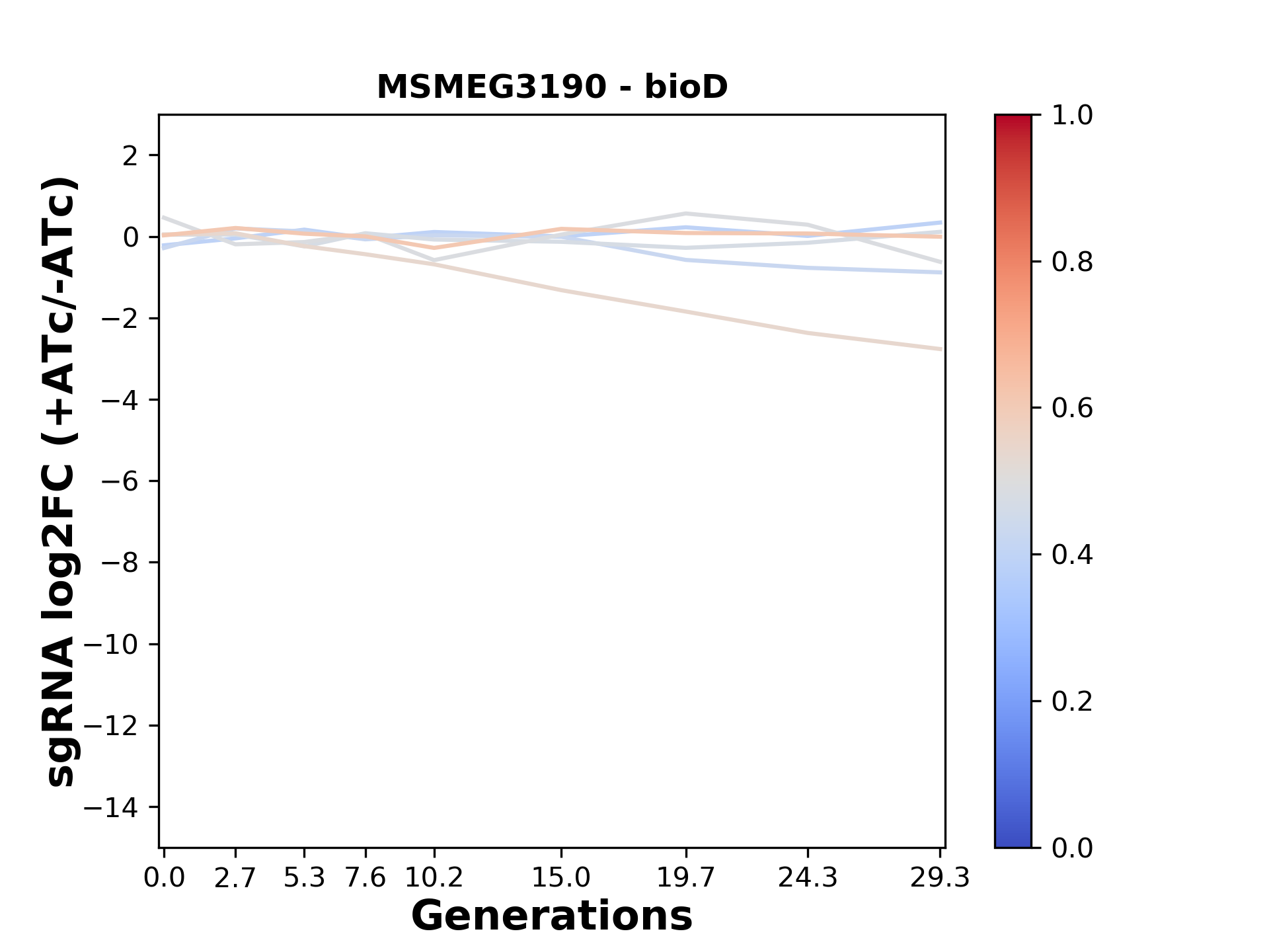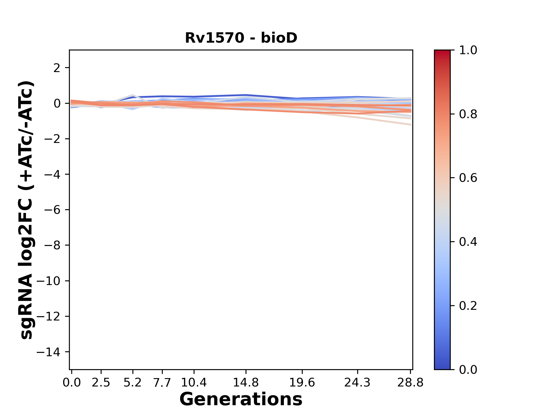 Experiment: We designed an M. tuberculosis CRISPRi library (RLC12) to target all annotated Mtb genes with single guide RNAs (sgRNAs) of varying predicted knockdown efficiencies. In parallel, we constructed a M. smegmatis CRISPRi library (RLC11) to target all annotated Msmeg genes, similar to the Mtb sgRNA library. RLC12 was transformed into M. tuberculosis H37Rv; RLC11 into M. smegmatis mc2-155. We passaged both CRISPRi libraries for nearly 30 generations in the presence or absence of the CRISPRi-inducer anhydrotetracycline (ATc). At the indicated timepoints, genomic DNA was harvested and the representation of individual sgRNAs was counted using Illumina sequencing. Here, we show sgRNA log2 fold-change values (L2FC) (plus versus minus ATc) over consecutive generations for sgRNAs targeting the gene you selected. sgRNAs are color-coded based on their predicted strength from blue (strength=0; weak) to red (strength=1; strong).