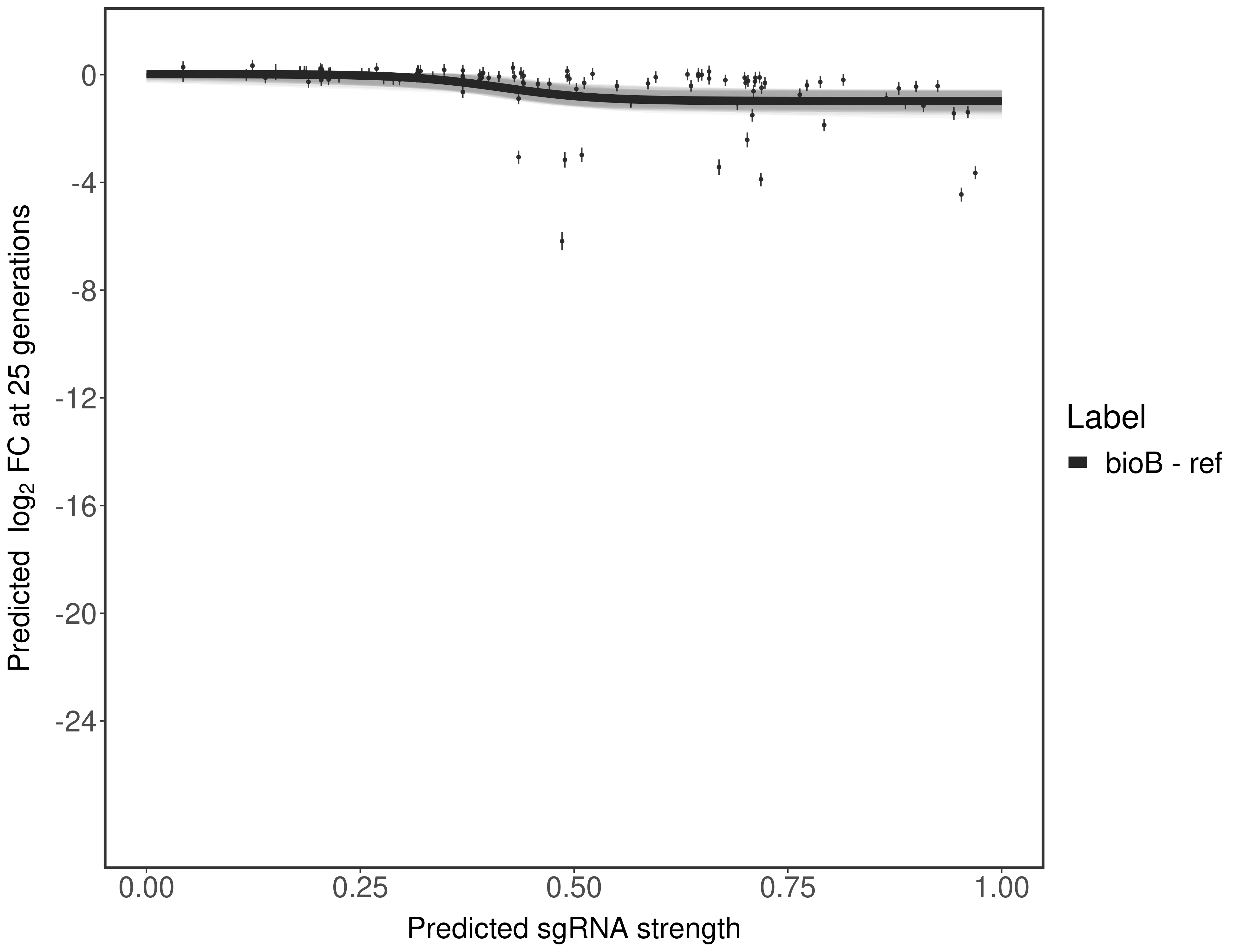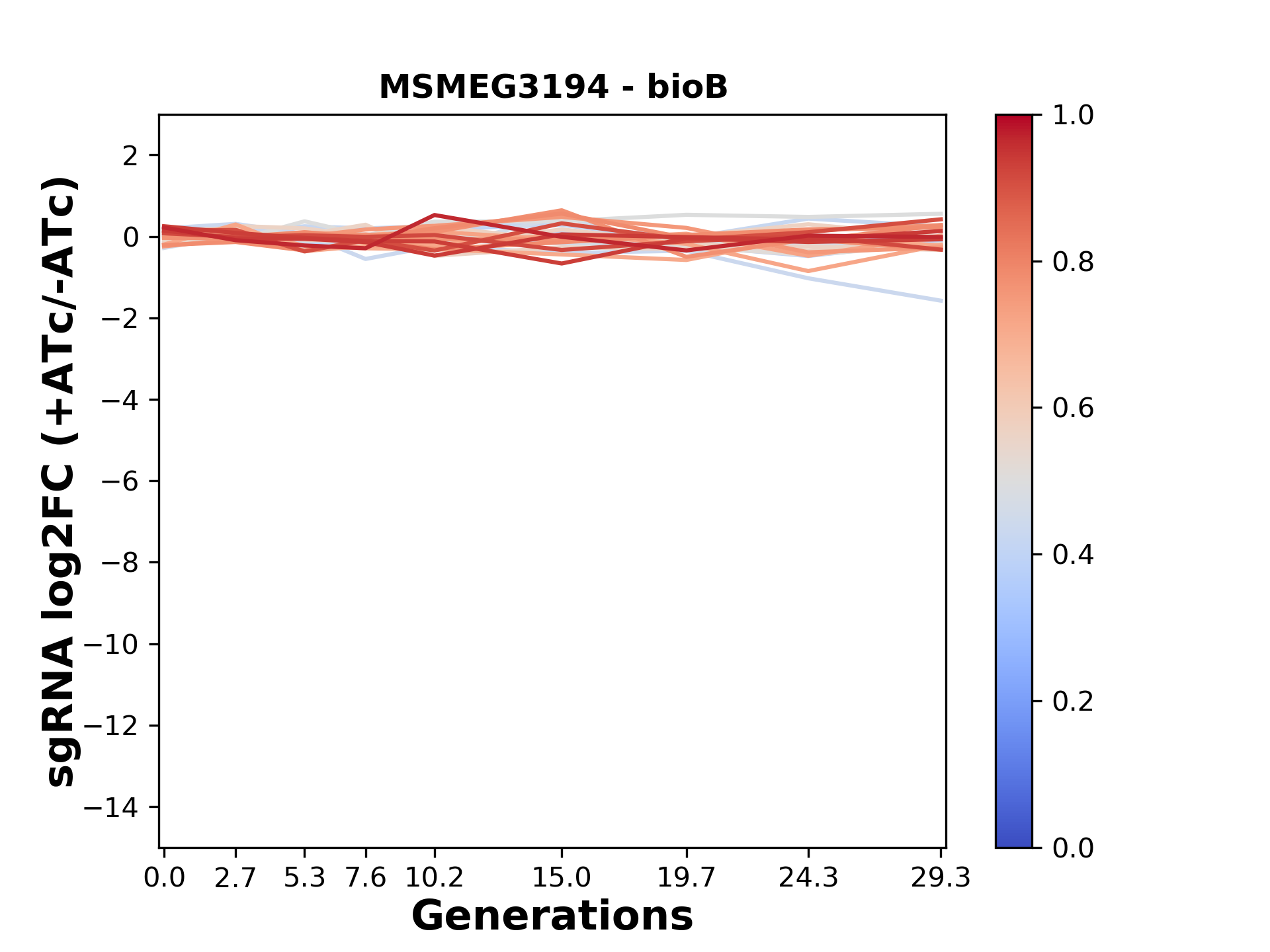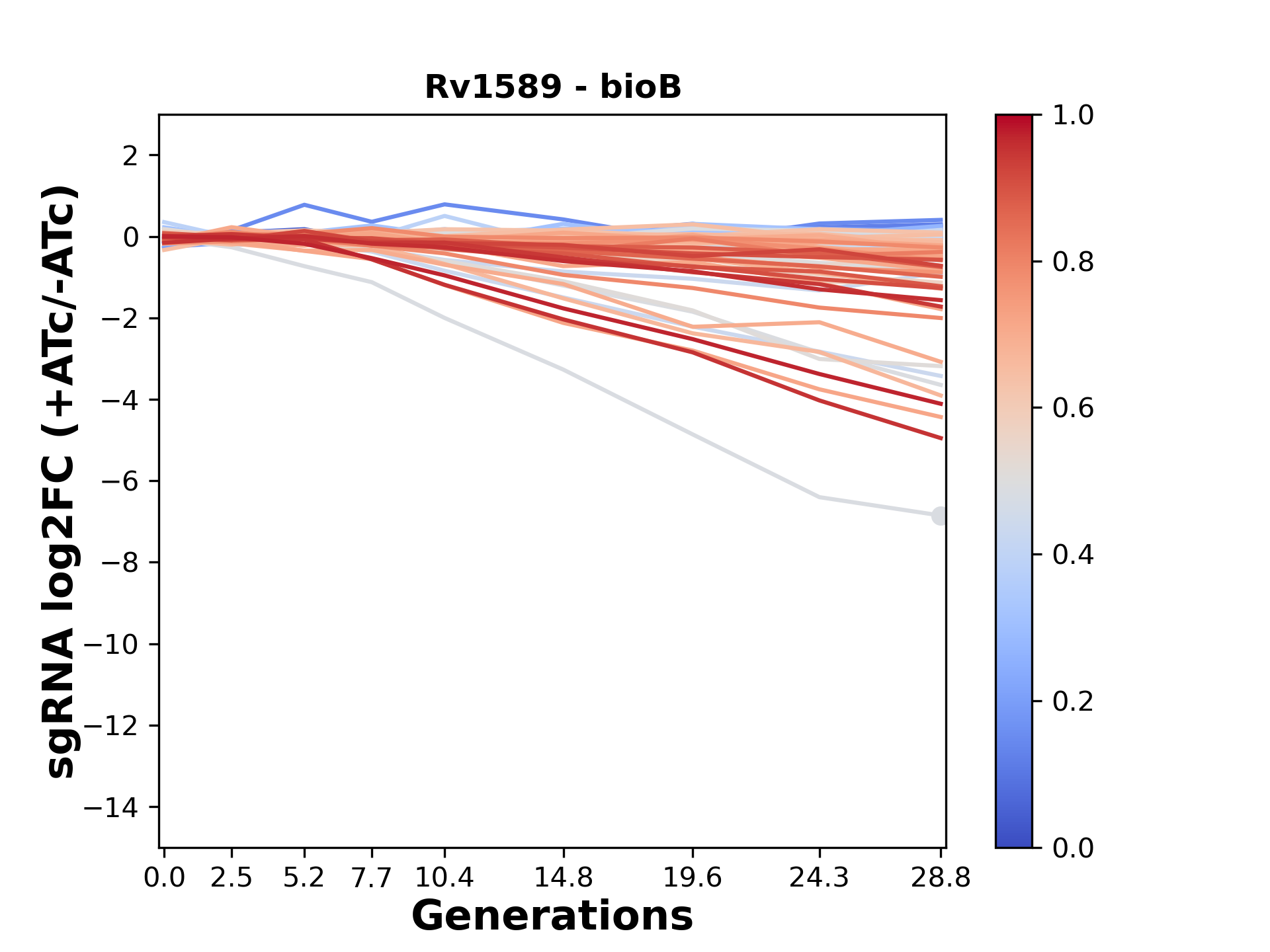 Experiment: We designed an M. tuberculosis CRISPRi library (RLC12) to target all annotated Mtb genes with single guide RNAs (sgRNAs) of varying predicted knockdown efficiencies. In parallel, we constructed a M. smegmatis CRISPRi library (RLC11) to target all annotated Msmeg genes, similar to the Mtb sgRNA library. RLC12 was transformed into M. tuberculosis H37Rv; RLC11 into M. smegmatis mc2-155. We passaged both CRISPRi libraries for nearly 30 generations in the presence or absence of the CRISPRi-inducer anhydrotetracycline (ATc). At the indicated timepoints, genomic DNA was harvested and the representation of individual sgRNAs was counted using Illumina sequencing. Here, we show sgRNA log2 fold-change values (L2FC) (plus versus minus ATc) over consecutive generations for sgRNAs targeting the gene you selected. sgRNAs are color-coded based on their predicted strength from blue (strength=0; weak) to red (strength=1; strong).