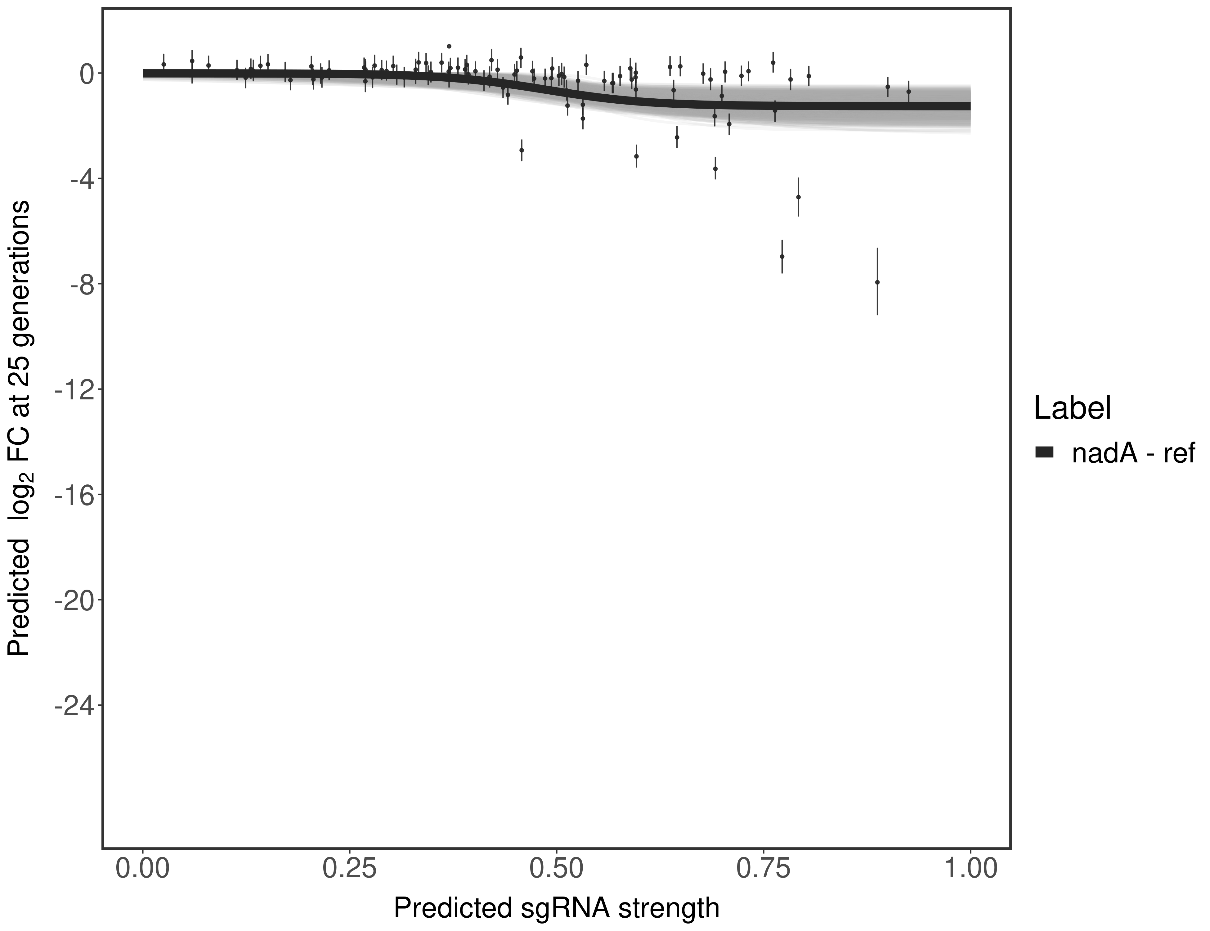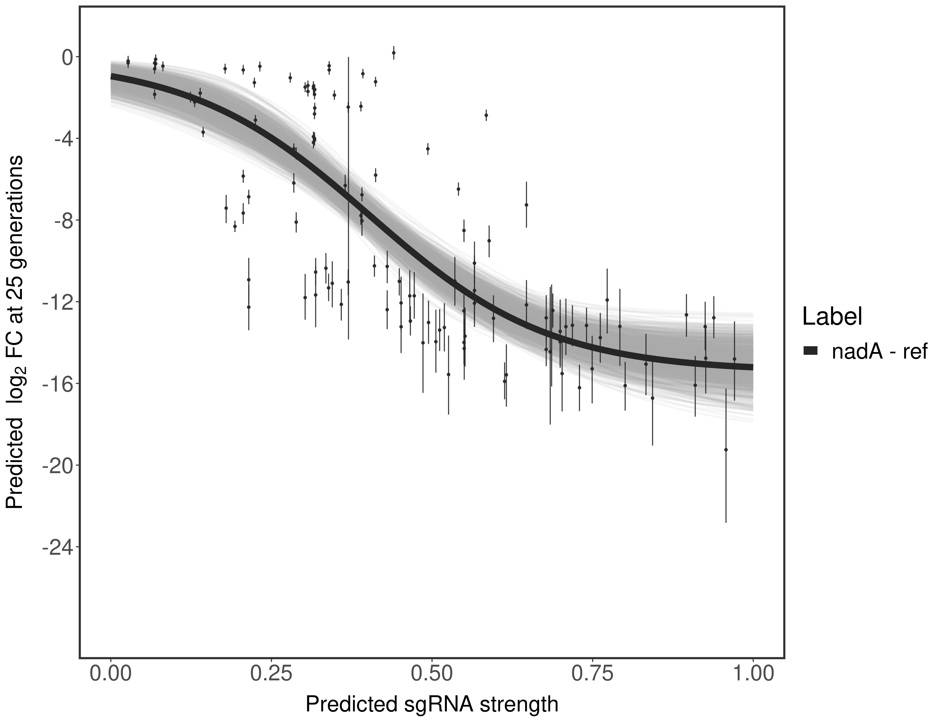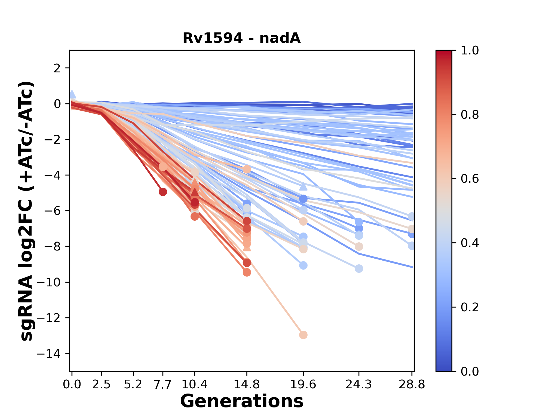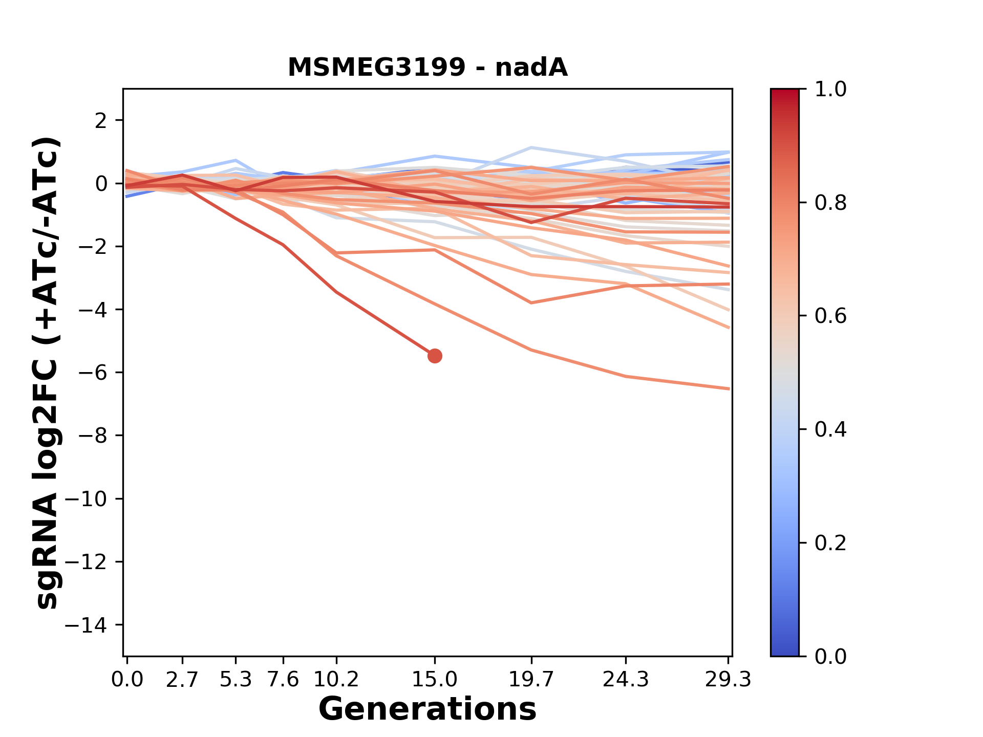 Here, we show sgRNA log2 fold-change values (L2FC) (plus versus minus ATc) over consecutive generations for sgRNAs targeting the gene you selected.