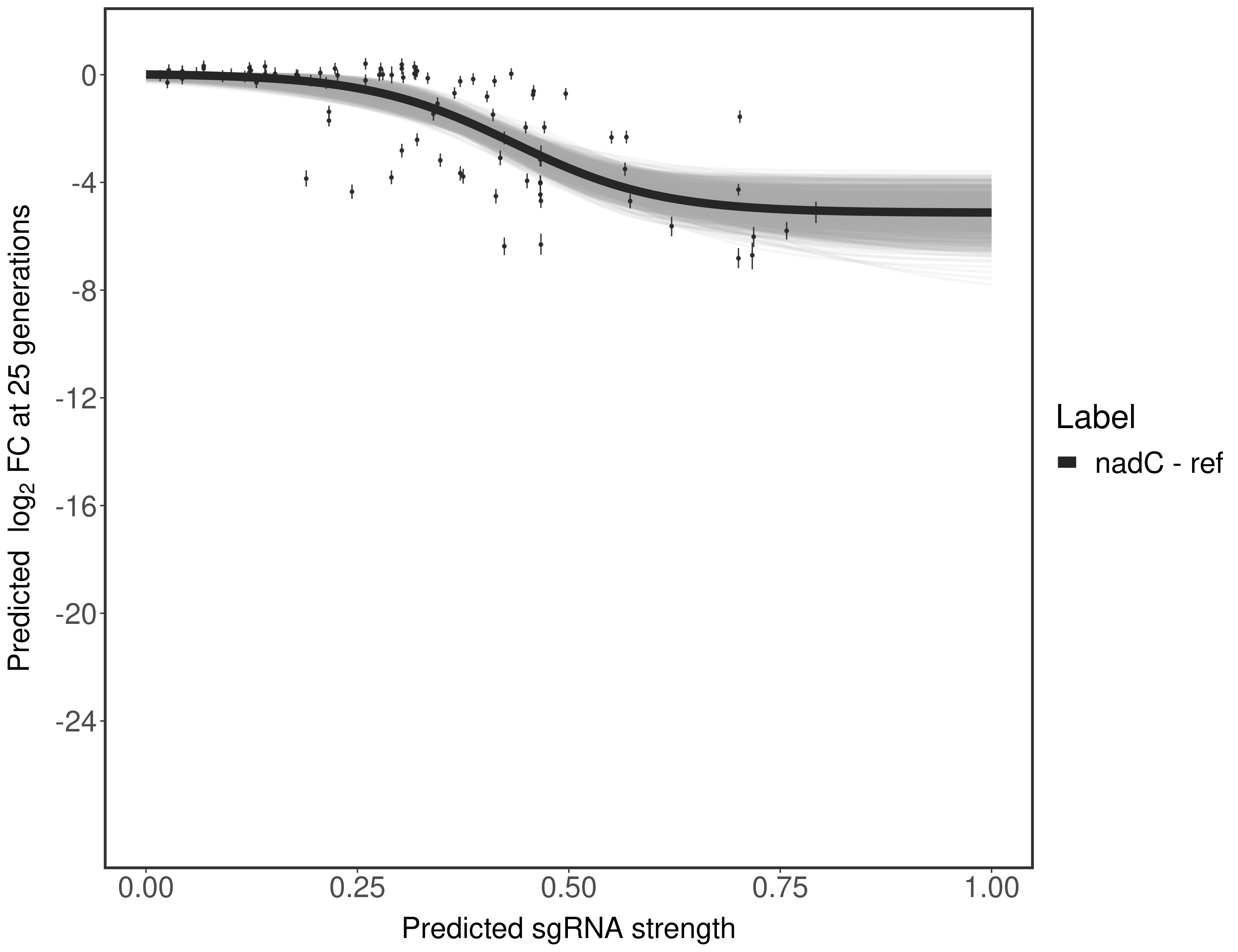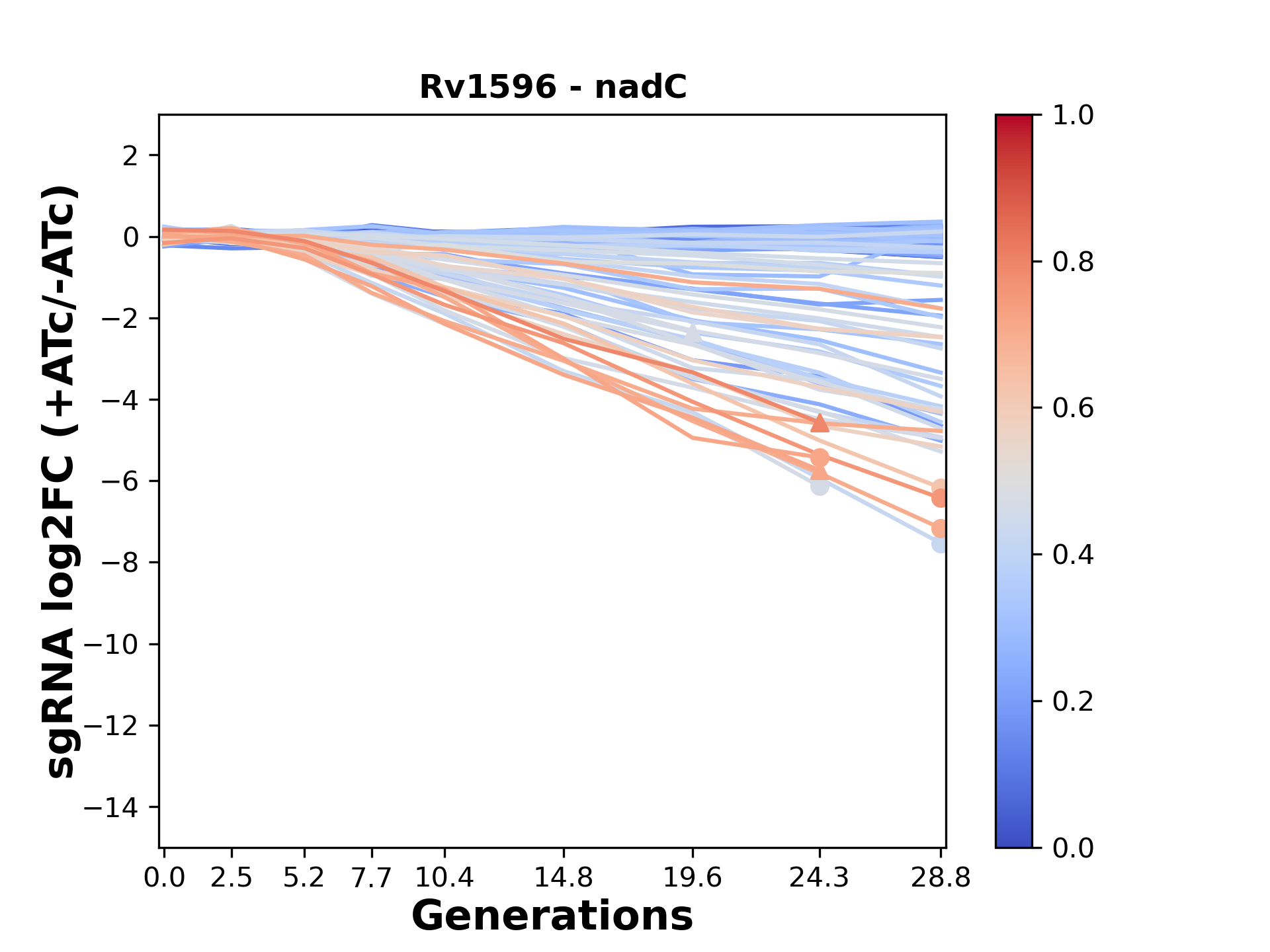 Experiment: We designed an M. tuberculosis CRISPRi library (RLC12) to target all annotated Mtb genes with single guide RNAs (sgRNAs) of varying predicted knockdown efficiencies. In parallel, we constructed a M. smegmatis CRISPRi library (RLC11) to target all annotated Msmeg genes, similar to the Mtb sgRNA library. RLC12 was transformed into M. tuberculosis H37Rv; RLC11 into M. smegmatis mc2-155. We passaged both CRISPRi libraries for nearly 30 generations in the presence or absence of the CRISPRi-inducer anhydrotetracycline (ATc). At the indicated timepoints, genomic DNA was harvested and the representation of individual sgRNAs was counted using Illumina sequencing. Here, we show sgRNA log2 fold-change values (L2FC) (plus versus minus ATc) over consecutive generations for sgRNAs targeting the gene you selected. sgRNAs are color-coded based on their predicted strength from blue (strength=0; weak) to red (strength=1; strong).