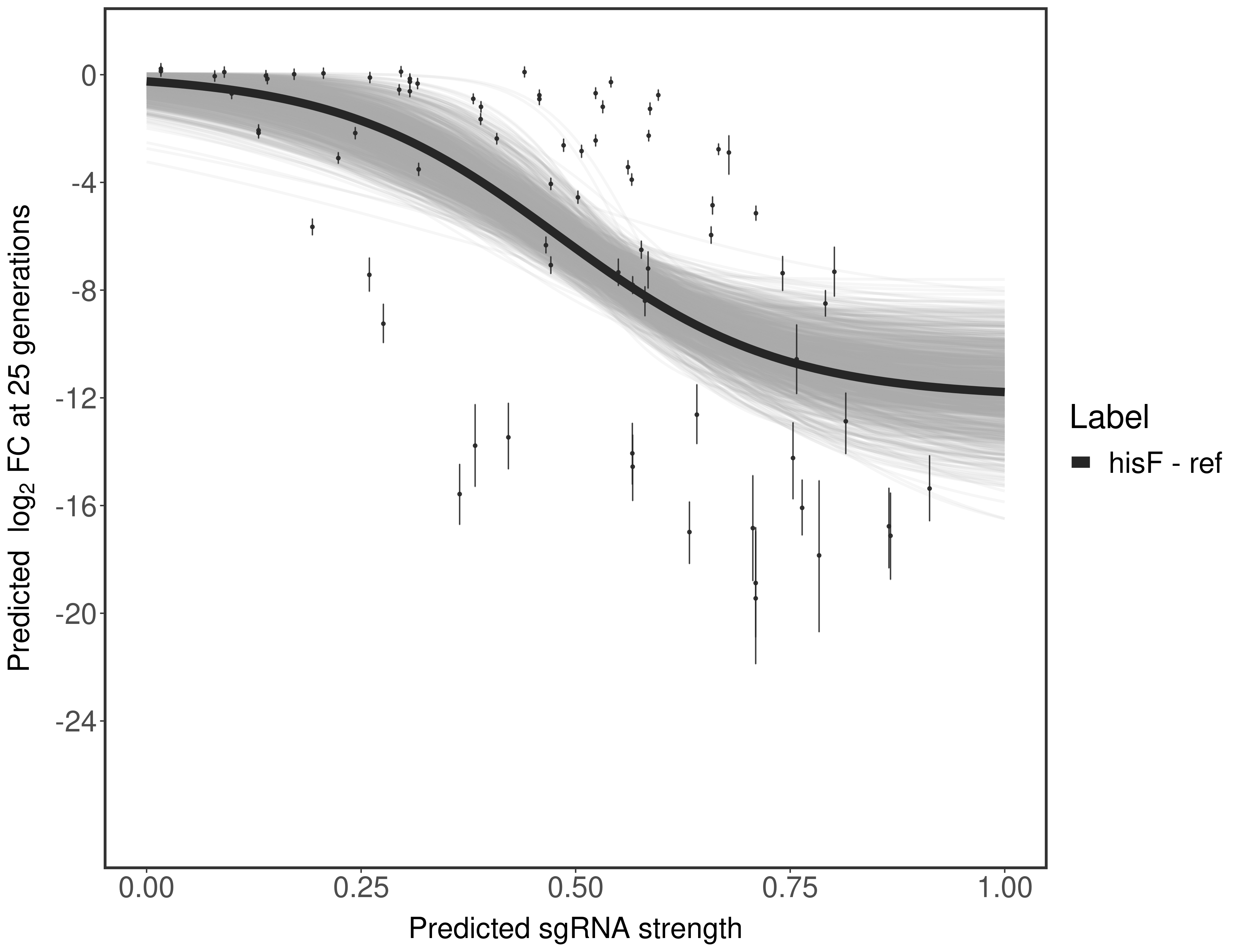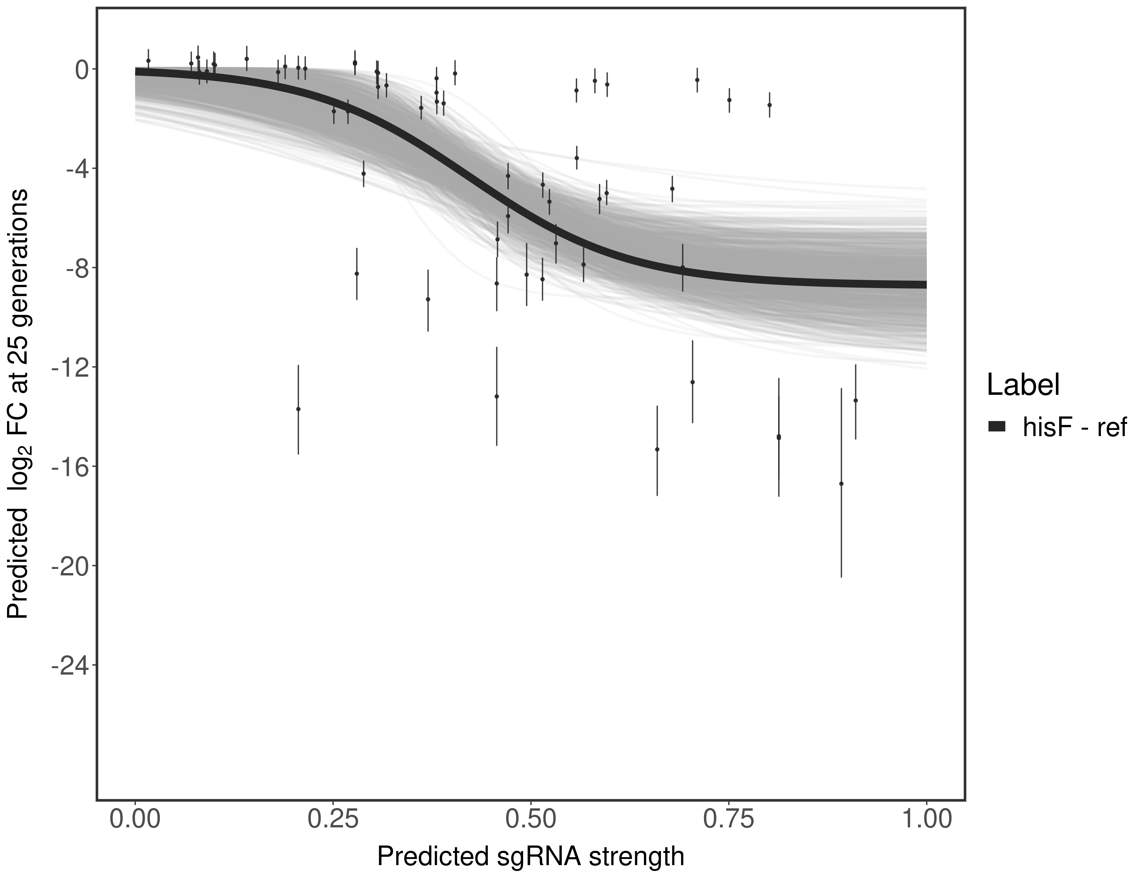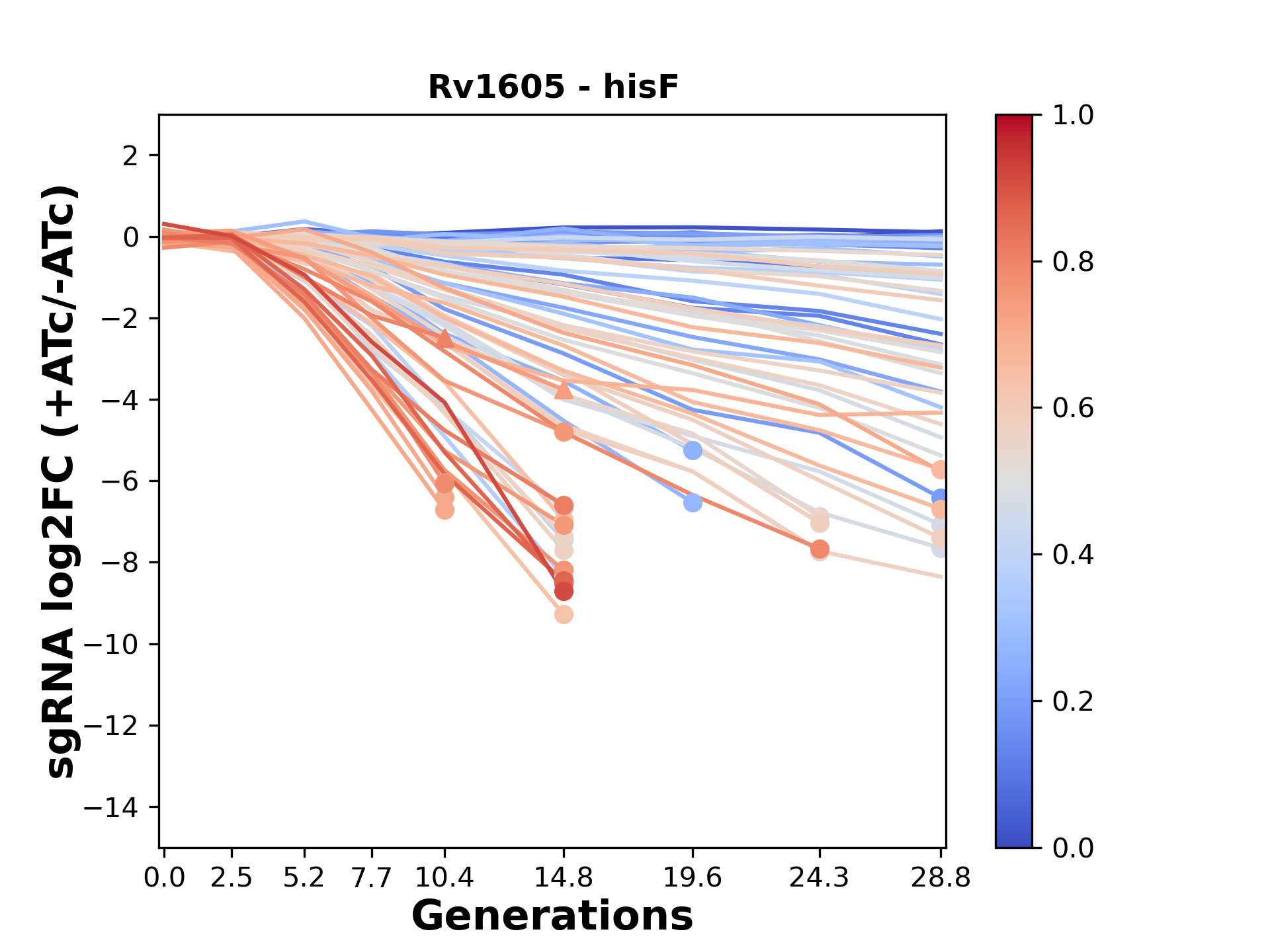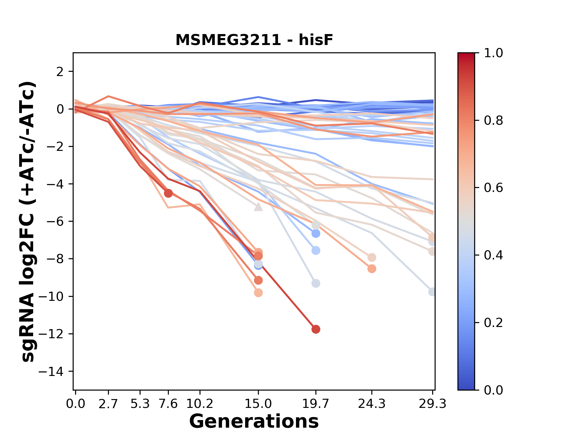 Experiment: We designed an M. tuberculosis CRISPRi library (RLC12) to target all annotated Mtb genes with single guide RNAs (sgRNAs) of varying predicted knockdown efficiencies. In parallel, we constructed a M. smegmatis CRISPRi library (RLC11) to target all annotated Msmeg genes, similar to the Mtb sgRNA library. RLC12 was transformed into M. tuberculosis H37Rv; RLC11 into M. smegmatis mc2-155. We passaged both CRISPRi libraries for nearly 30 generations in the presence or absence of the CRISPRi-inducer anhydrotetracycline (ATc). At the indicated timepoints, genomic DNA was harvested and the representation of individual sgRNAs was counted using Illumina sequencing. Here, we show sgRNA log2 fold-change values (L2FC) (plus versus minus ATc) over consecutive generations for sgRNAs targeting the gene you selected. sgRNAs are color-coded based on their predicted strength from blue (strength=0; weak) to red (strength=1; strong).