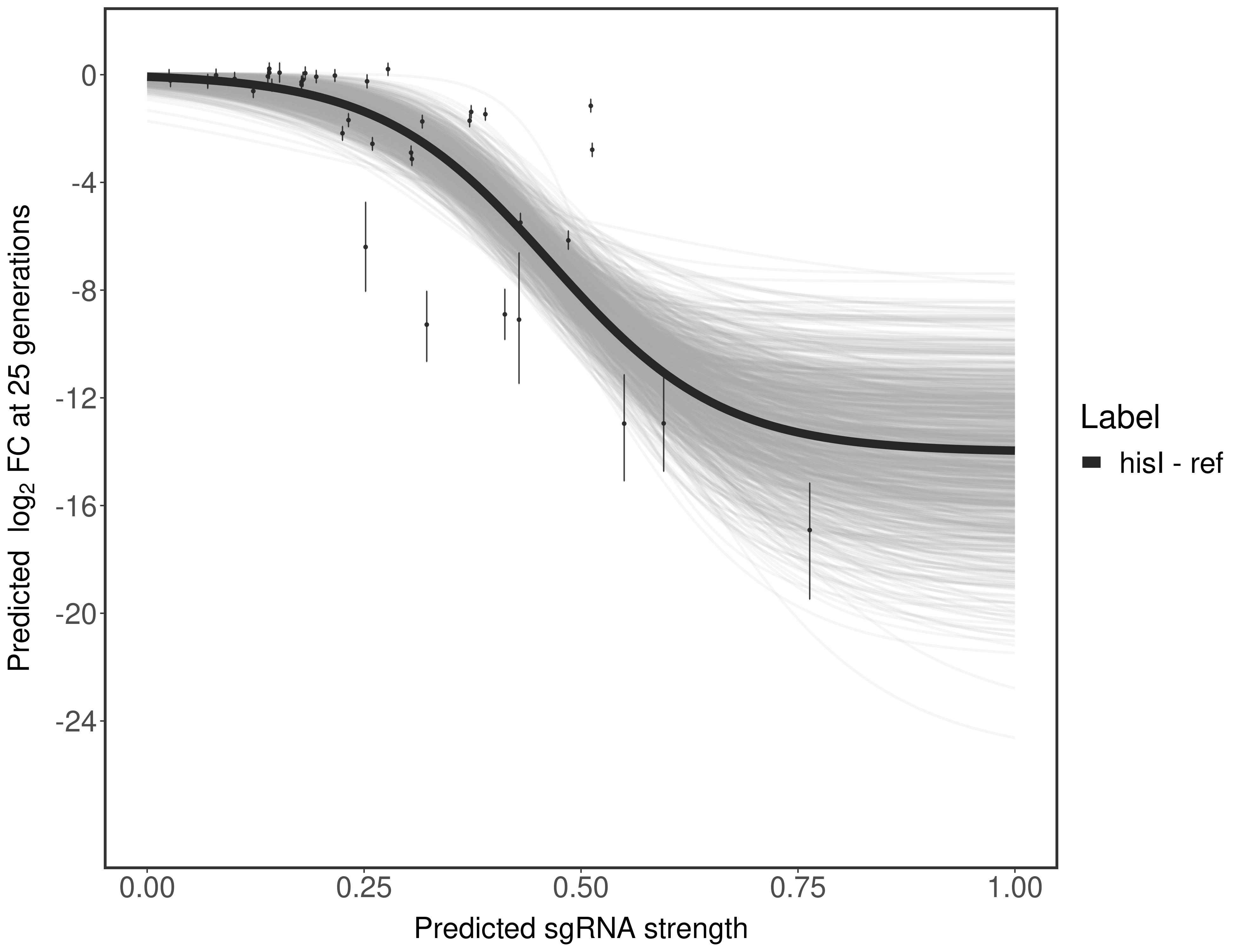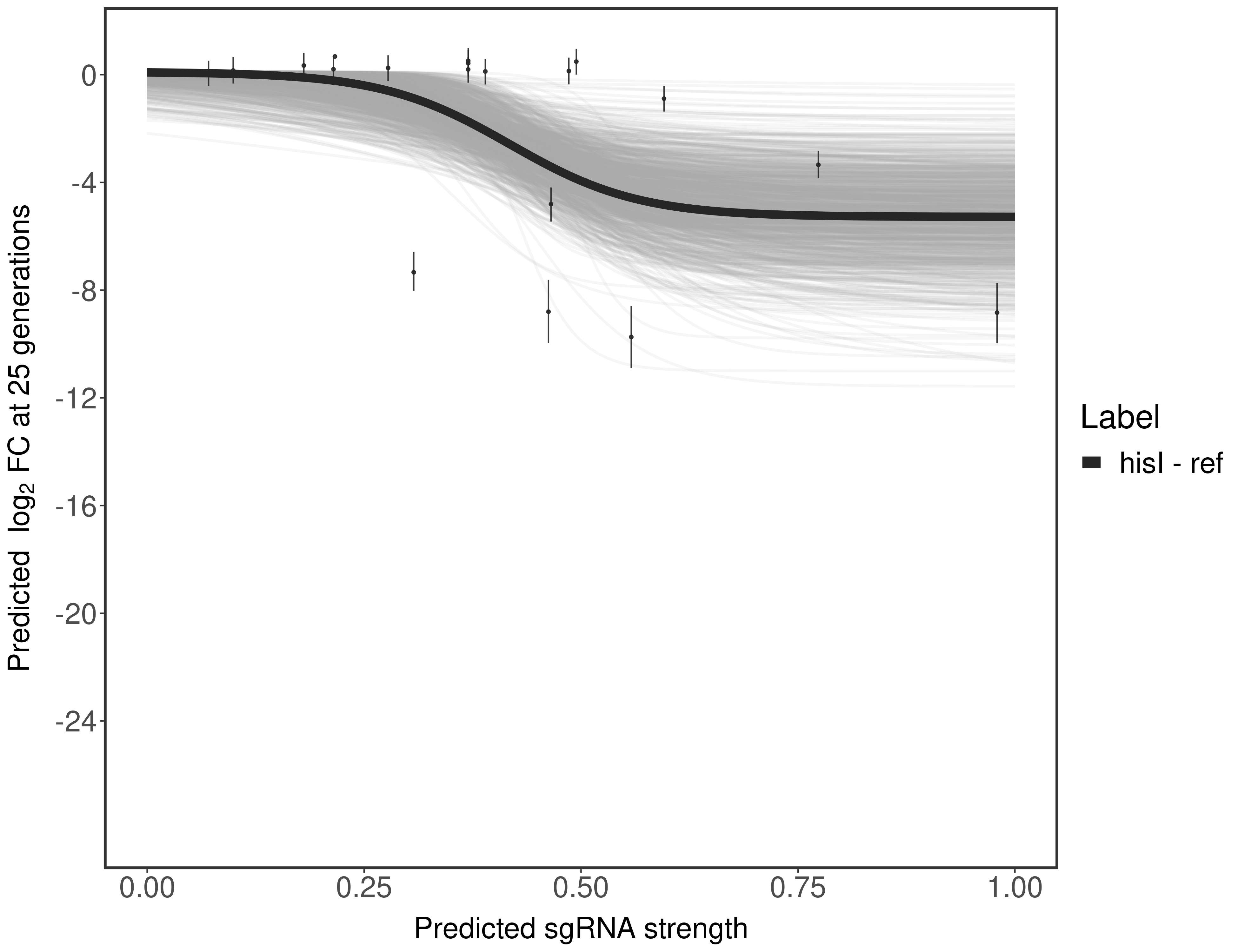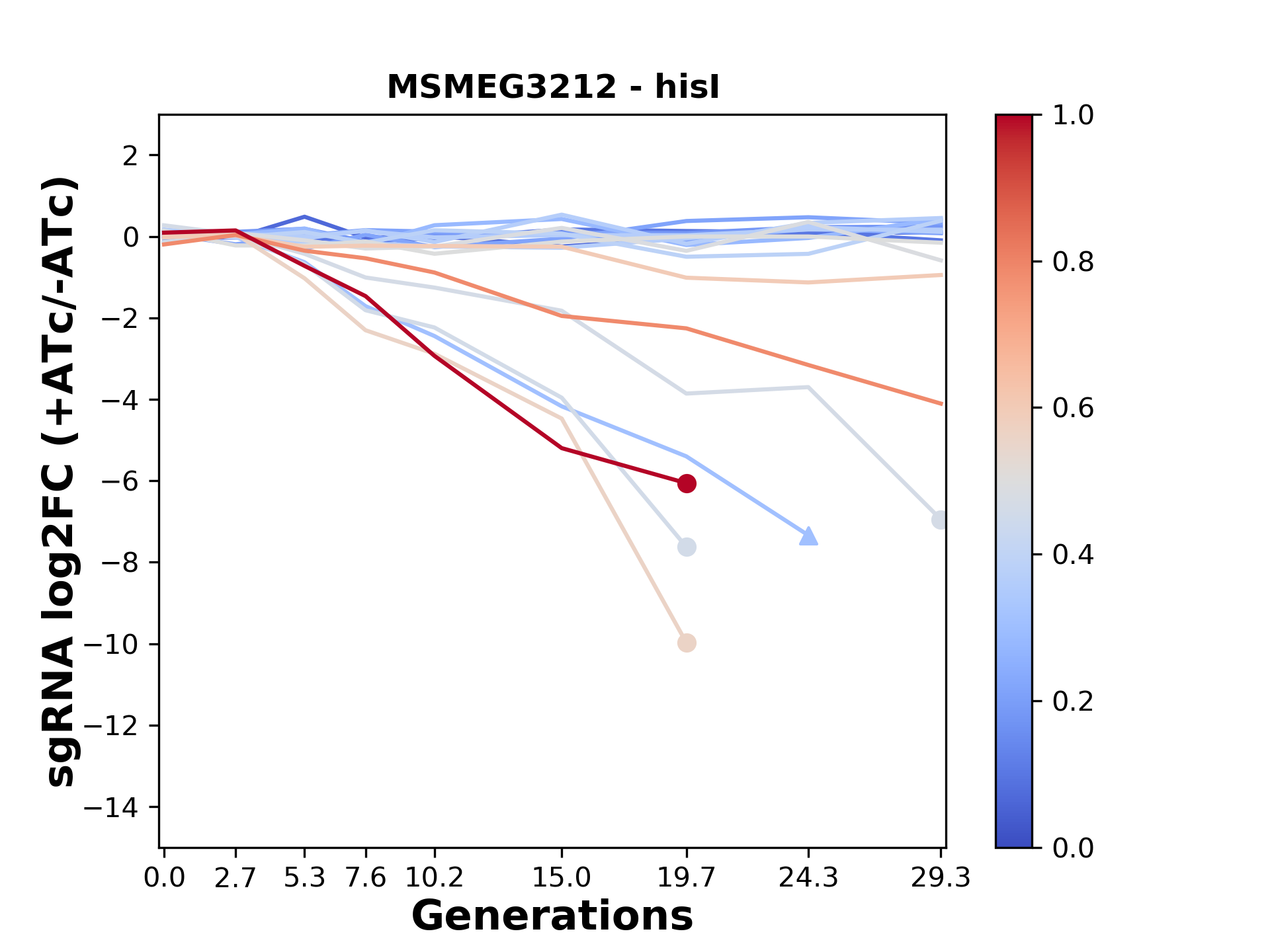 Here, we show sgRNA log2 fold-change values (L2FC) (plus versus minus ATc) over consecutive generations for sgRNAs targeting the gene you selected.