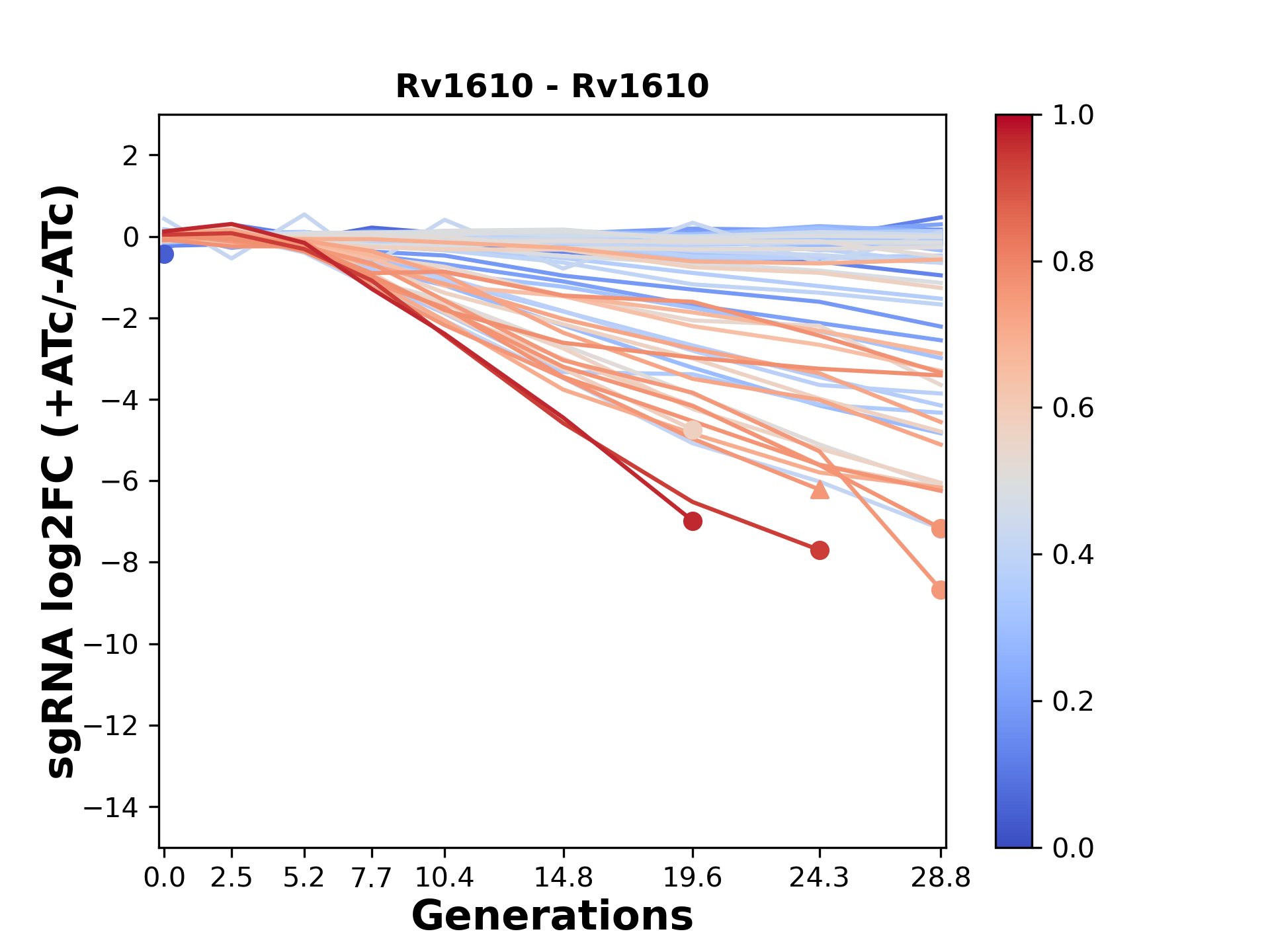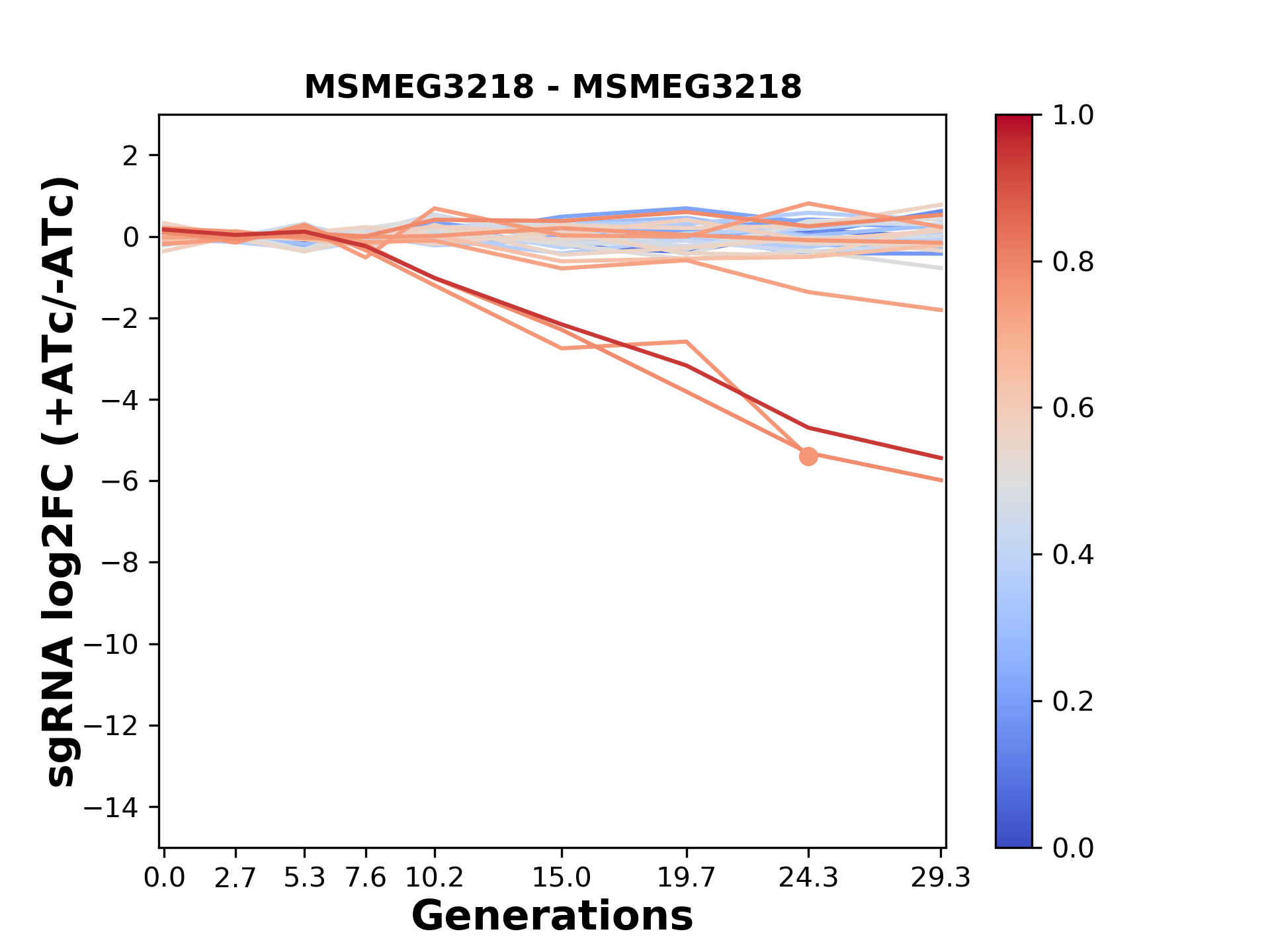 Here, we show sgRNA log2 fold-change values (L2FC) (plus versus minus ATc) over consecutive generations for sgRNAs targeting the gene you selected.
