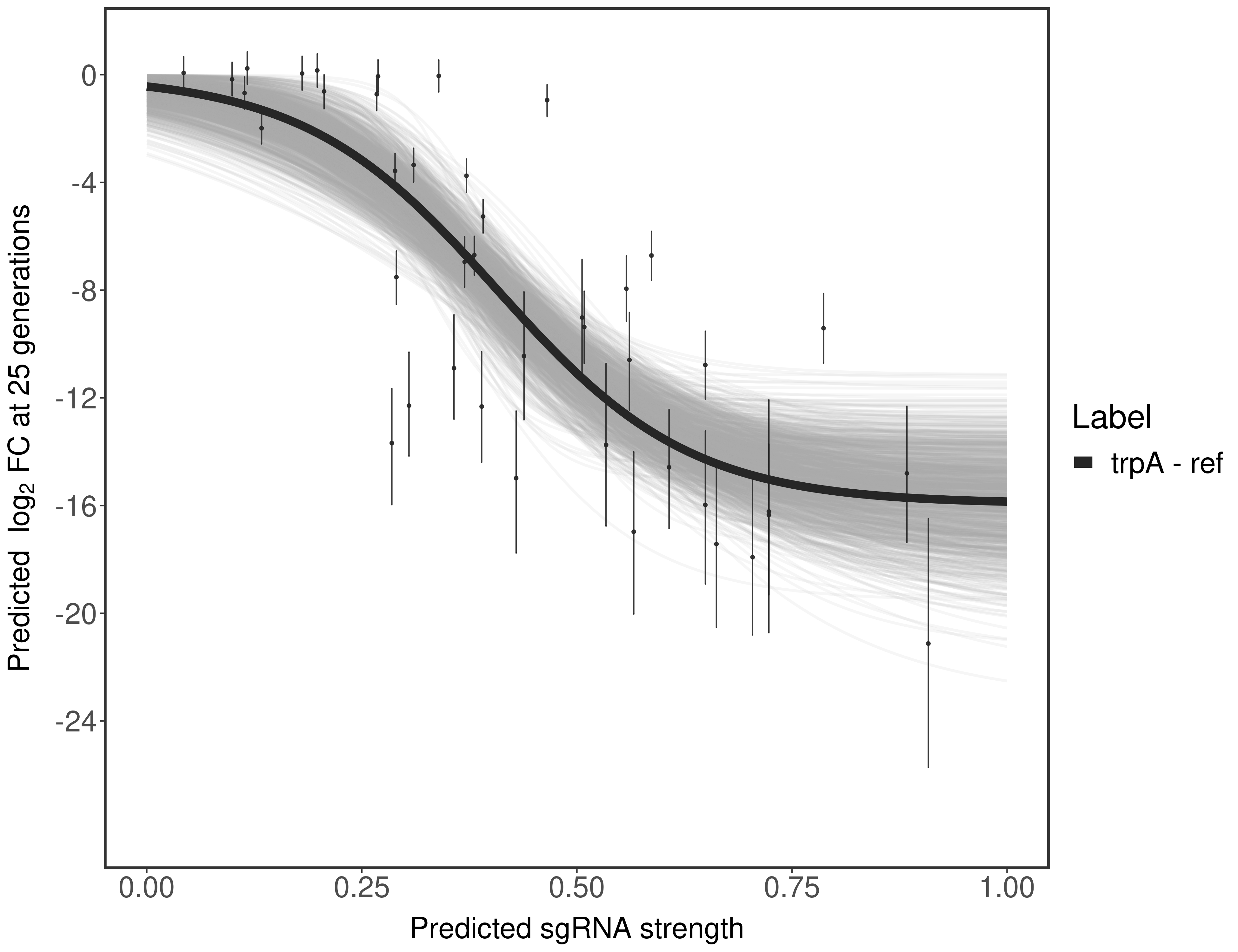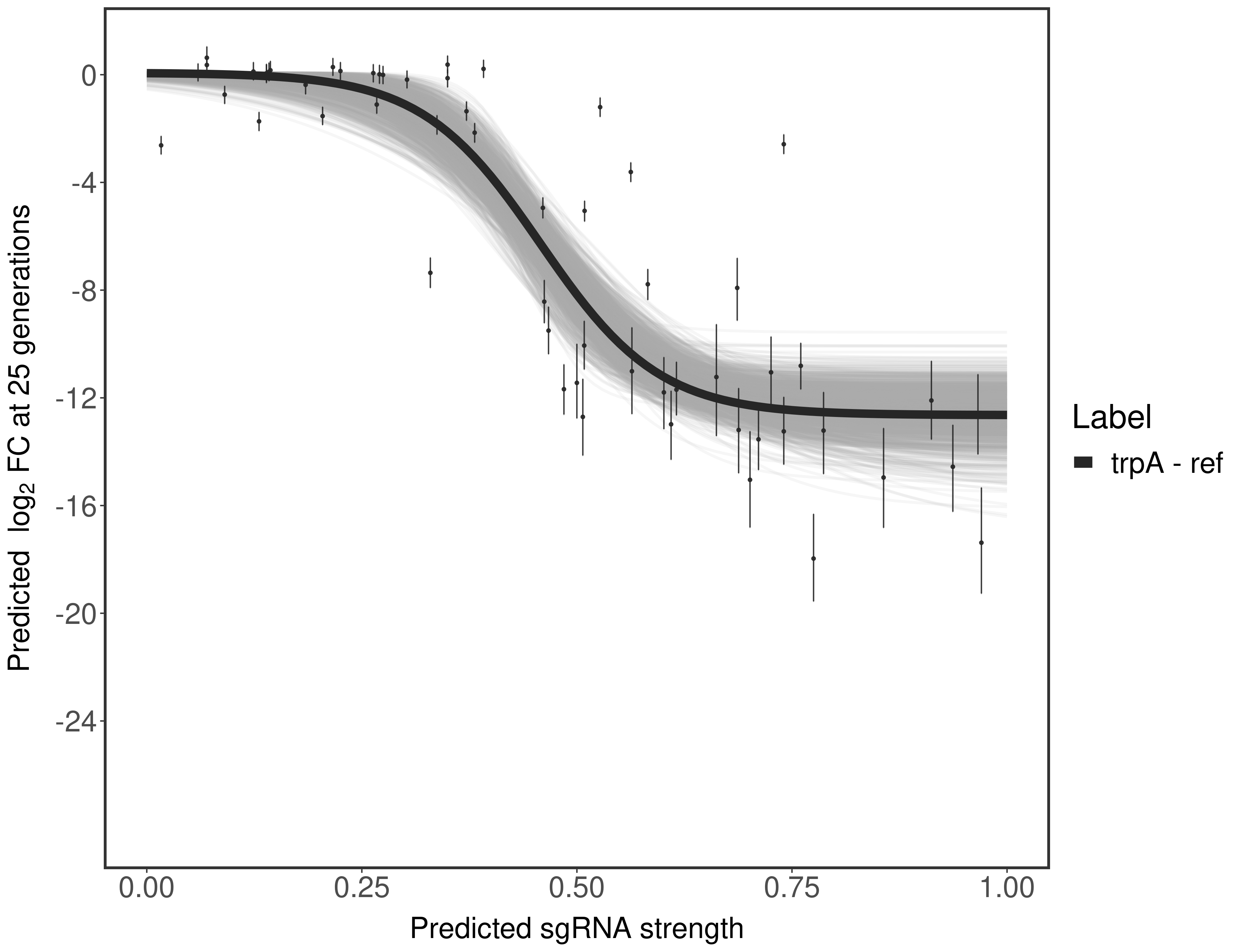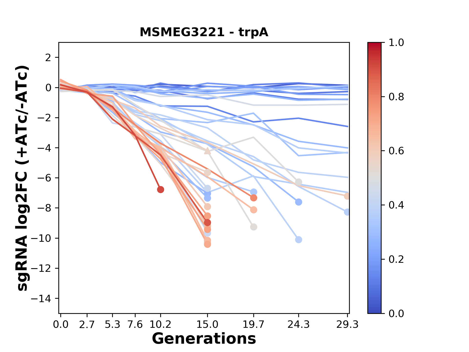 Here, we show sgRNA log2 fold-change values (L2FC) (plus versus minus ATc) over consecutive generations for sgRNAs targeting the gene you selected.