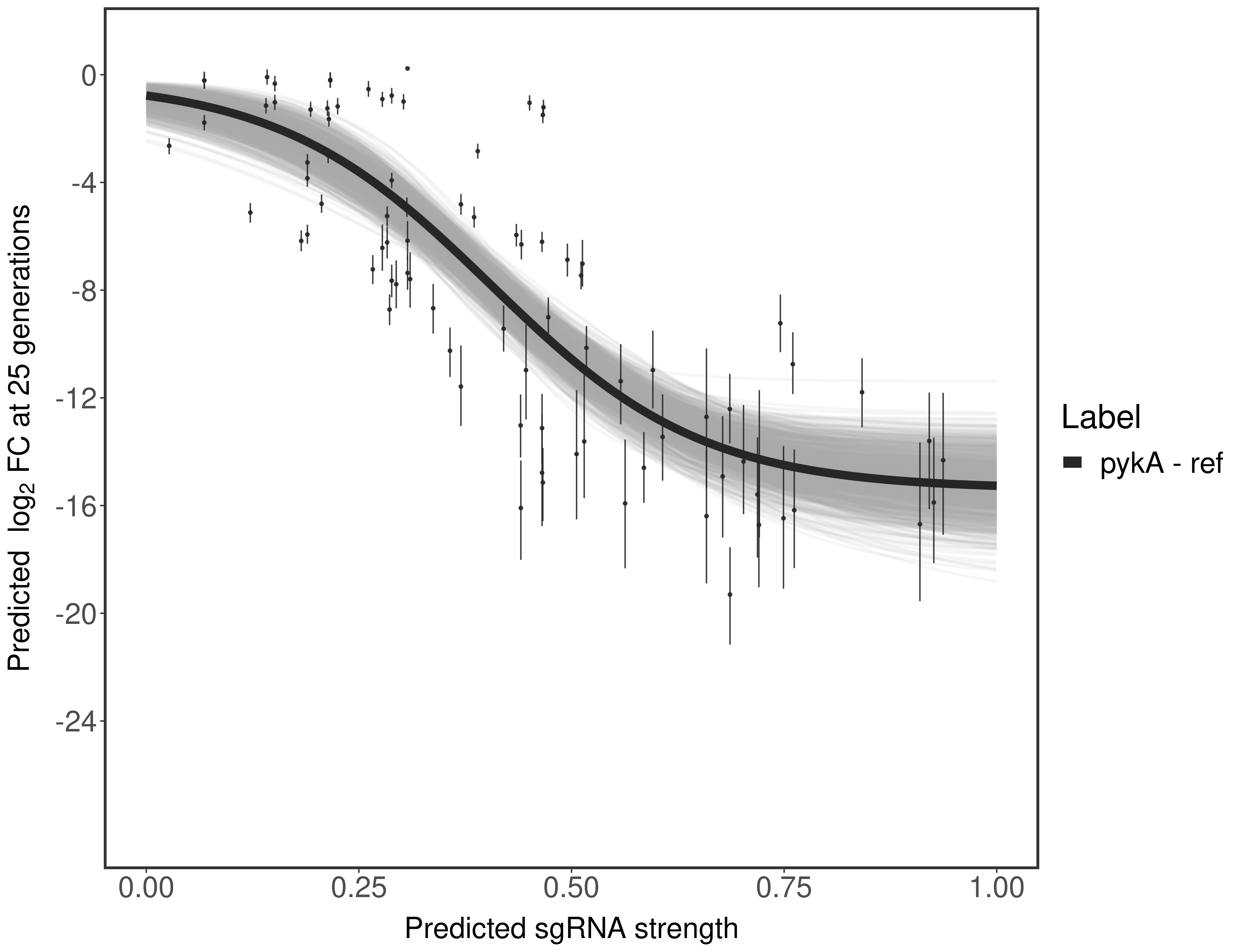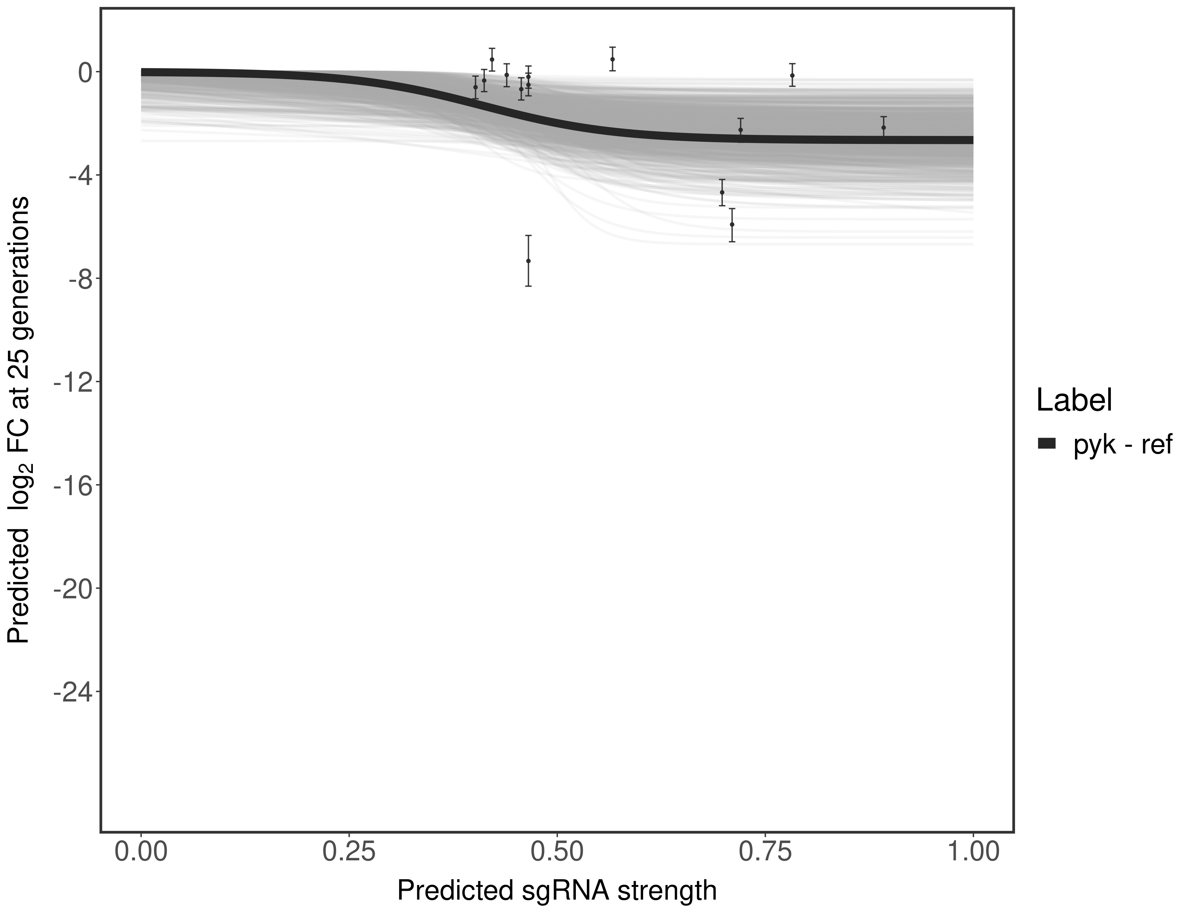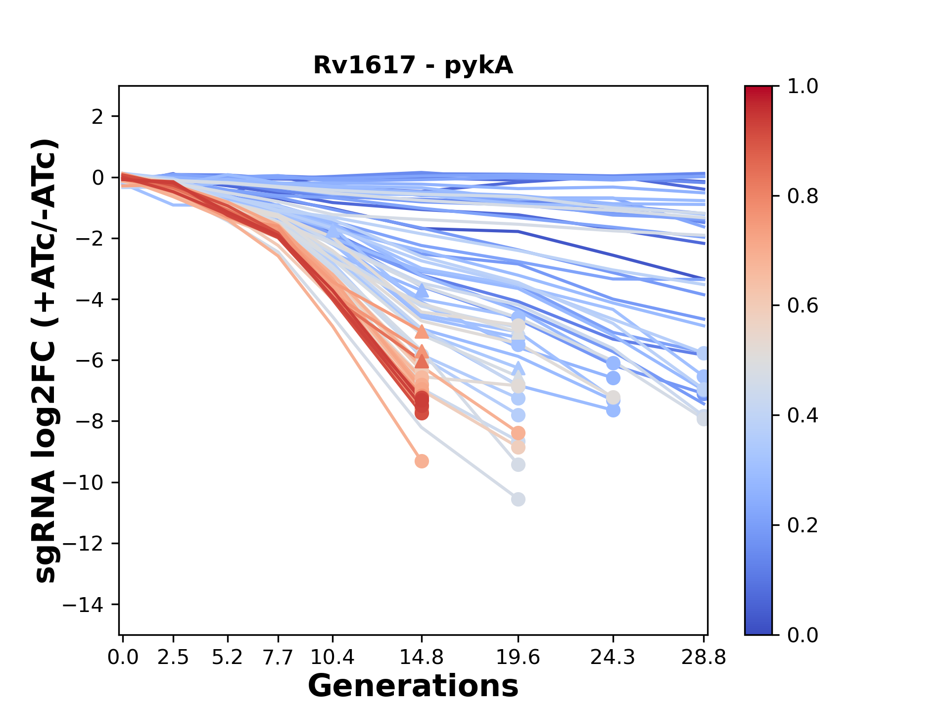 Here, we show sgRNA log2 fold-change values (L2FC) (plus versus minus ATc) over consecutive generations for sgRNAs targeting the gene you selected.