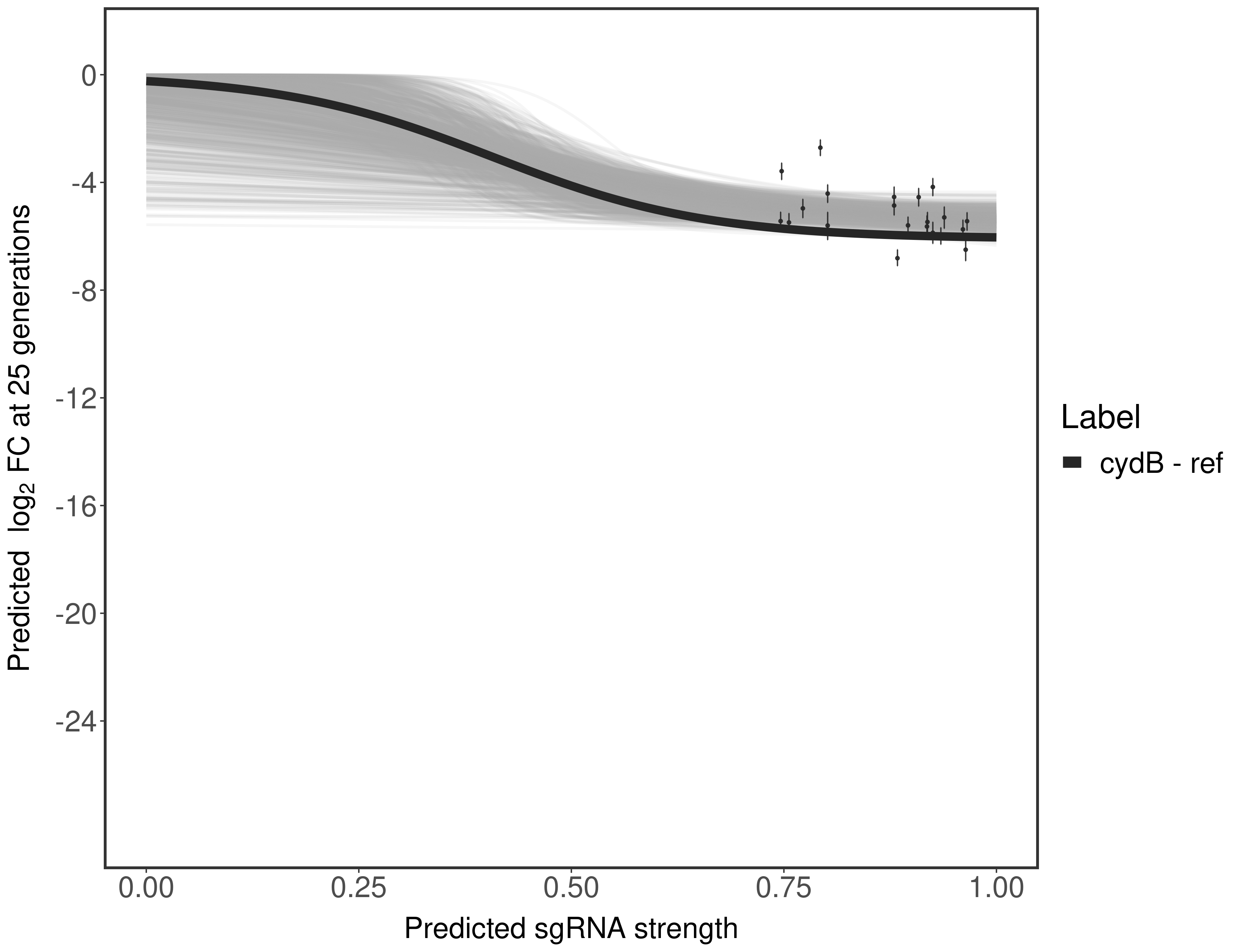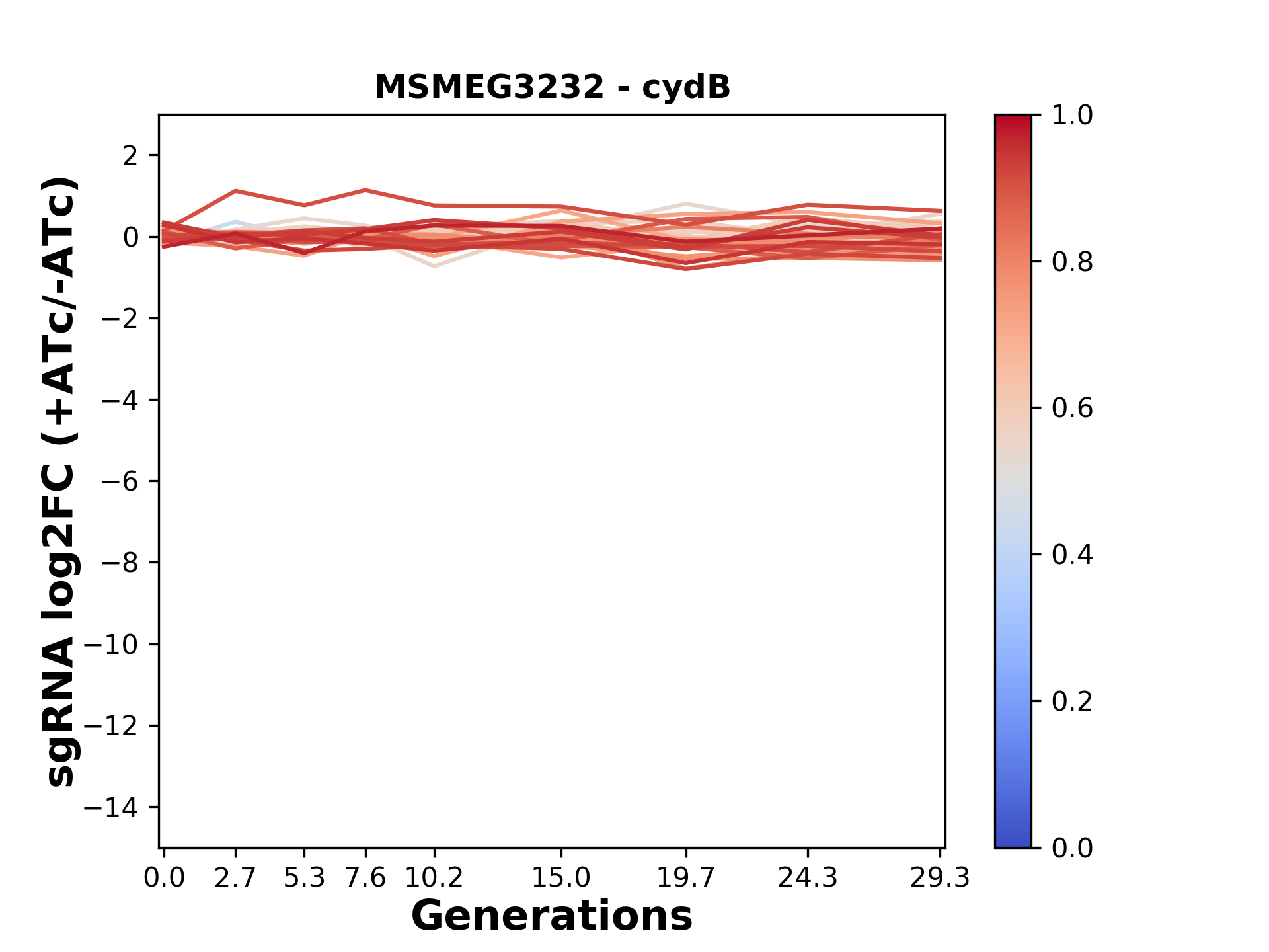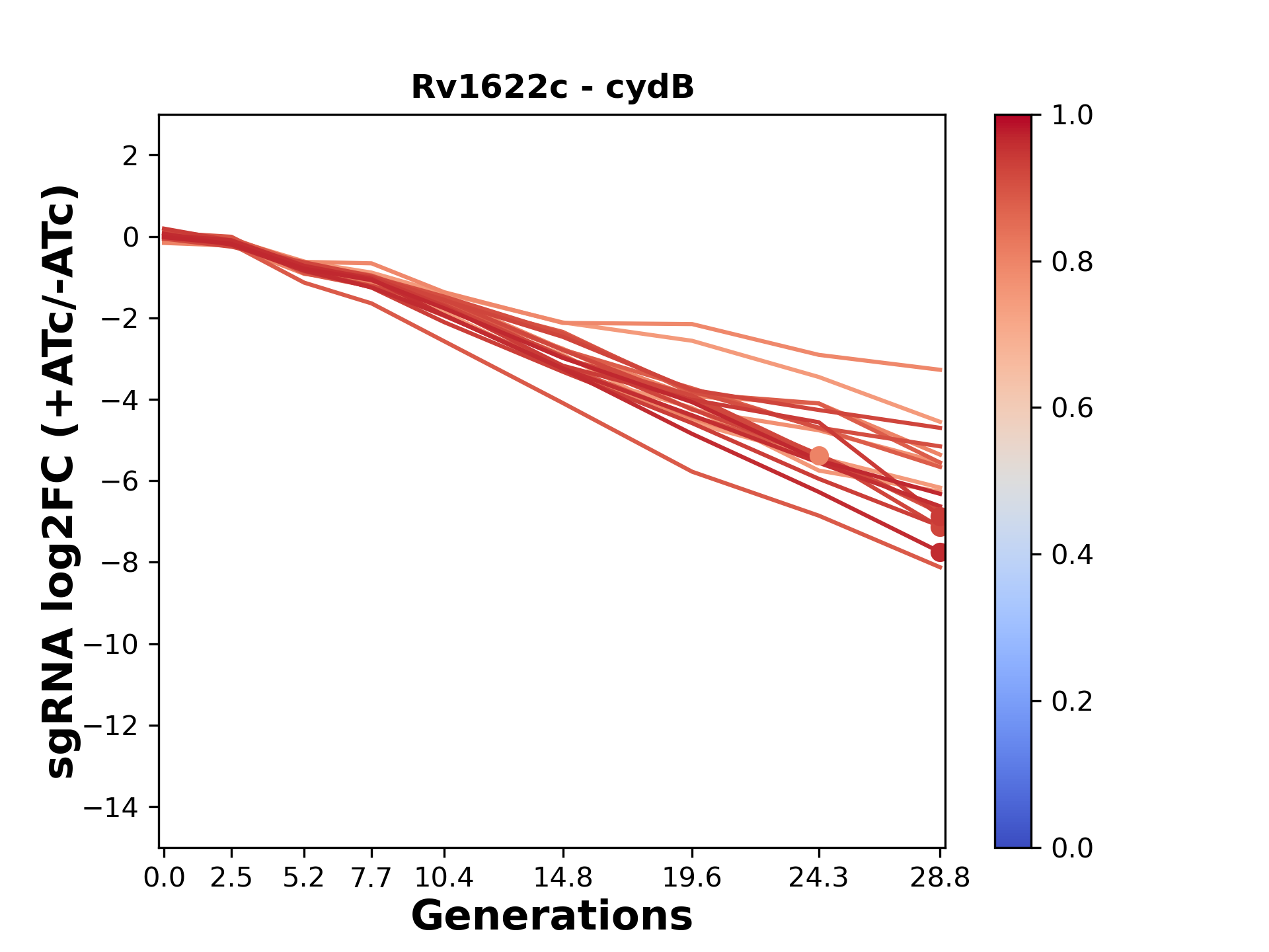 Experiment: We designed an M. tuberculosis CRISPRi library (RLC12) to target all annotated Mtb genes with single guide RNAs (sgRNAs) of varying predicted knockdown efficiencies. In parallel, we constructed a M. smegmatis CRISPRi library (RLC11) to target all annotated Msmeg genes, similar to the Mtb sgRNA library. RLC12 was transformed into M. tuberculosis H37Rv; RLC11 into M. smegmatis mc2-155. We passaged both CRISPRi libraries for nearly 30 generations in the presence or absence of the CRISPRi-inducer anhydrotetracycline (ATc). At the indicated timepoints, genomic DNA was harvested and the representation of individual sgRNAs was counted using Illumina sequencing. Here, we show sgRNA log2 fold-change values (L2FC) (plus versus minus ATc) over consecutive generations for sgRNAs targeting the gene you selected. sgRNAs are color-coded based on their predicted strength from blue (strength=0; weak) to red (strength=1; strong).