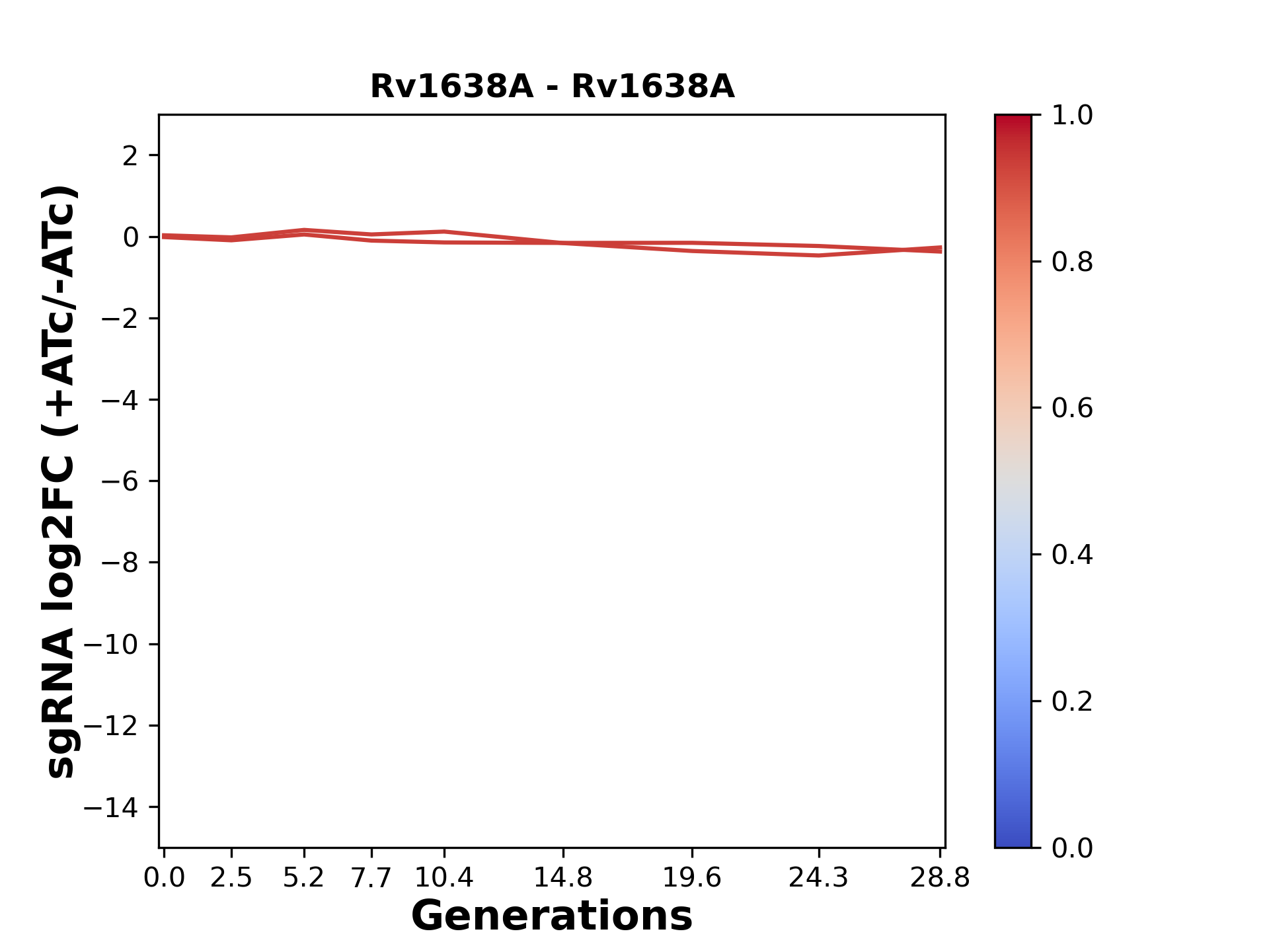 Here, we show sgRNA log2 fold-change values (L2FC) (plus versus minus ATc) over consecutive generations for sgRNAs targeting the gene you selected.