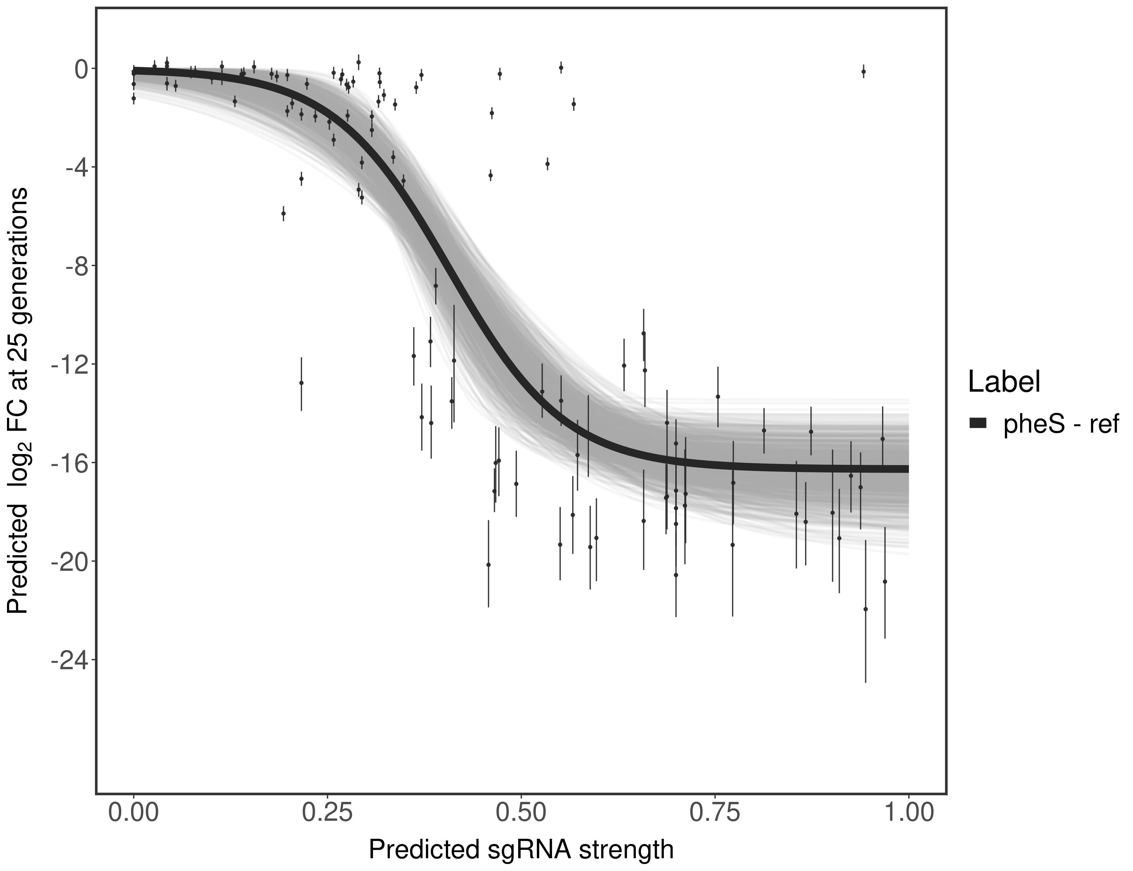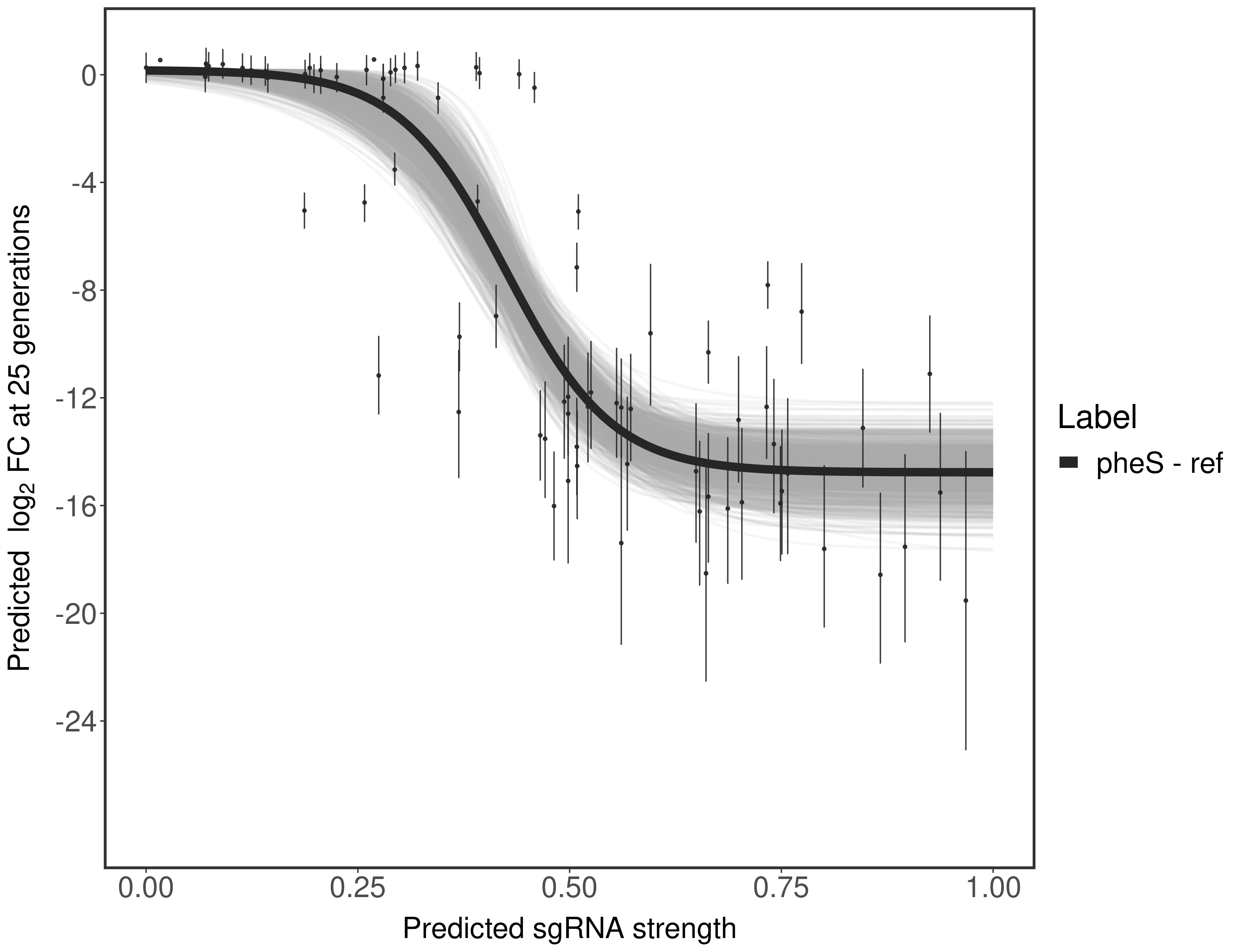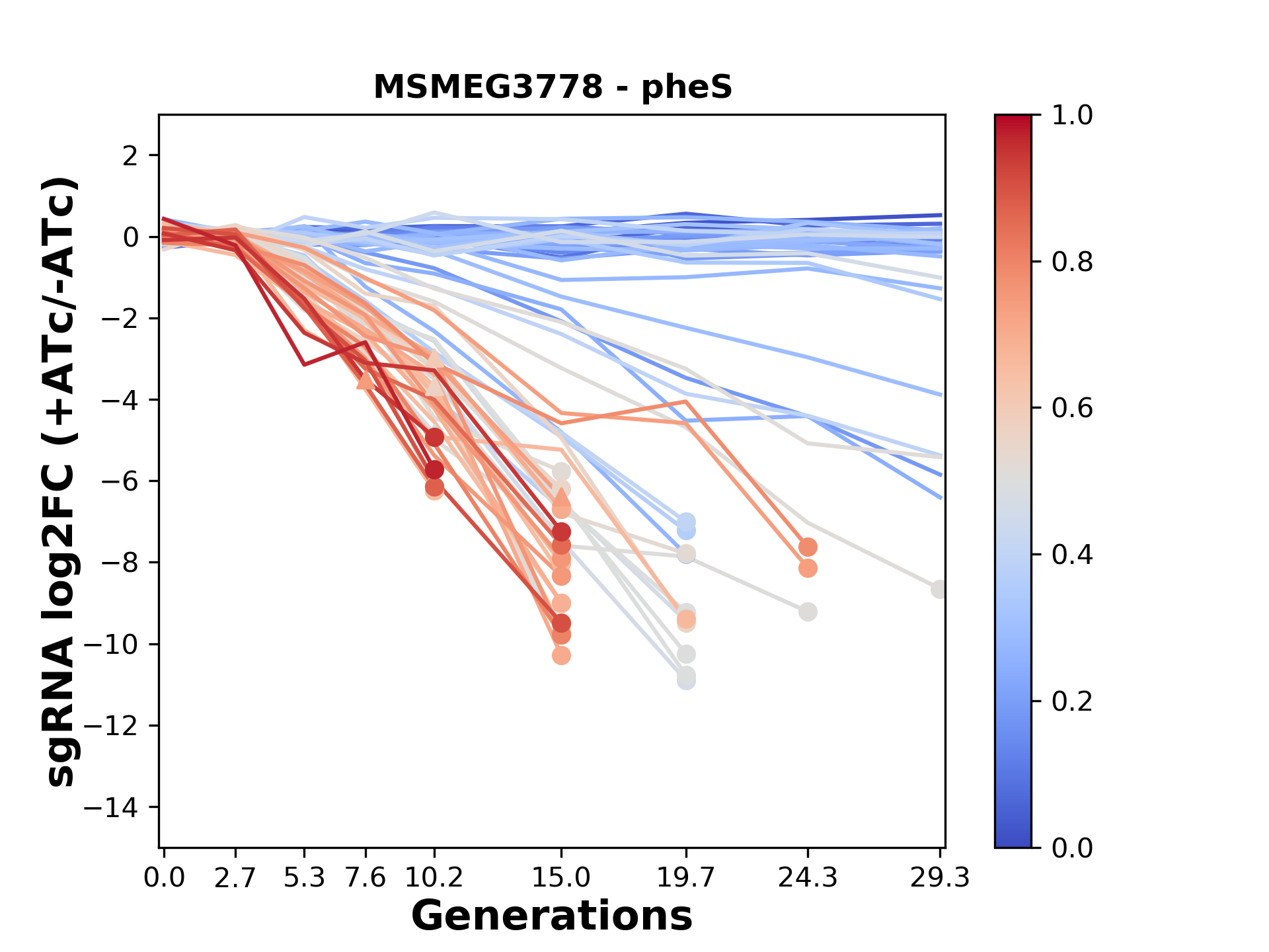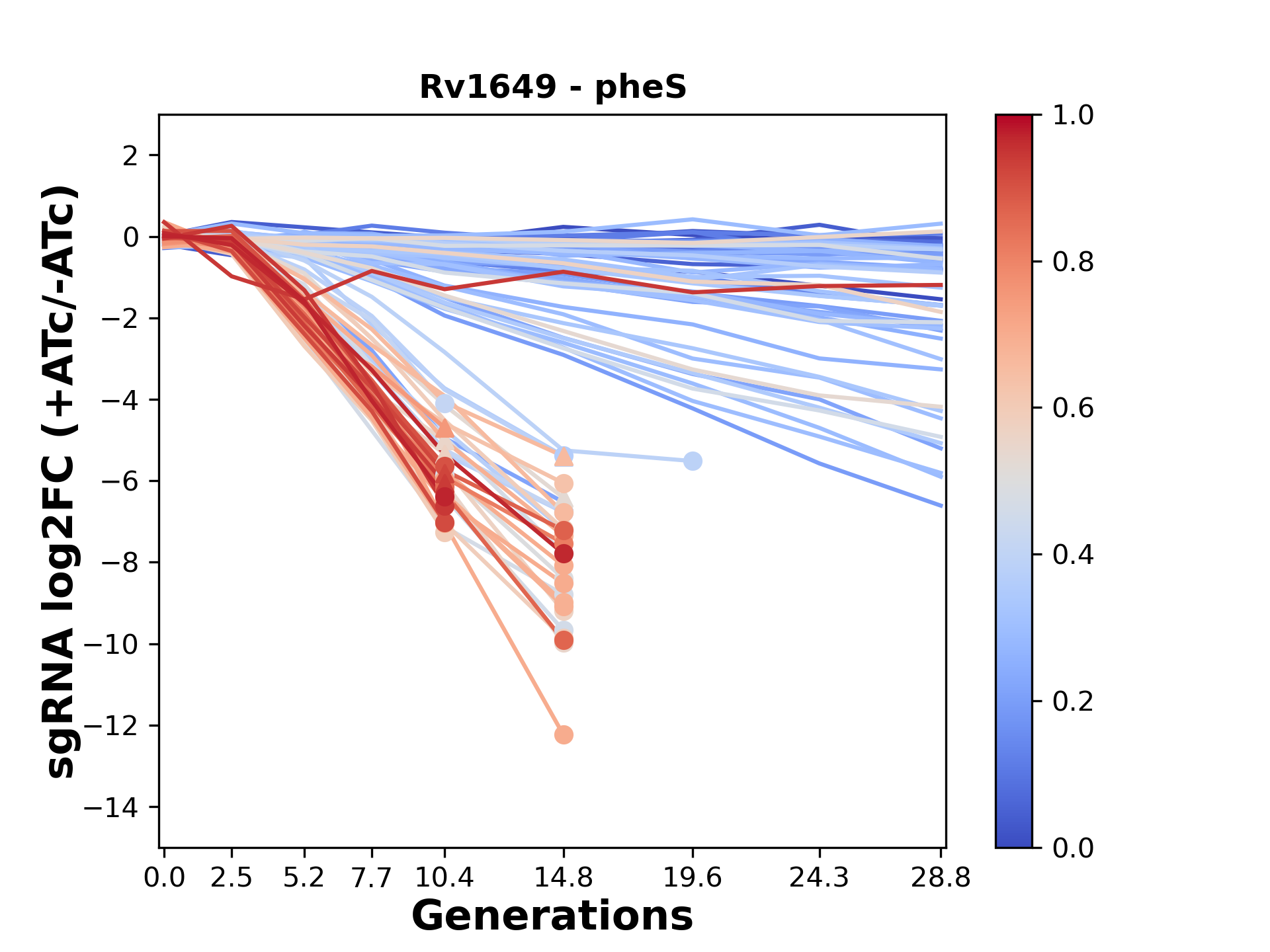 Experiment: We designed an M. tuberculosis CRISPRi library (RLC12) to target all annotated Mtb genes with single guide RNAs (sgRNAs) of varying predicted knockdown efficiencies. In parallel, we constructed a M. smegmatis CRISPRi library (RLC11) to target all annotated Msmeg genes, similar to the Mtb sgRNA library. RLC12 was transformed into M. tuberculosis H37Rv; RLC11 into M. smegmatis mc2-155. We passaged both CRISPRi libraries for nearly 30 generations in the presence or absence of the CRISPRi-inducer anhydrotetracycline (ATc). At the indicated timepoints, genomic DNA was harvested and the representation of individual sgRNAs was counted using Illumina sequencing. Here, we show sgRNA log2 fold-change values (L2FC) (plus versus minus ATc) over consecutive generations for sgRNAs targeting the gene you selected. sgRNAs are color-coded based on their predicted strength from blue (strength=0; weak) to red (strength=1; strong).