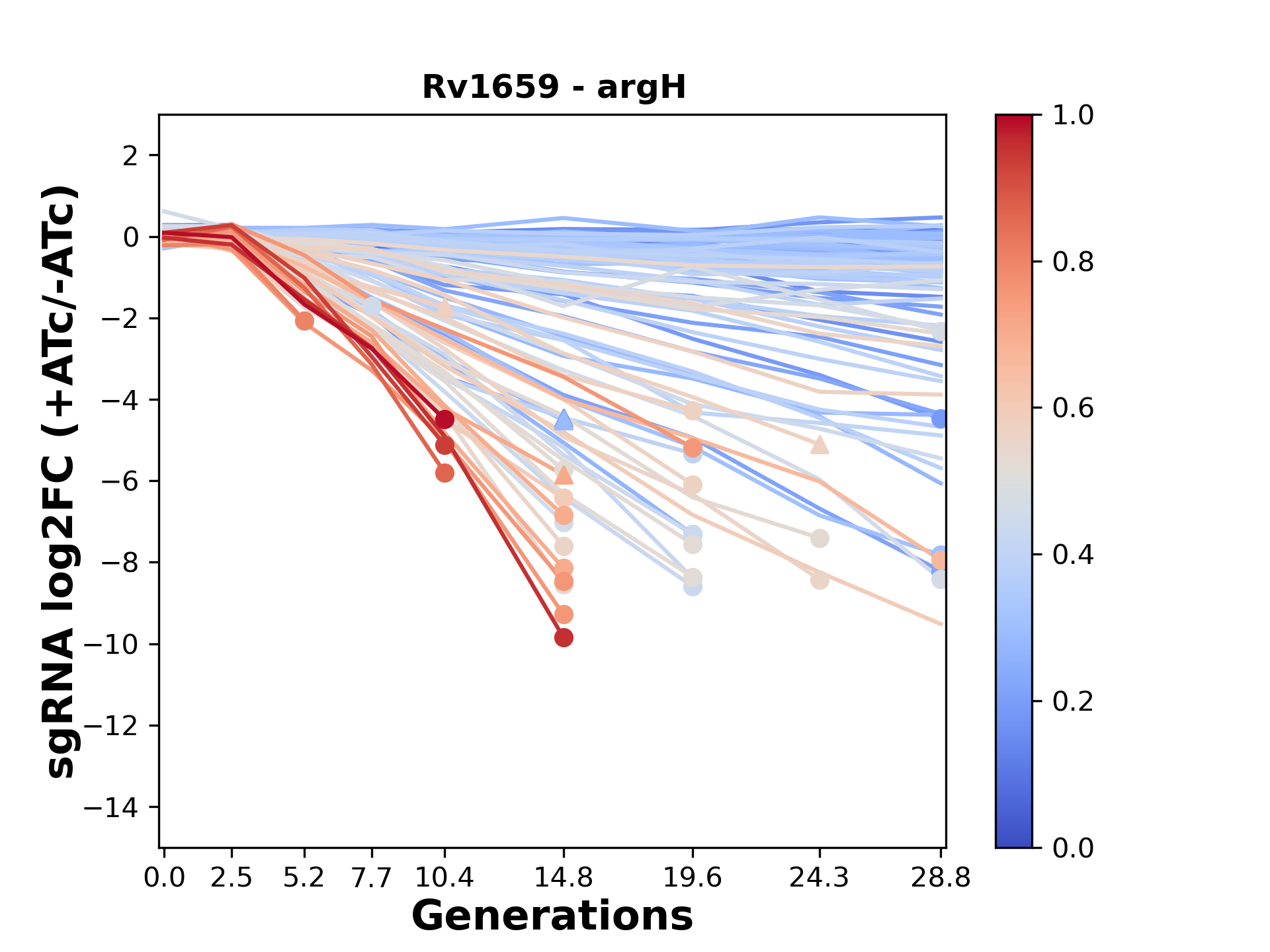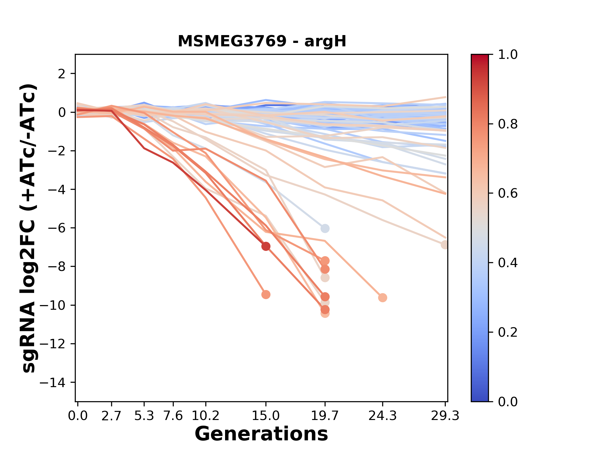 Here, we show sgRNA log2 fold-change values (L2FC) (plus versus minus ATc) over consecutive generations for sgRNAs targeting the gene you selected.