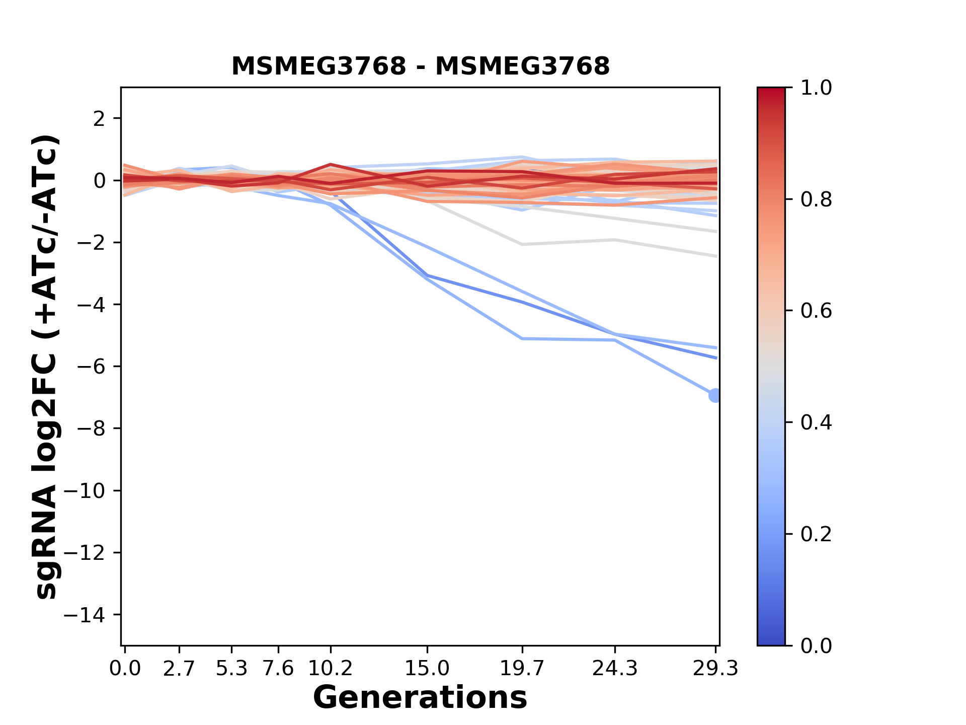 Here, we show sgRNA log2 fold-change values (L2FC) (plus versus minus ATc) over consecutive generations for sgRNAs targeting the gene you selected.