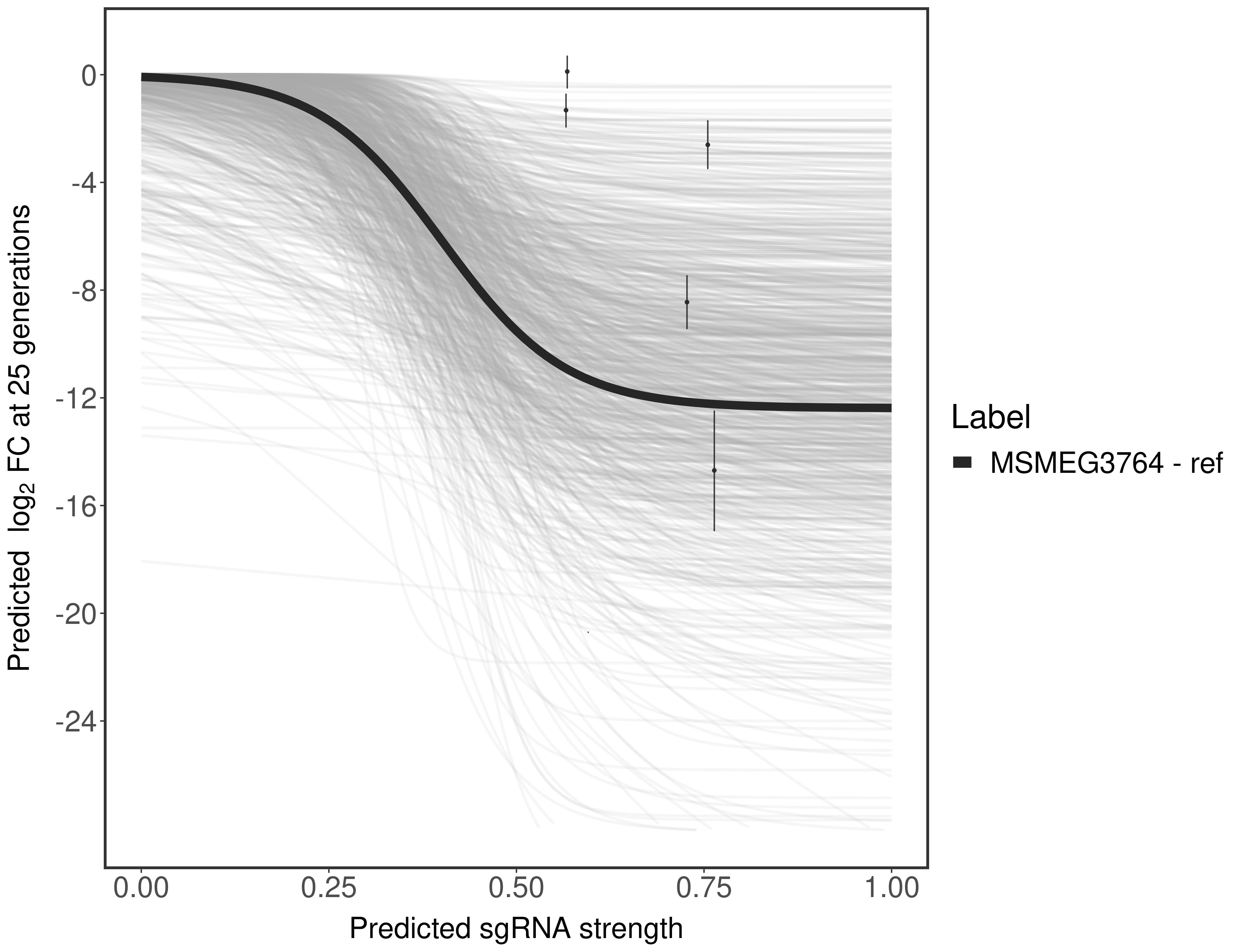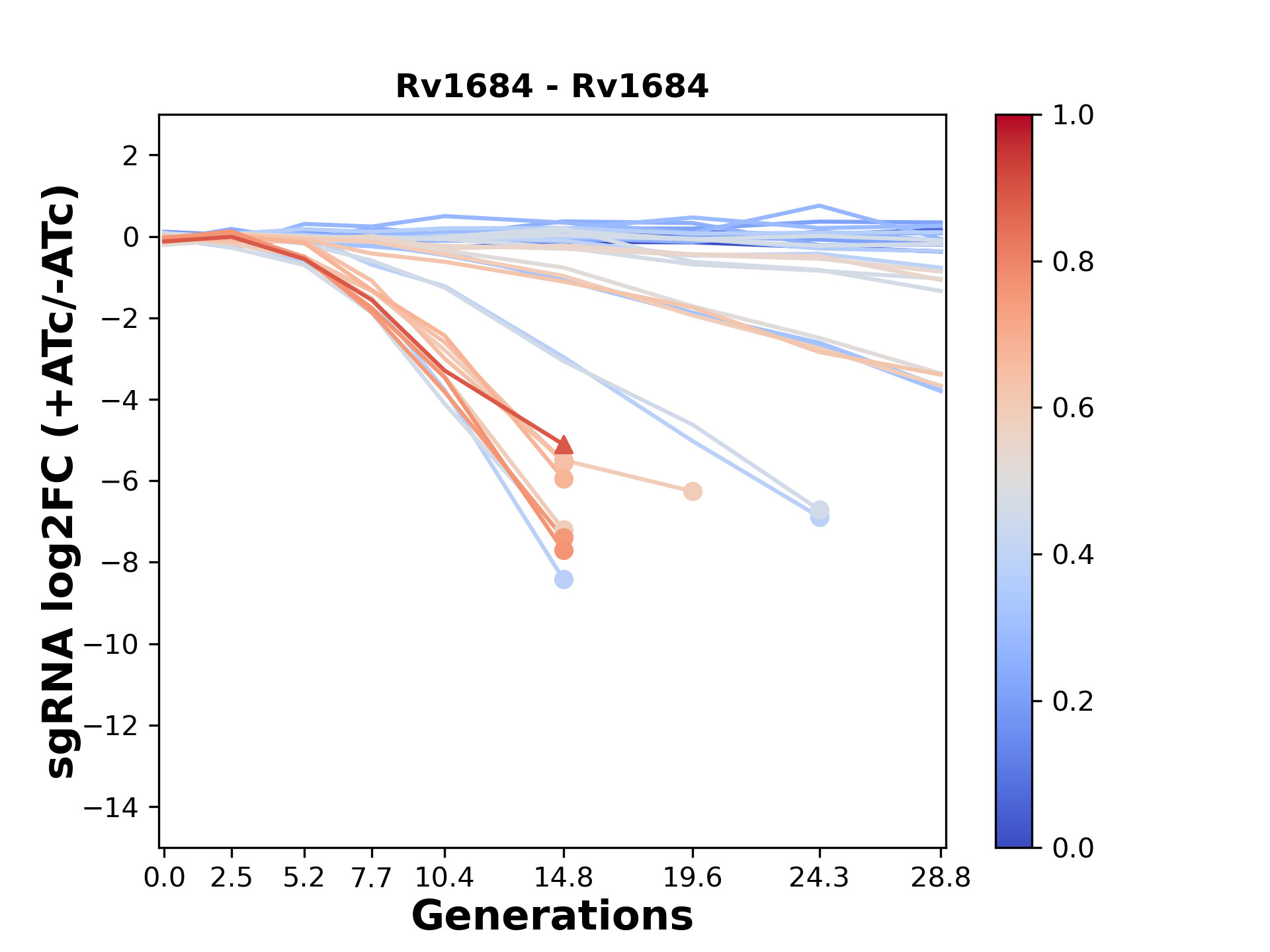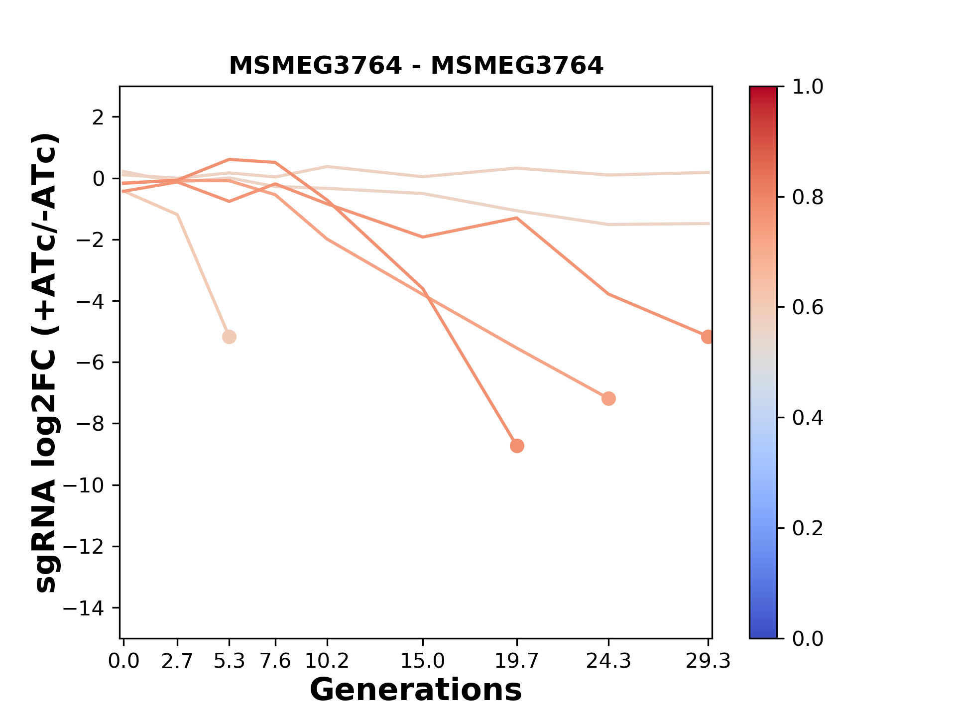 Experiment: We designed an M. tuberculosis CRISPRi library (RLC12) to target all annotated Mtb genes with single guide RNAs (sgRNAs) of varying predicted knockdown efficiencies. In parallel, we constructed a M. smegmatis CRISPRi library (RLC11) to target all annotated Msmeg genes, similar to the Mtb sgRNA library. RLC12 was transformed into M. tuberculosis H37Rv; RLC11 into M. smegmatis mc2-155. We passaged both CRISPRi libraries for nearly 30 generations in the presence or absence of the CRISPRi-inducer anhydrotetracycline (ATc). At the indicated timepoints, genomic DNA was harvested and the representation of individual sgRNAs was counted using Illumina sequencing. Here, we show sgRNA log2 fold-change values (L2FC) (plus versus minus ATc) over consecutive generations for sgRNAs targeting the gene you selected. sgRNAs are color-coded based on their predicted strength from blue (strength=0; weak) to red (strength=1; strong).
