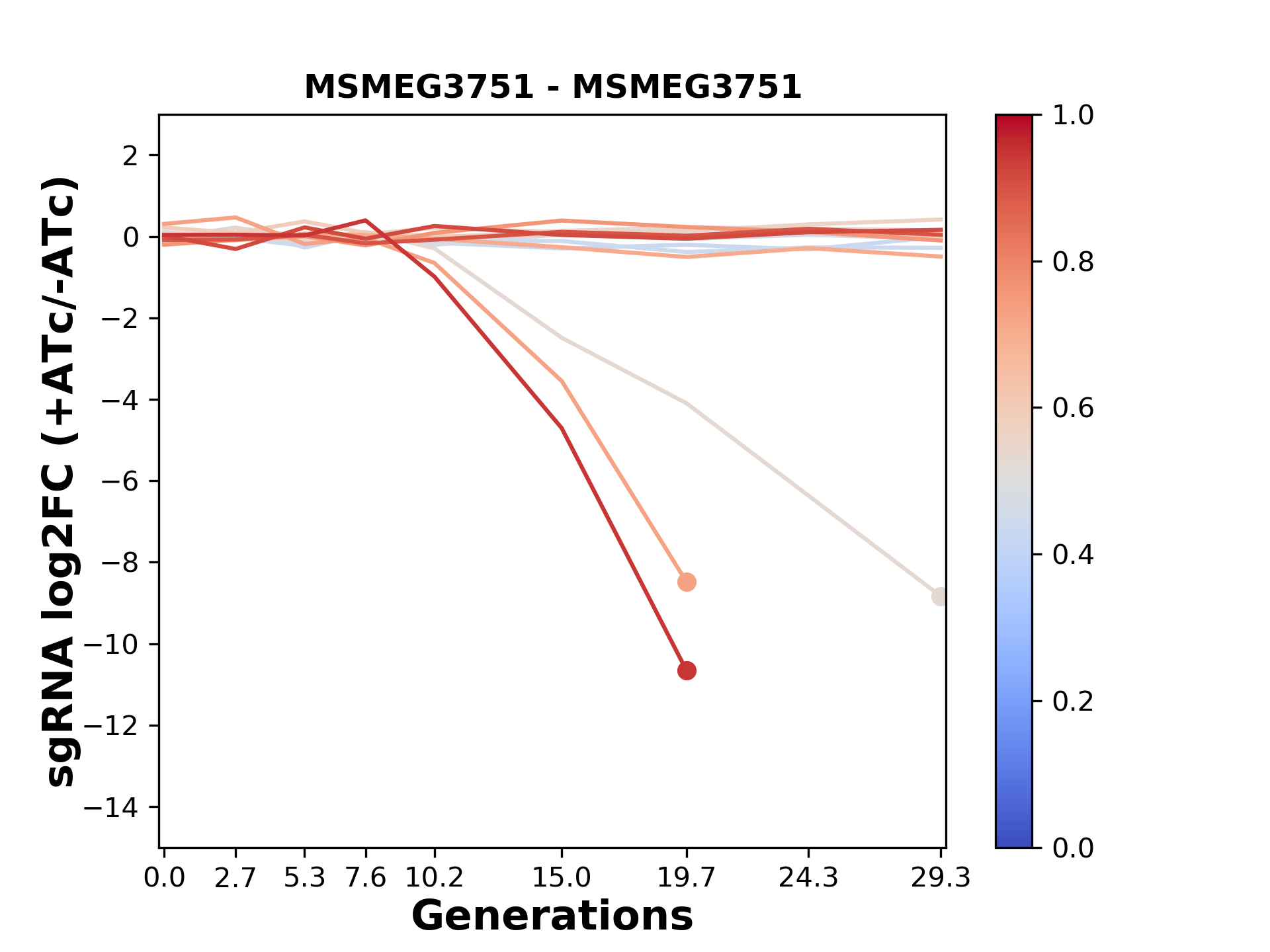 Here, we show sgRNA log2 fold-change values (L2FC) (plus versus minus ATc) over consecutive generations for sgRNAs targeting the gene you selected.