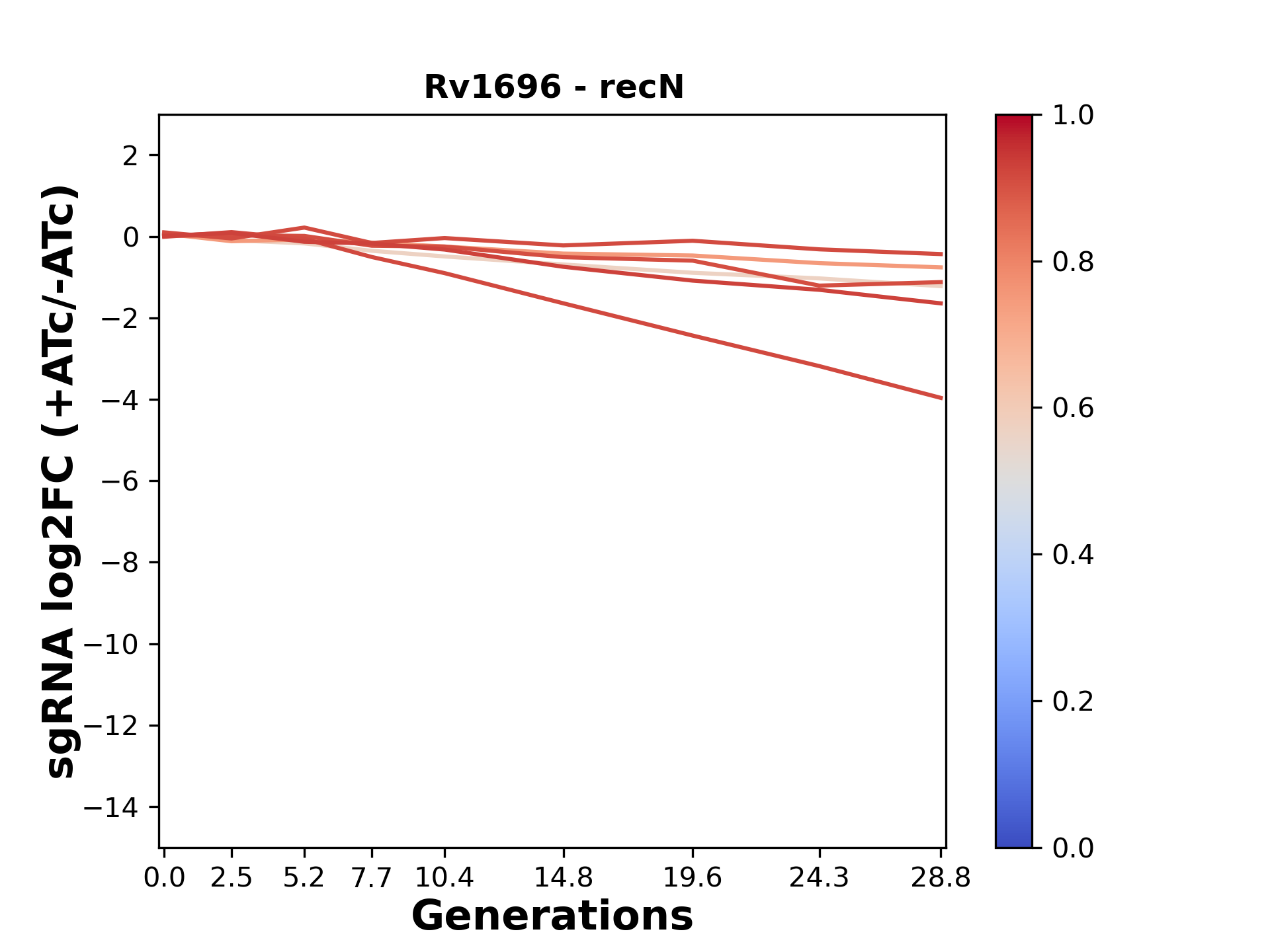 Here, we show sgRNA log2 fold-change values (L2FC) (plus versus minus ATc) over consecutive generations for sgRNAs targeting the gene you selected.