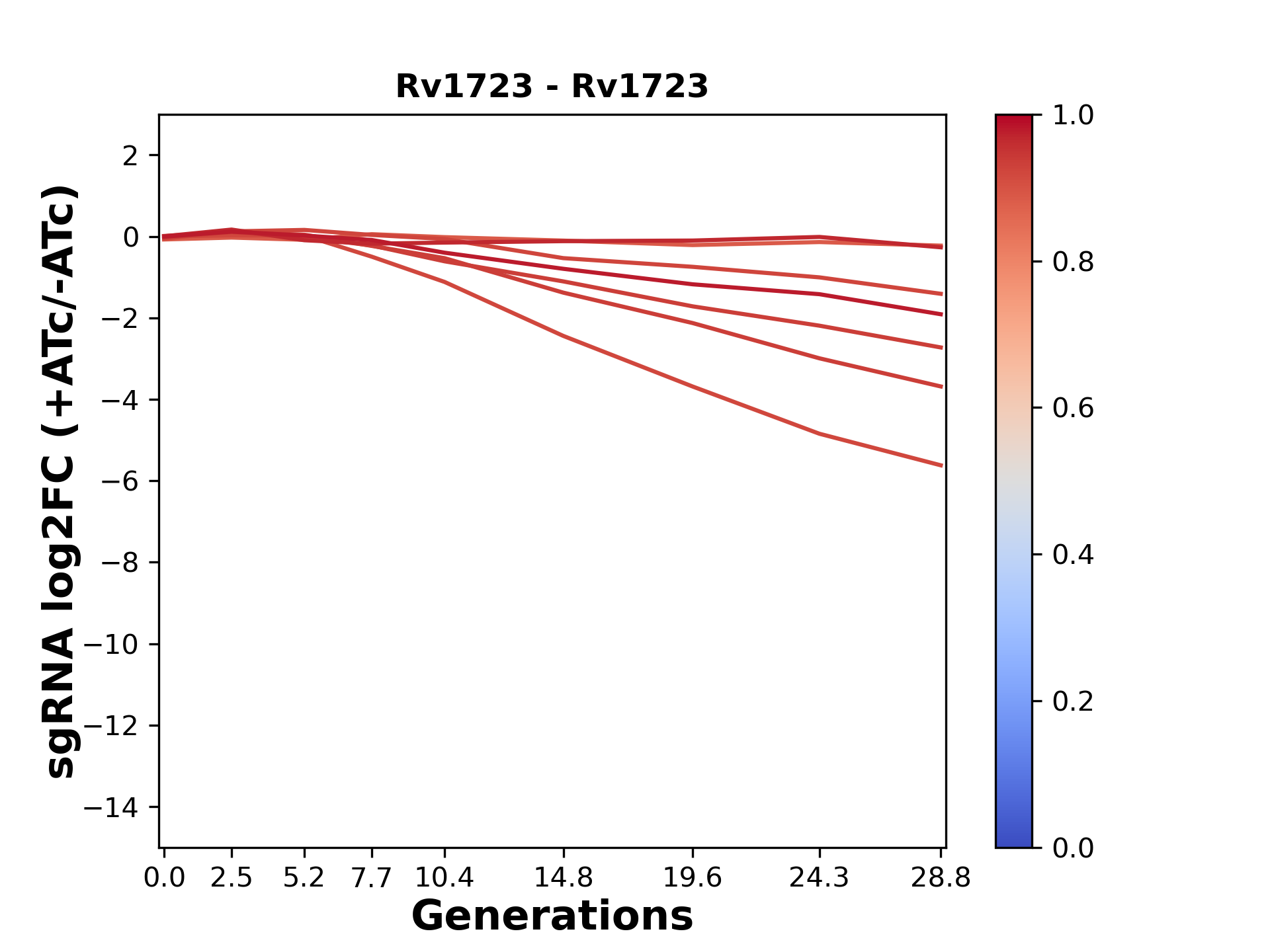 Here, we show sgRNA log2 fold-change values (L2FC) (plus versus minus ATc) over consecutive generations for sgRNAs targeting the gene you selected.