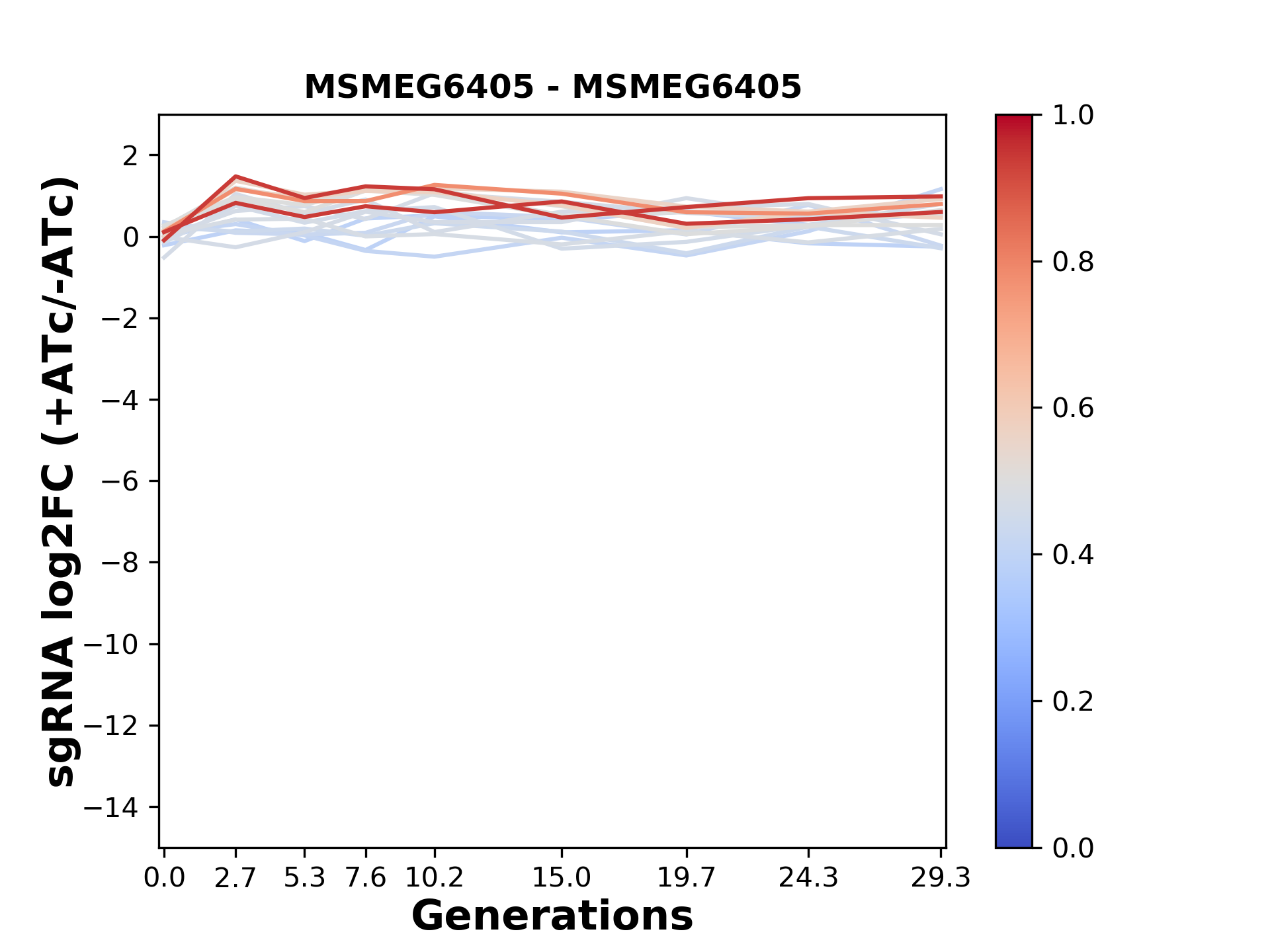 Here, we show sgRNA log2 fold-change values (L2FC) (plus versus minus ATc) over consecutive generations for sgRNAs targeting the gene you selected.