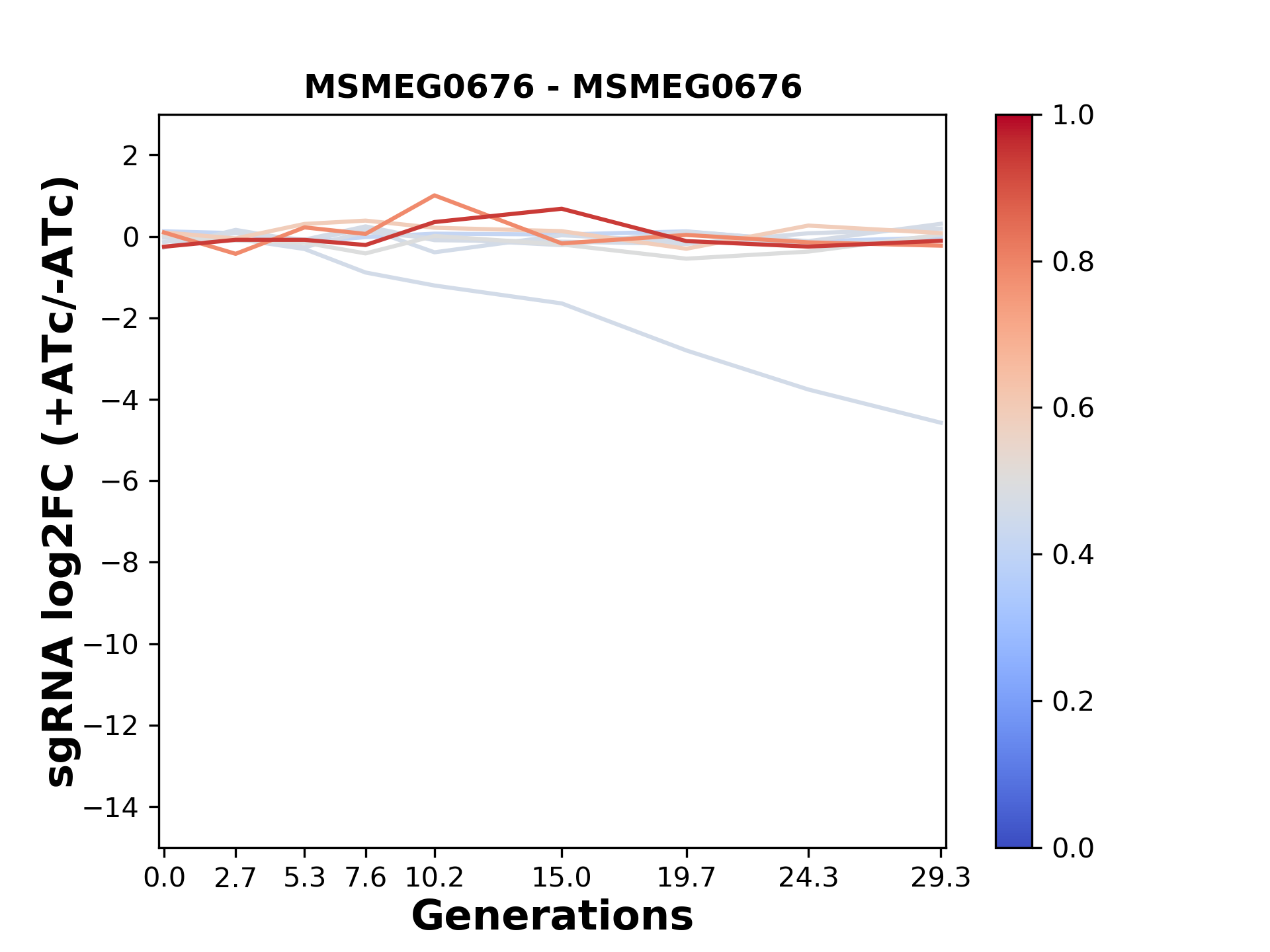 Here, we show sgRNA log2 fold-change values (L2FC) (plus versus minus ATc) over consecutive generations for sgRNAs targeting the gene you selected.
