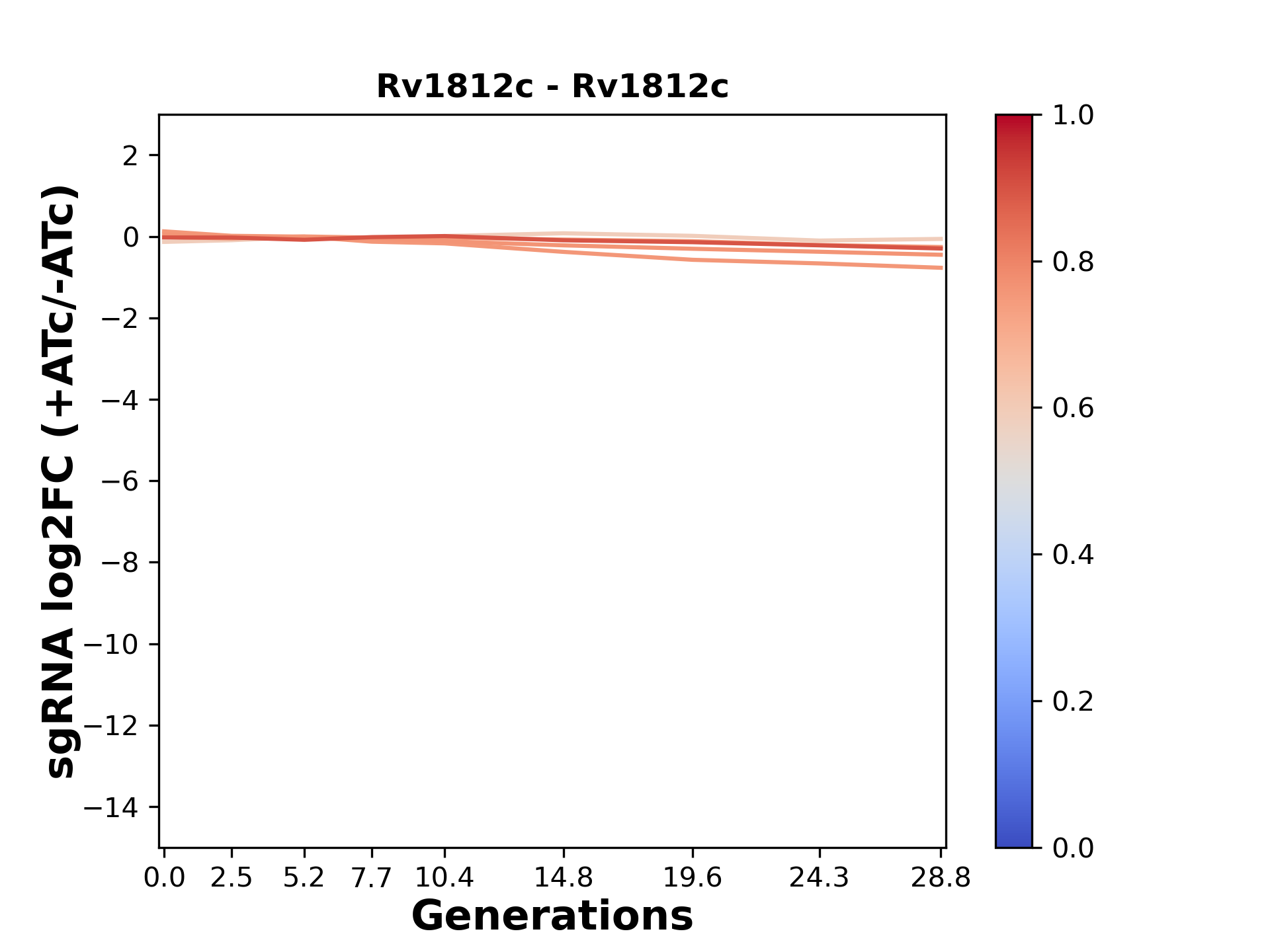 Here, we show sgRNA log2 fold-change values (L2FC) (plus versus minus ATc) over consecutive generations for sgRNAs targeting the gene you selected.