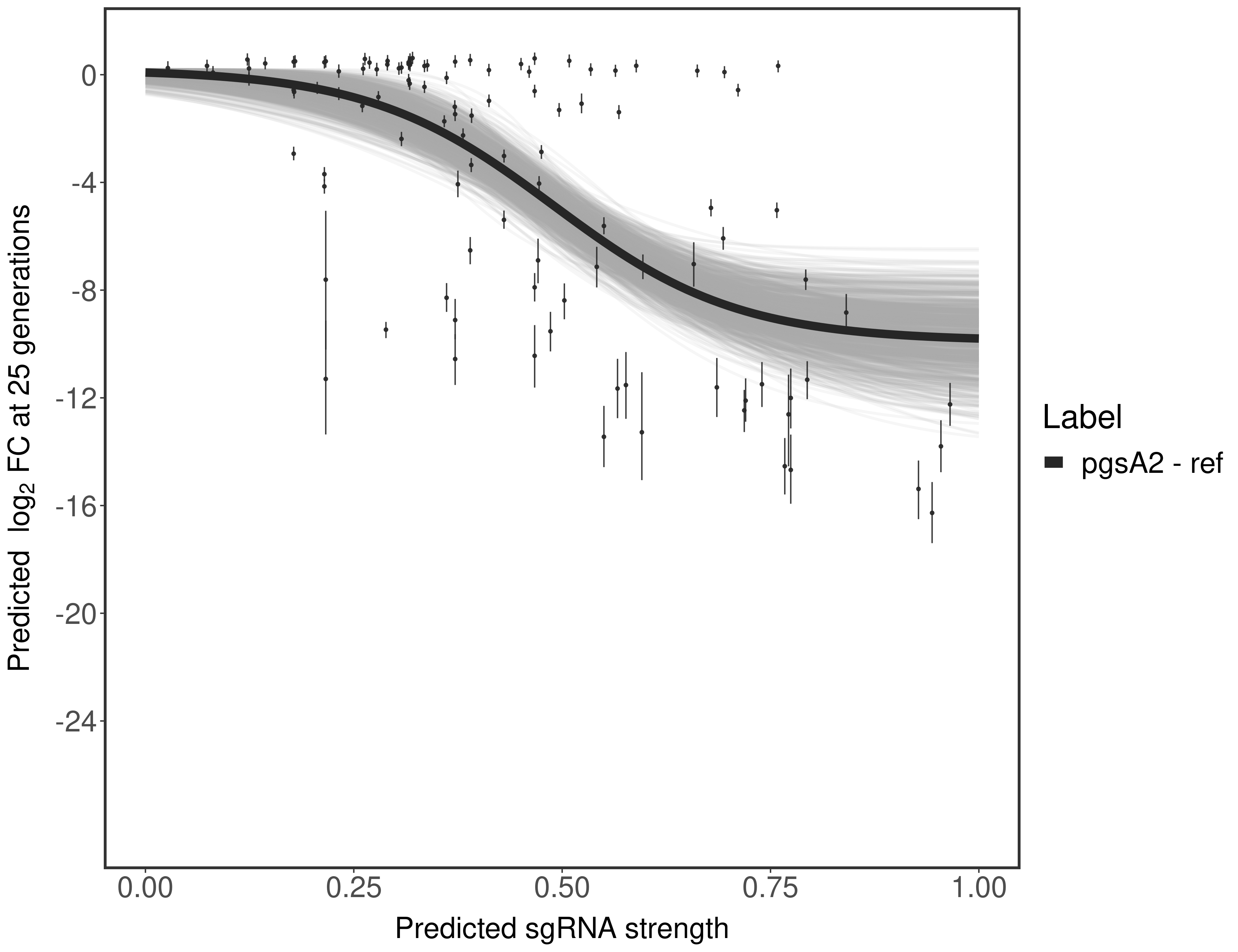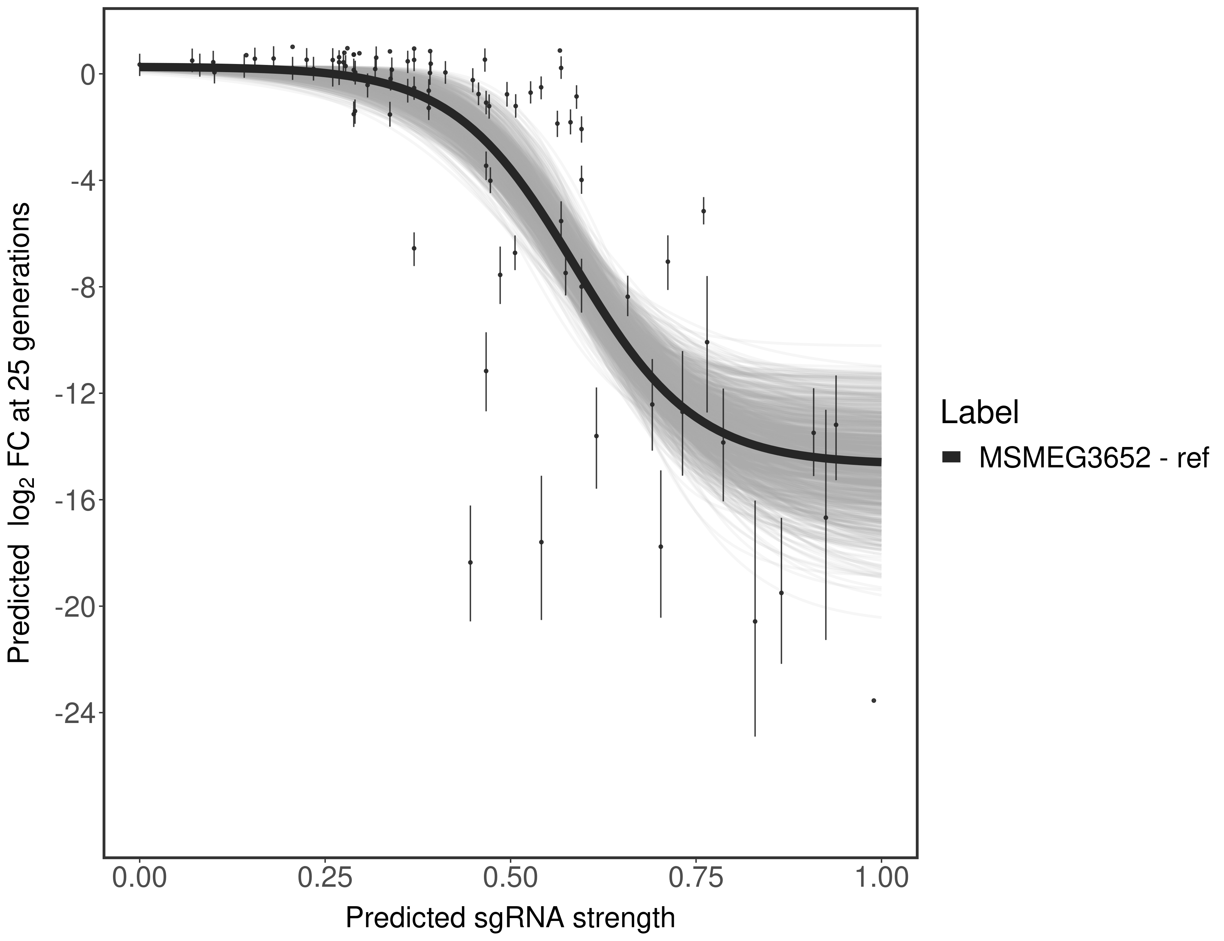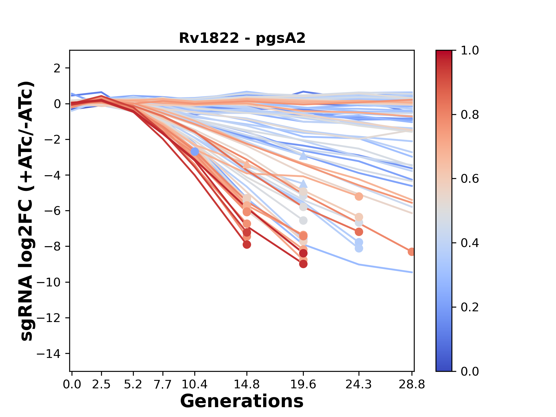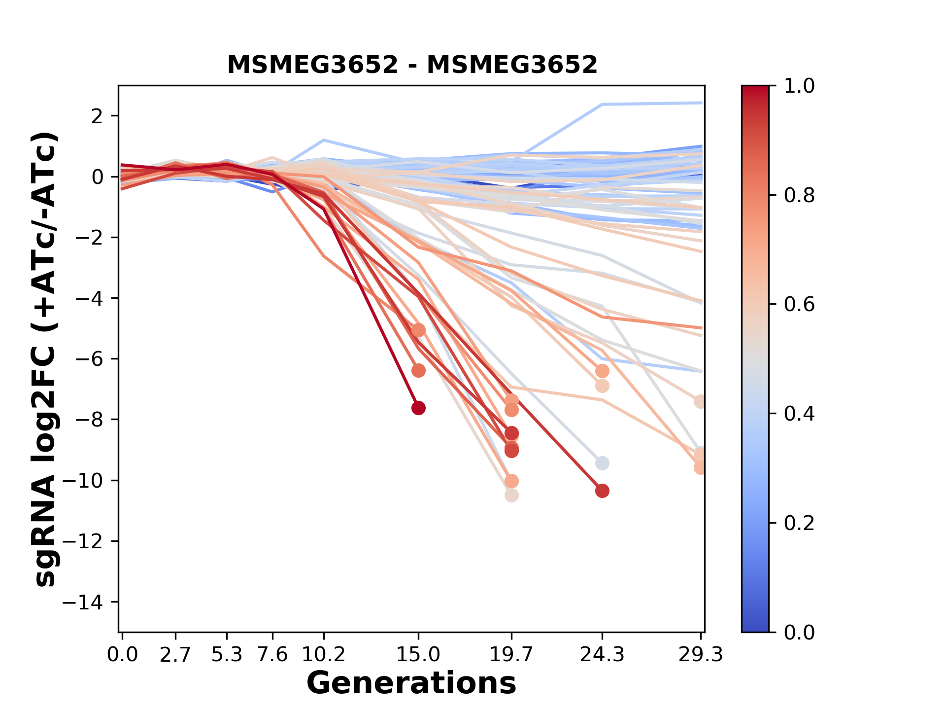 Experiment: We designed an M. tuberculosis CRISPRi library (RLC12) to target all annotated Mtb genes with single guide RNAs (sgRNAs) of varying predicted knockdown efficiencies. In parallel, we constructed a M. smegmatis CRISPRi library (RLC11) to target all annotated Msmeg genes, similar to the Mtb sgRNA library. RLC12 was transformed into M. tuberculosis H37Rv; RLC11 into M. smegmatis mc2-155. We passaged both CRISPRi libraries for nearly 30 generations in the presence or absence of the CRISPRi-inducer anhydrotetracycline (ATc). At the indicated timepoints, genomic DNA was harvested and the representation of individual sgRNAs was counted using Illumina sequencing. Here, we show sgRNA log2 fold-change values (L2FC) (plus versus minus ATc) over consecutive generations for sgRNAs targeting the gene you selected. sgRNAs are color-coded based on their predicted strength from blue (strength=0; weak) to red (strength=1; strong).