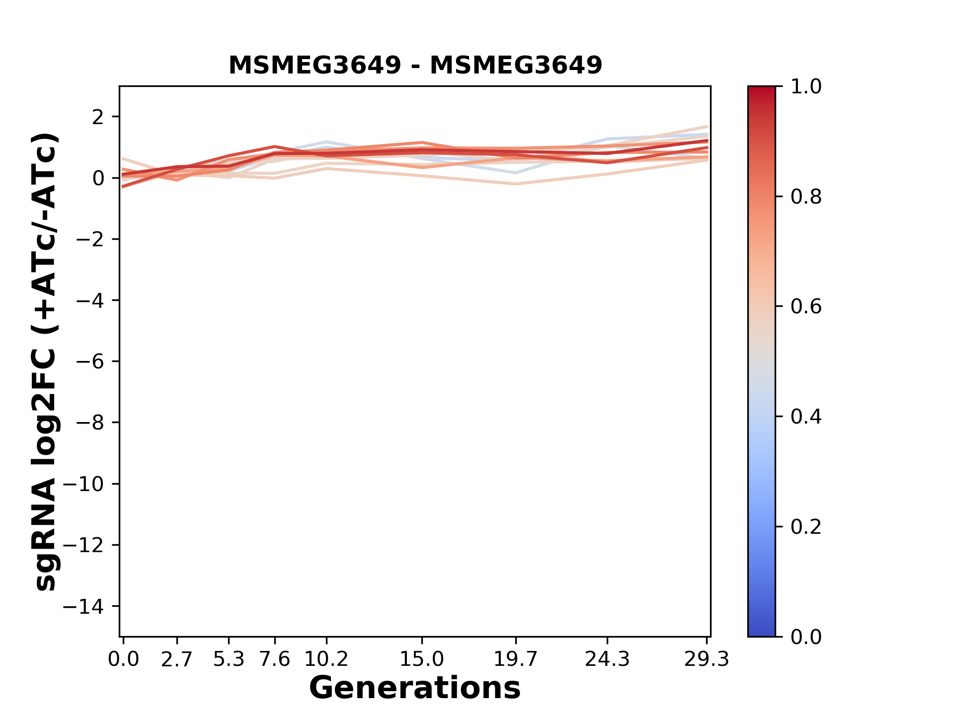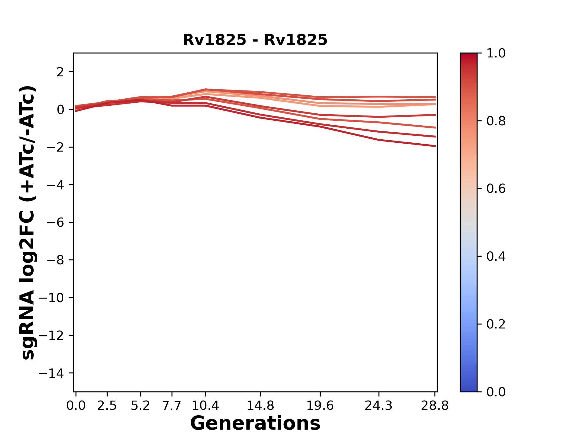 Here, we show sgRNA log2 fold-change values (L2FC) (plus versus minus ATc) over consecutive generations for sgRNAs targeting the gene you selected.