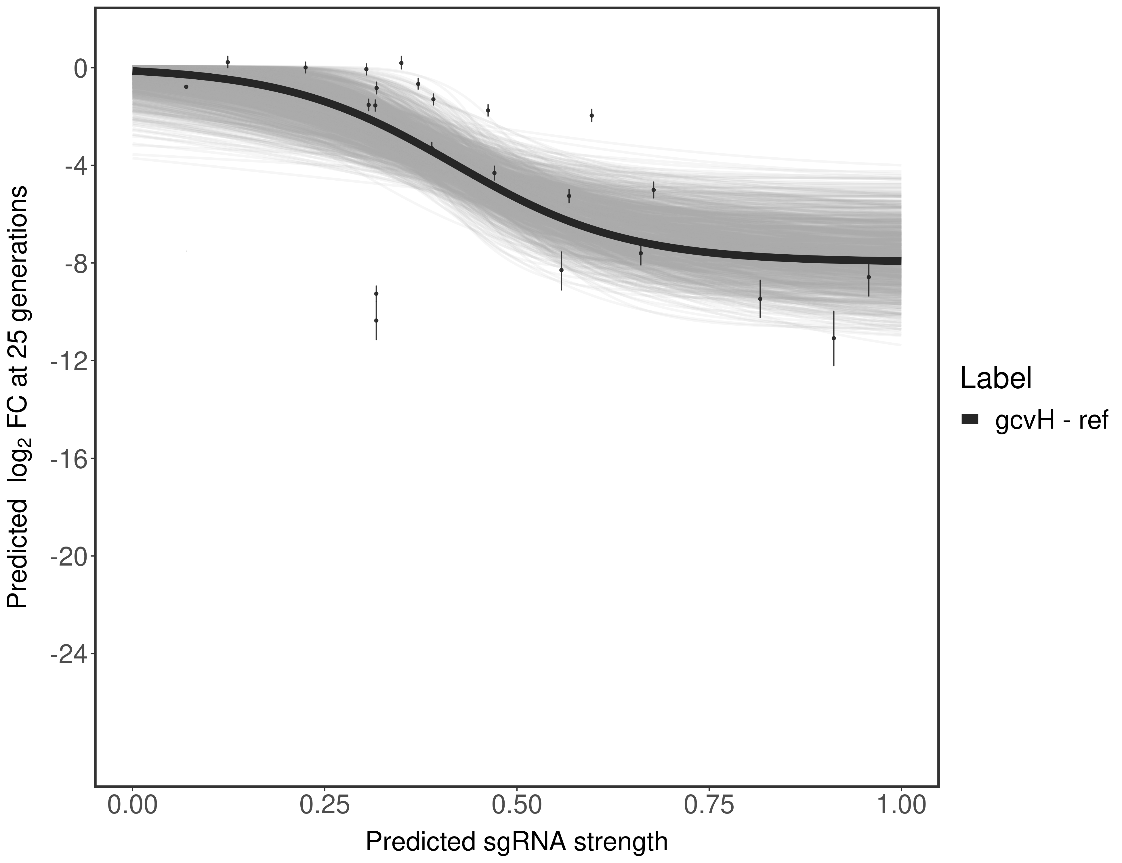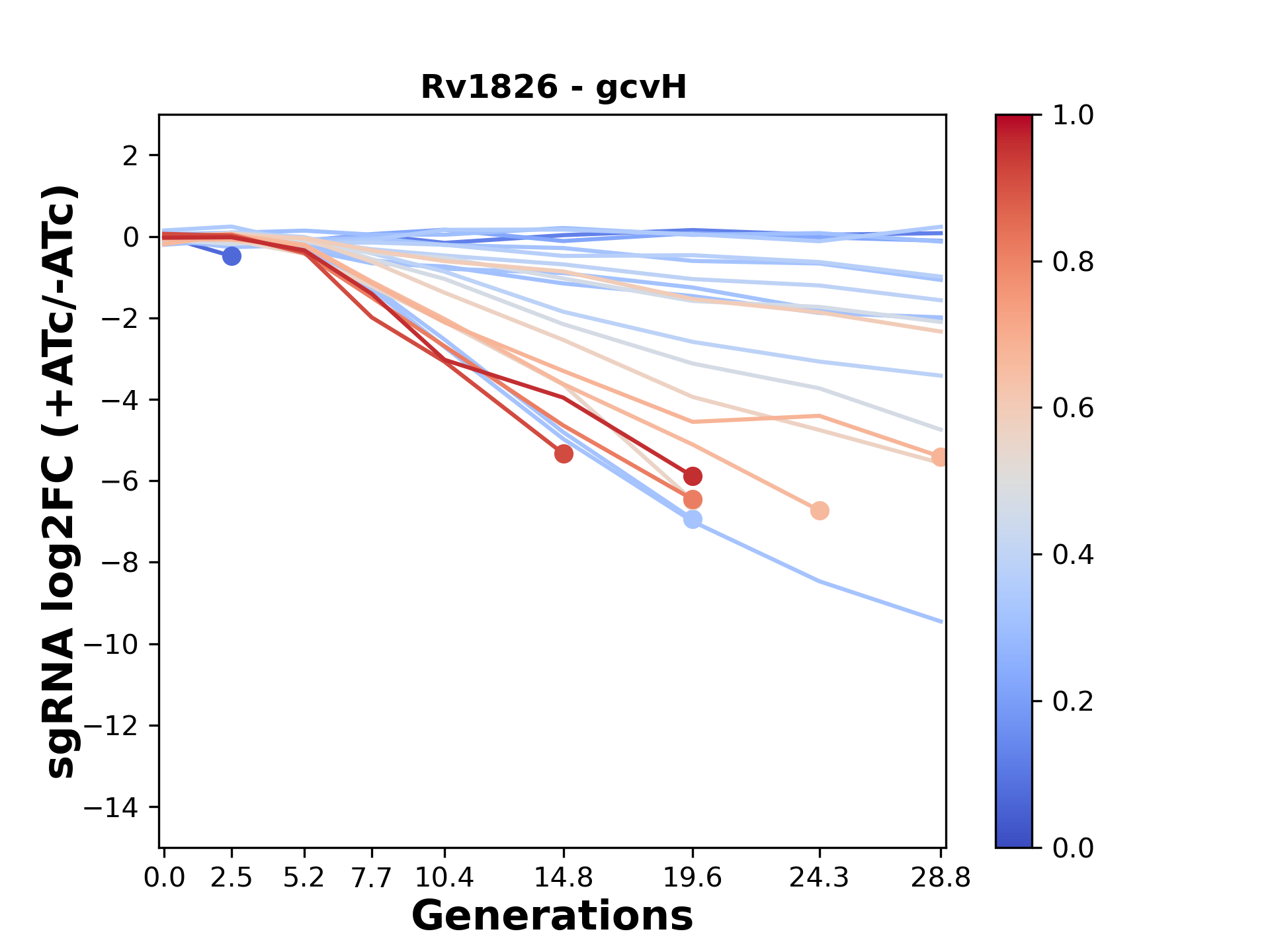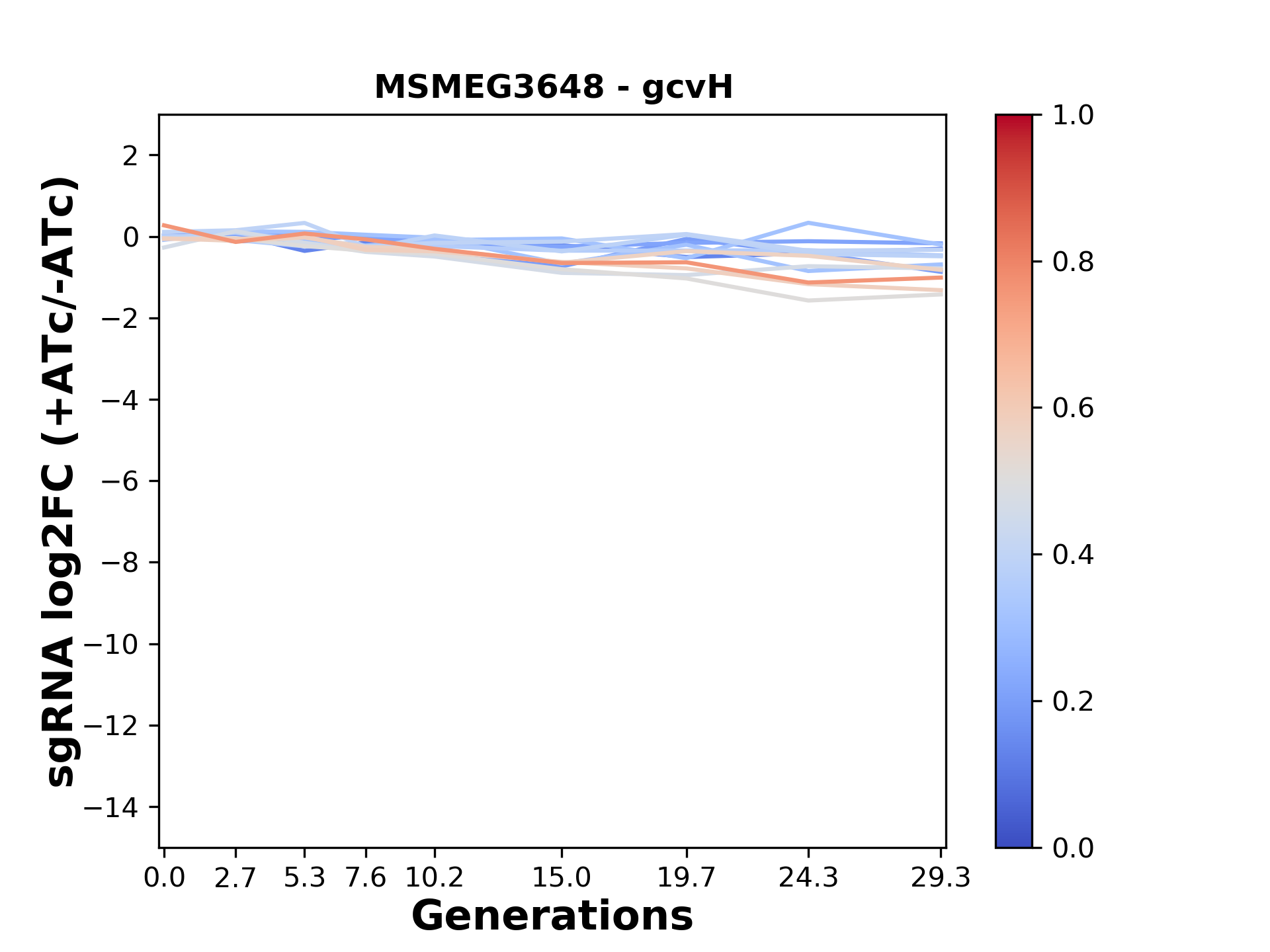 Here, we show sgRNA log2 fold-change values (L2FC) (plus versus minus ATc) over consecutive generations for sgRNAs targeting the gene you selected.