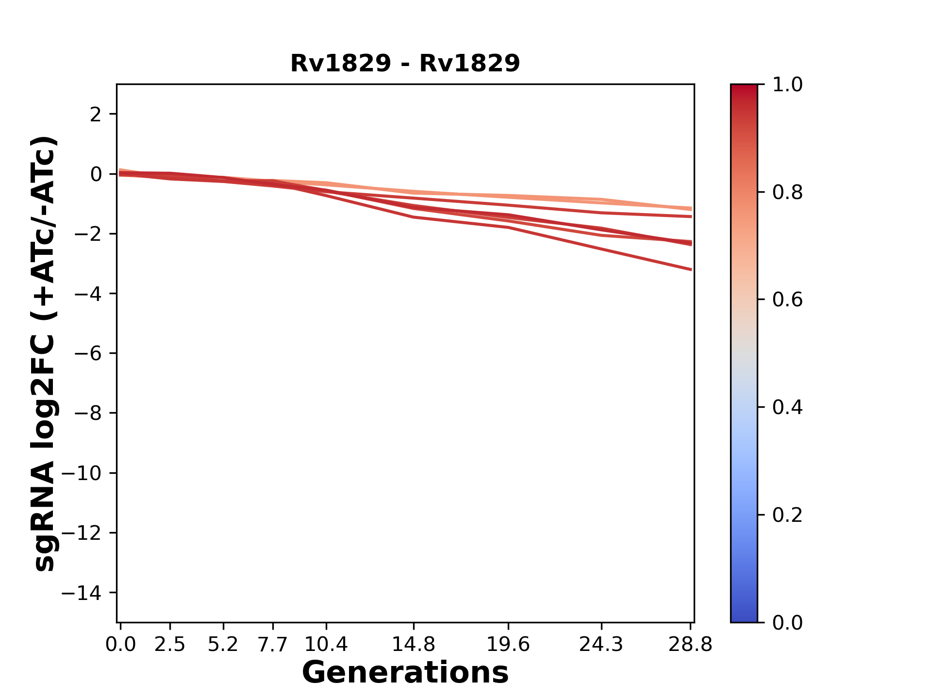 Here, we show sgRNA log2 fold-change values (L2FC) (plus versus minus ATc) over consecutive generations for sgRNAs targeting the gene you selected.