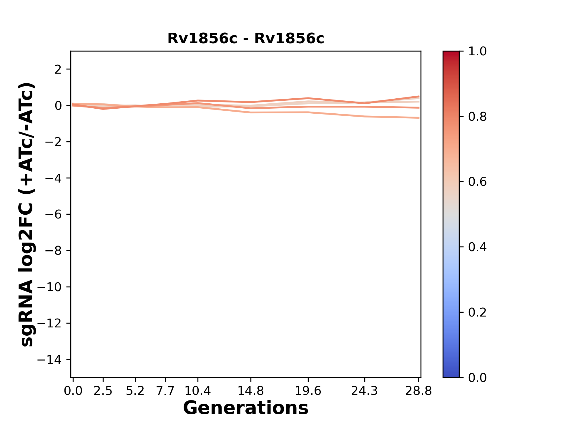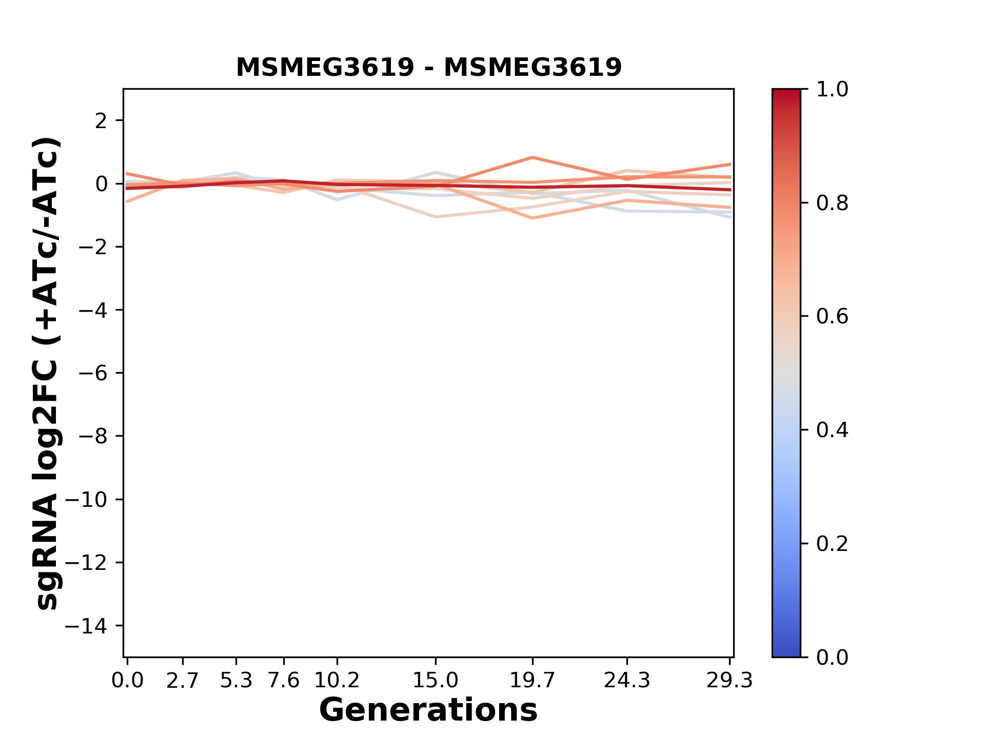 Experiment: We designed an M. tuberculosis CRISPRi library (RLC12) to target all annotated Mtb genes with single guide RNAs (sgRNAs) of varying predicted knockdown efficiencies. In parallel, we constructed a M. smegmatis CRISPRi library (RLC11) to target all annotated Msmeg genes, similar to the Mtb sgRNA library. RLC12 was transformed into M. tuberculosis H37Rv; RLC11 into M. smegmatis mc2-155. We passaged both CRISPRi libraries for nearly 30 generations in the presence or absence of the CRISPRi-inducer anhydrotetracycline (ATc). At the indicated timepoints, genomic DNA was harvested and the representation of individual sgRNAs was counted using Illumina sequencing. Here, we show sgRNA log2 fold-change values (L2FC) (plus versus minus ATc) over consecutive generations for sgRNAs targeting the gene you selected. sgRNAs are color-coded based on their predicted strength from blue (strength=0; weak) to red (strength=1; strong).
