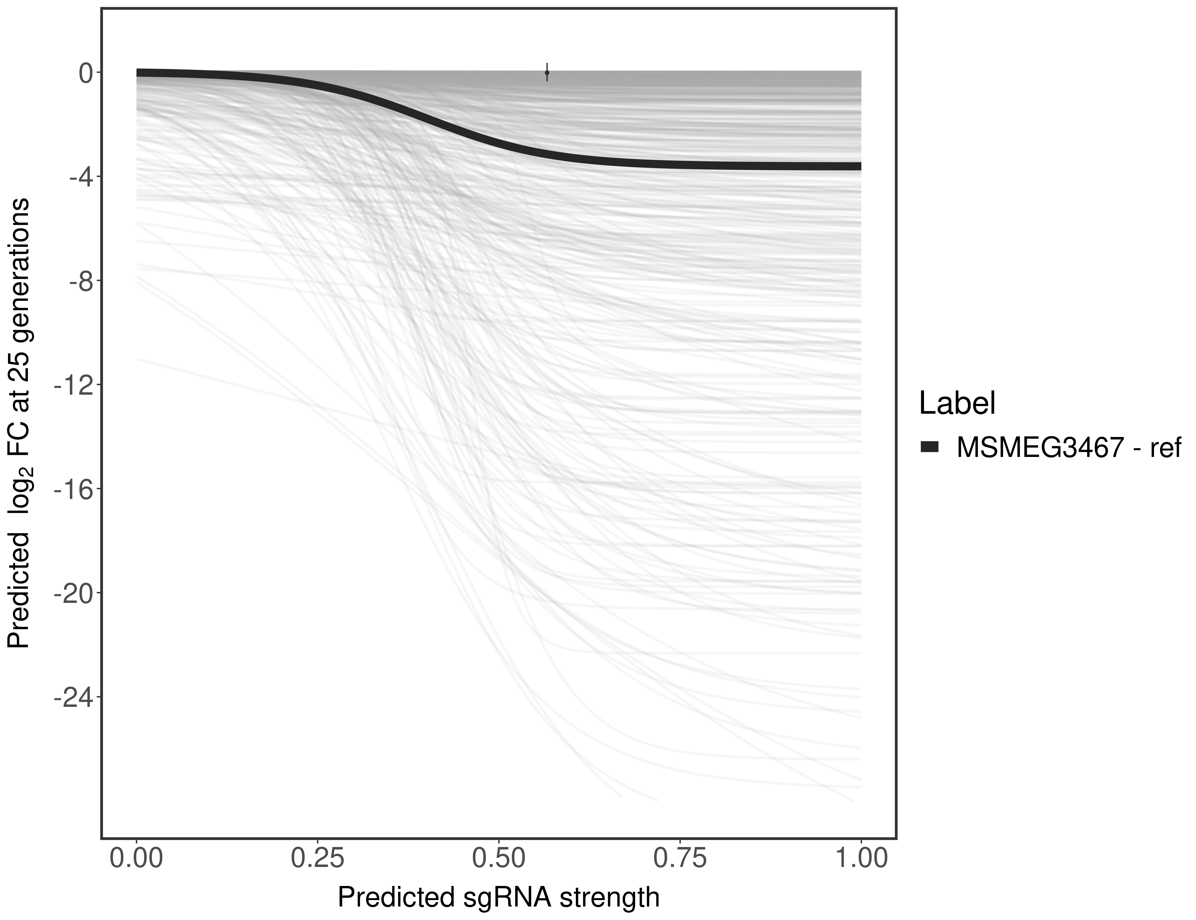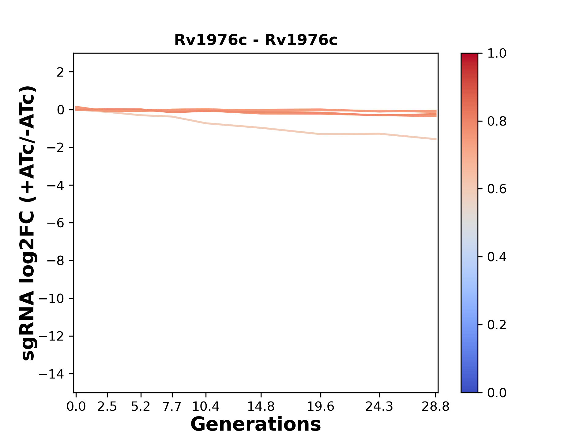 Experiment: We designed an M. tuberculosis CRISPRi library (RLC12) to target all annotated Mtb genes with single guide RNAs (sgRNAs) of varying predicted knockdown efficiencies. In parallel, we constructed a M. smegmatis CRISPRi library (RLC11) to target all annotated Msmeg genes, similar to the Mtb sgRNA library. RLC12 was transformed into M. tuberculosis H37Rv; RLC11 into M. smegmatis mc2-155. We passaged both CRISPRi libraries for nearly 30 generations in the presence or absence of the CRISPRi-inducer anhydrotetracycline (ATc). At the indicated timepoints, genomic DNA was harvested and the representation of individual sgRNAs was counted using Illumina sequencing. Here, we show sgRNA log2 fold-change values (L2FC) (plus versus minus ATc) over consecutive generations for sgRNAs targeting the gene you selected. sgRNAs are color-coded based on their predicted strength from blue (strength=0; weak) to red (strength=1; strong).