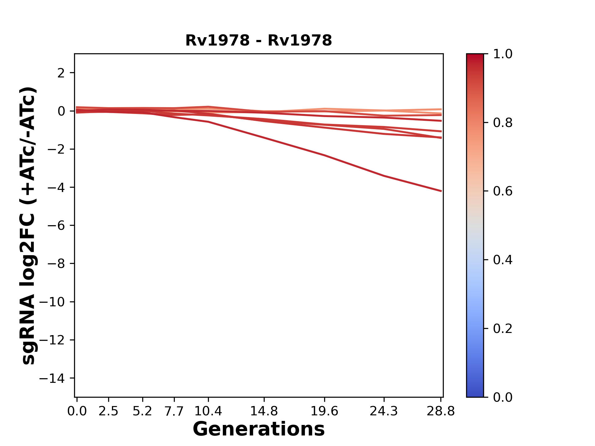 Experiment: We designed an M. tuberculosis CRISPRi library (RLC12) to target all annotated Mtb genes with single guide RNAs (sgRNAs) of varying predicted knockdown efficiencies. In parallel, we constructed a M. smegmatis CRISPRi library (RLC11) to target all annotated Msmeg genes, similar to the Mtb sgRNA library. RLC12 was transformed into M. tuberculosis H37Rv; RLC11 into M. smegmatis mc2-155. We passaged both CRISPRi libraries for nearly 30 generations in the presence or absence of the CRISPRi-inducer anhydrotetracycline (ATc). At the indicated timepoints, genomic DNA was harvested and the representation of individual sgRNAs was counted using Illumina sequencing. Here, we show sgRNA log2 fold-change values (L2FC) (plus versus minus ATc) over consecutive generations for sgRNAs targeting the gene you selected. sgRNAs are color-coded based on their predicted strength from blue (strength=0; weak) to red (strength=1; strong).