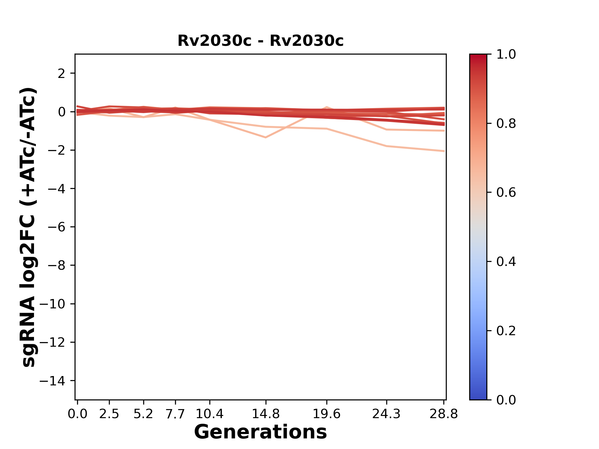 Experiment: We designed an M. tuberculosis CRISPRi library (RLC12) to target all annotated Mtb genes with single guide RNAs (sgRNAs) of varying predicted knockdown efficiencies. In parallel, we constructed a M. smegmatis CRISPRi library (RLC11) to target all annotated Msmeg genes, similar to the Mtb sgRNA library. RLC12 was transformed into M. tuberculosis H37Rv; RLC11 into M. smegmatis mc2-155. We passaged both CRISPRi libraries for nearly 30 generations in the presence or absence of the CRISPRi-inducer anhydrotetracycline (ATc). At the indicated timepoints, genomic DNA was harvested and the representation of individual sgRNAs was counted using Illumina sequencing. Here, we show sgRNA log2 fold-change values (L2FC) (plus versus minus ATc) over consecutive generations for sgRNAs targeting the gene you selected. sgRNAs are color-coded based on their predicted strength from blue (strength=0; weak) to red (strength=1; strong).