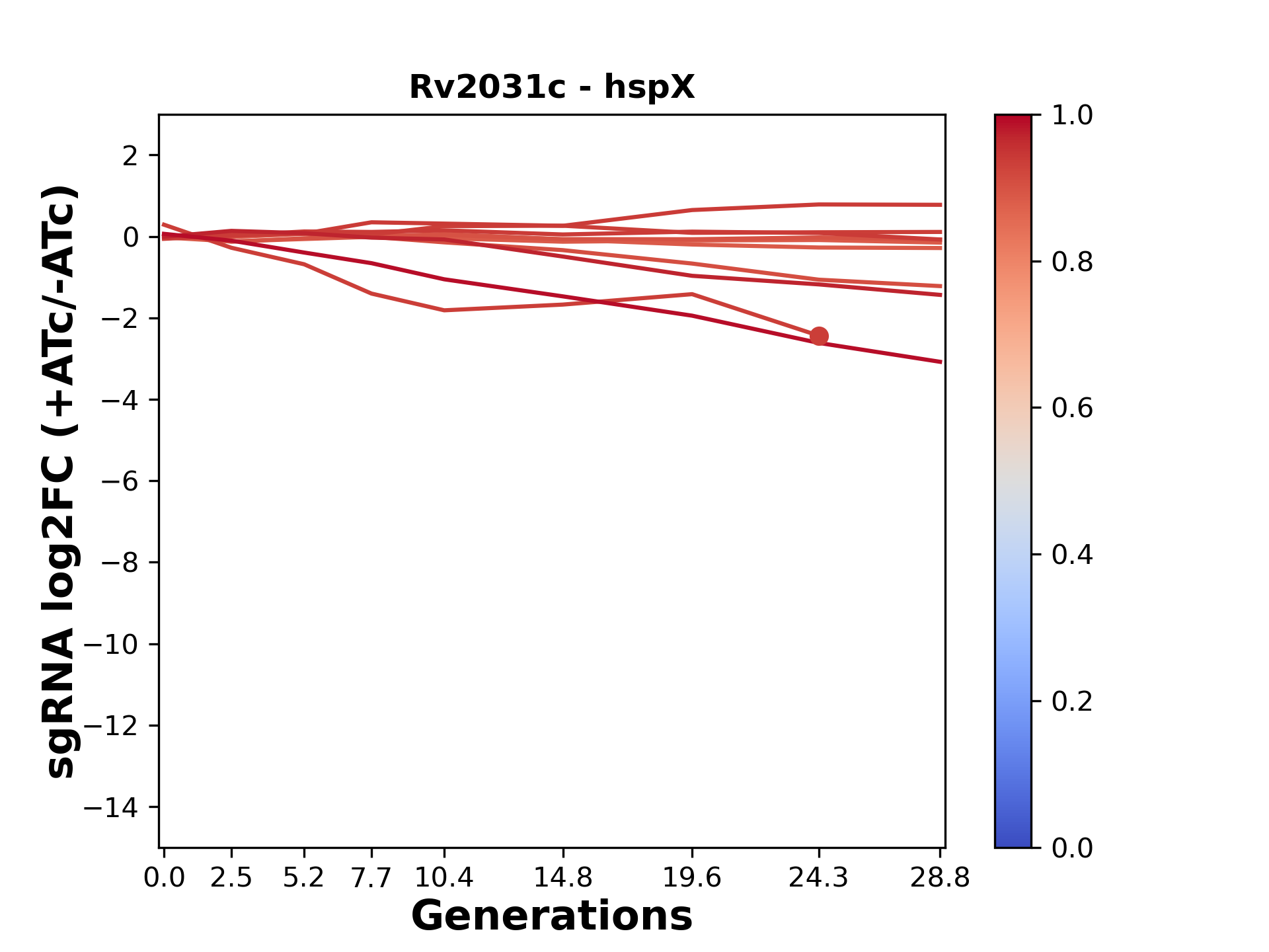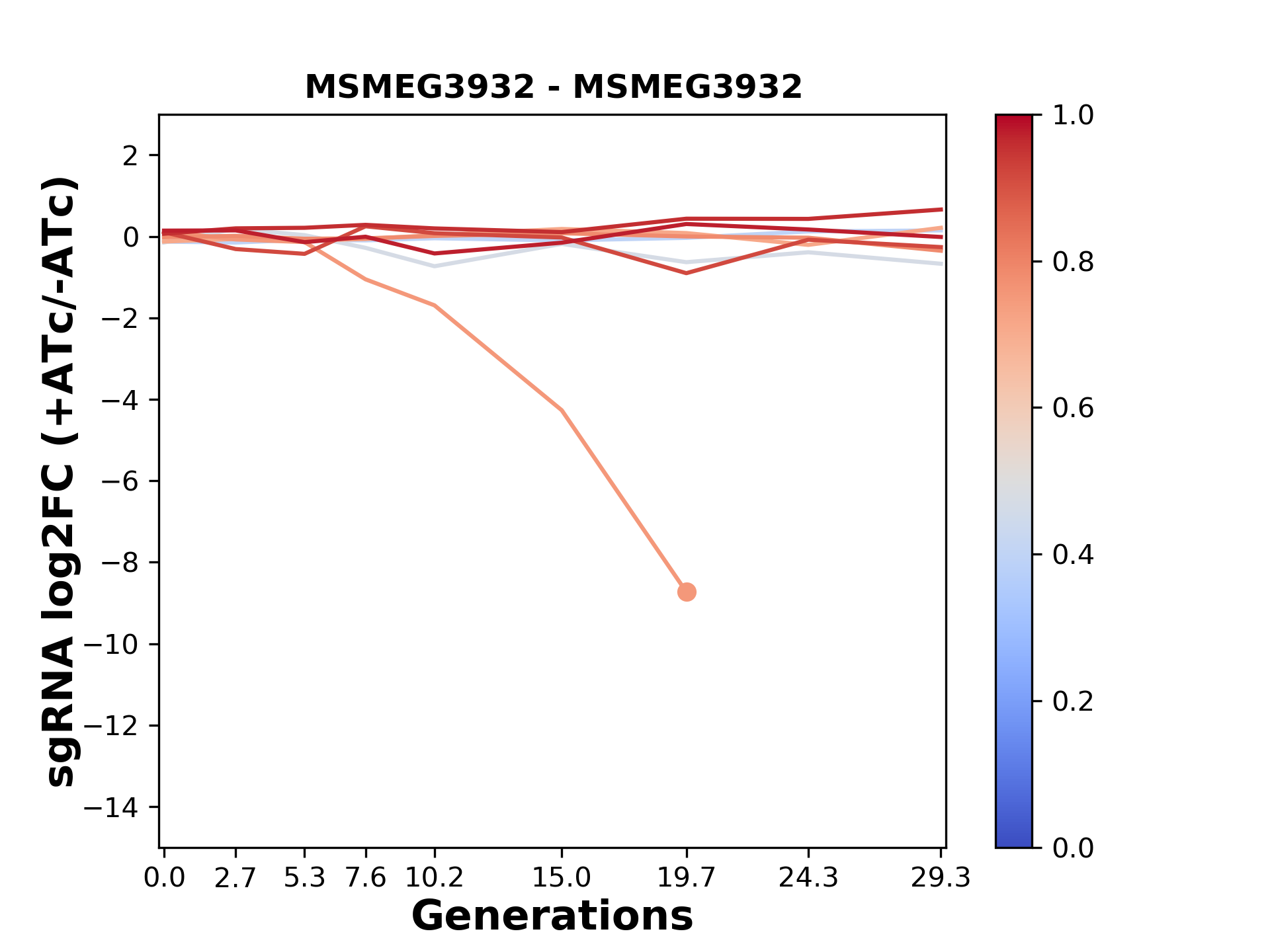 Experiment: We designed an M. tuberculosis CRISPRi library (RLC12) to target all annotated Mtb genes with single guide RNAs (sgRNAs) of varying predicted knockdown efficiencies. In parallel, we constructed a M. smegmatis CRISPRi library (RLC11) to target all annotated Msmeg genes, similar to the Mtb sgRNA library. RLC12 was transformed into M. tuberculosis H37Rv; RLC11 into M. smegmatis mc2-155. We passaged both CRISPRi libraries for nearly 30 generations in the presence or absence of the CRISPRi-inducer anhydrotetracycline (ATc). At the indicated timepoints, genomic DNA was harvested and the representation of individual sgRNAs was counted using Illumina sequencing. Here, we show sgRNA log2 fold-change values (L2FC) (plus versus minus ATc) over consecutive generations for sgRNAs targeting the gene you selected. sgRNAs are color-coded based on their predicted strength from blue (strength=0; weak) to red (strength=1; strong).