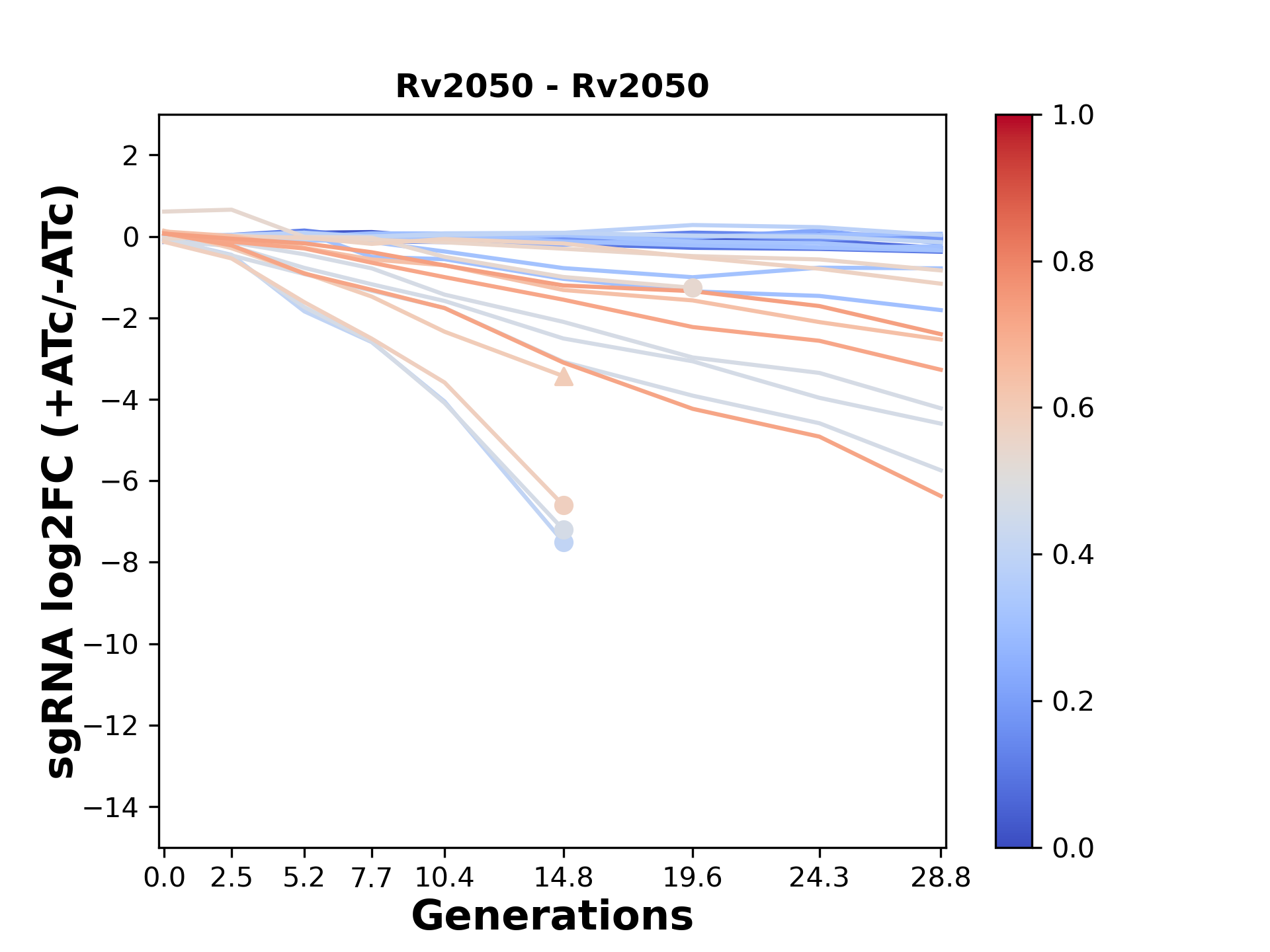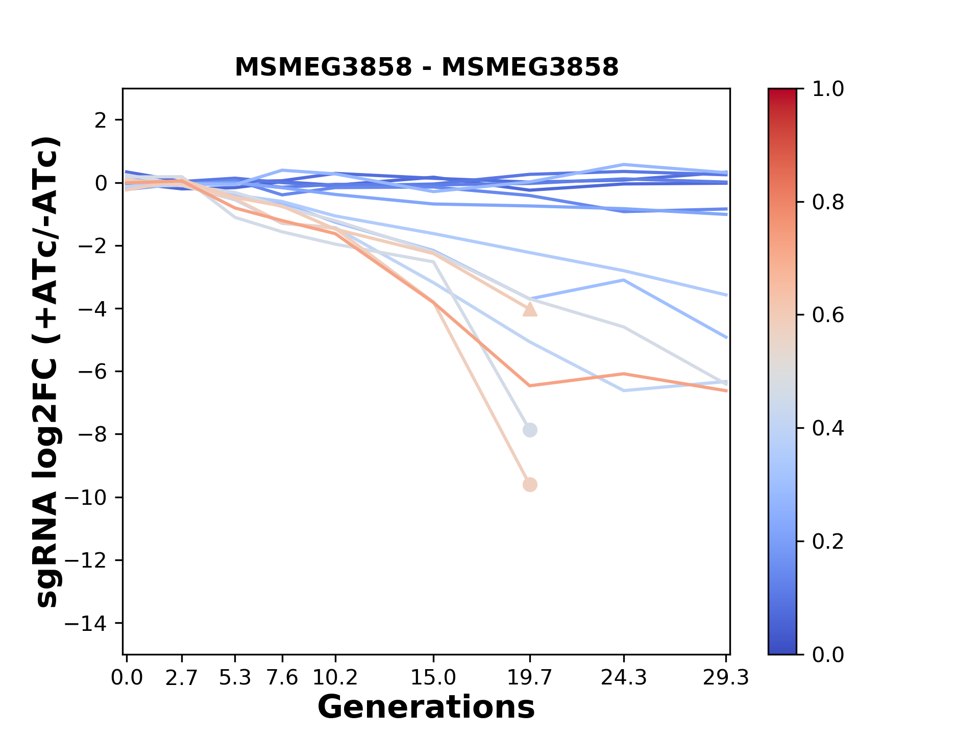 Here, we show sgRNA log2 fold-change values (L2FC) (plus versus minus ATc) over consecutive generations for sgRNAs targeting the gene you selected.