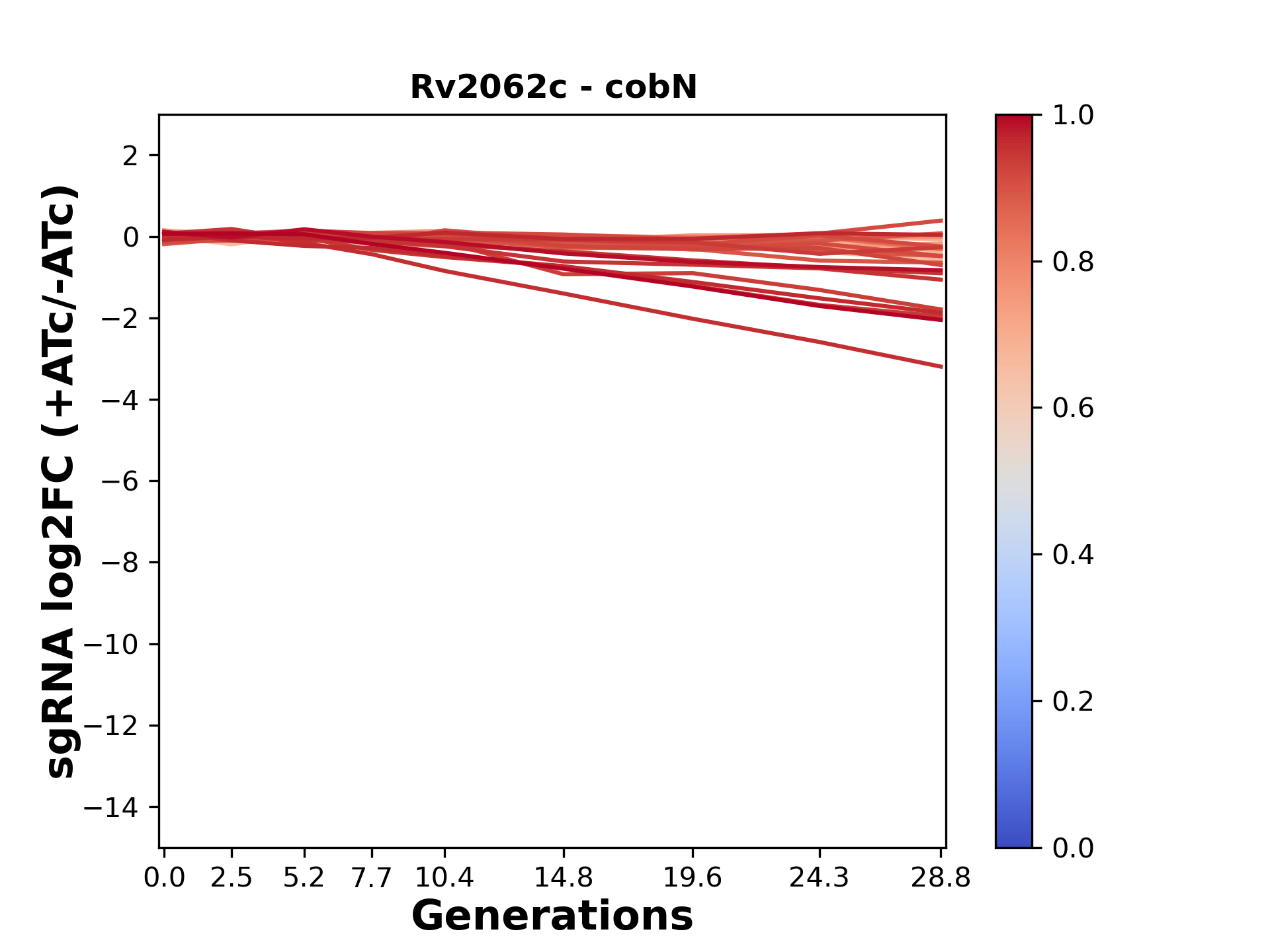 Here, we show sgRNA log2 fold-change values (L2FC) (plus versus minus ATc) over consecutive generations for sgRNAs targeting the gene you selected.