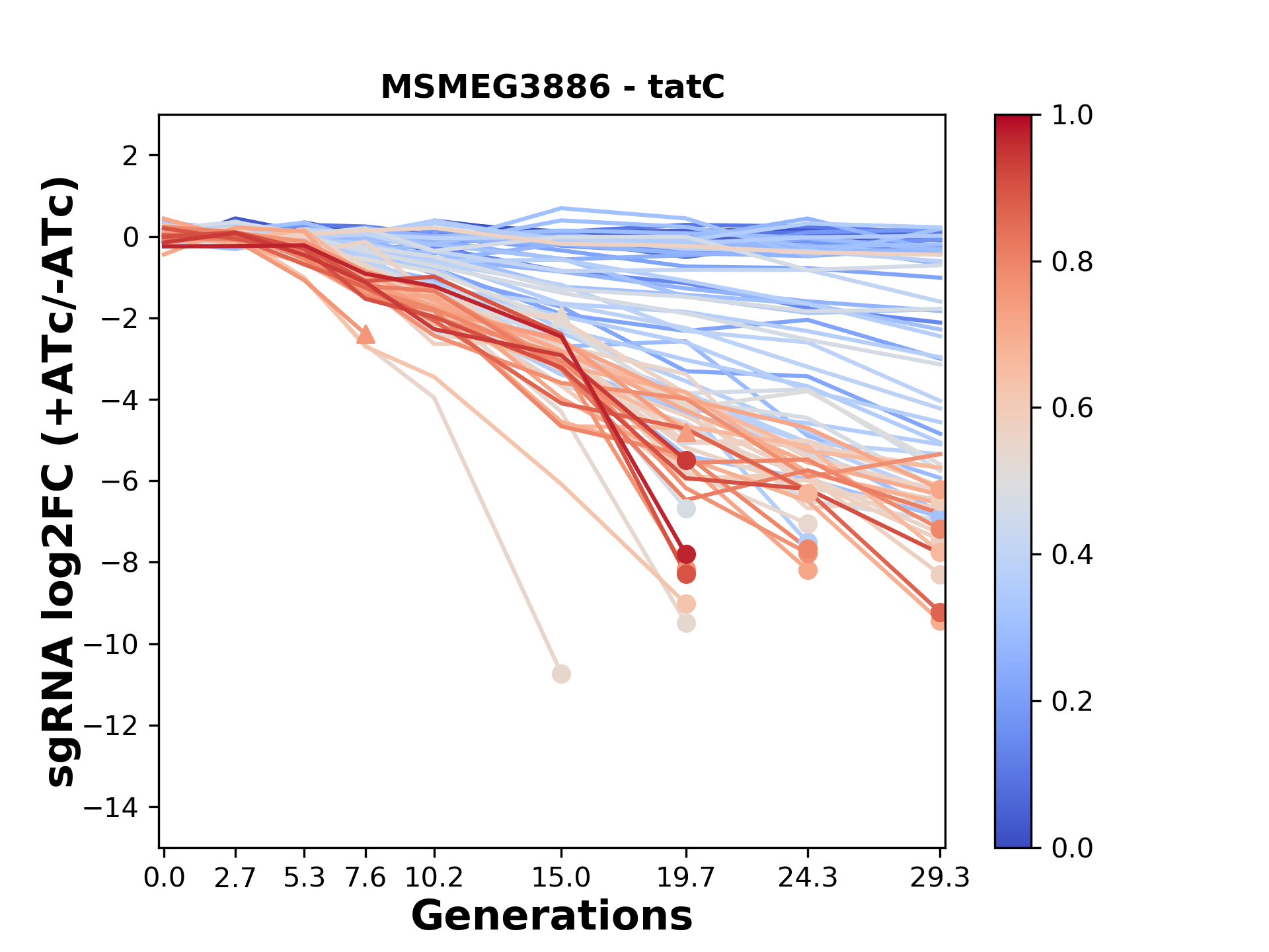 Here, we show sgRNA log2 fold-change values (L2FC) (plus versus minus ATc) over consecutive generations for sgRNAs targeting the gene you selected.