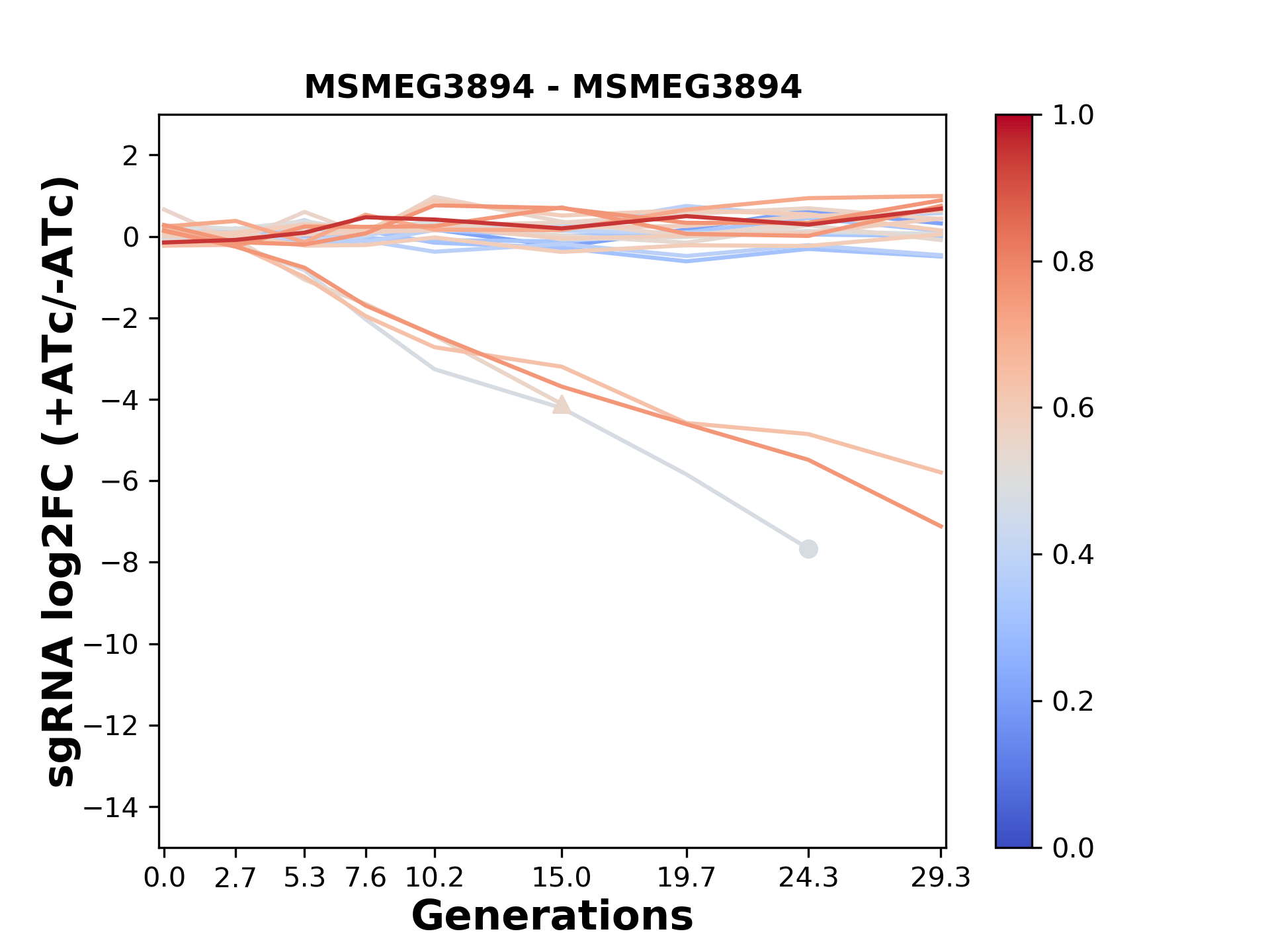 Here, we show sgRNA log2 fold-change values (L2FC) (plus versus minus ATc) over consecutive generations for sgRNAs targeting the gene you selected.