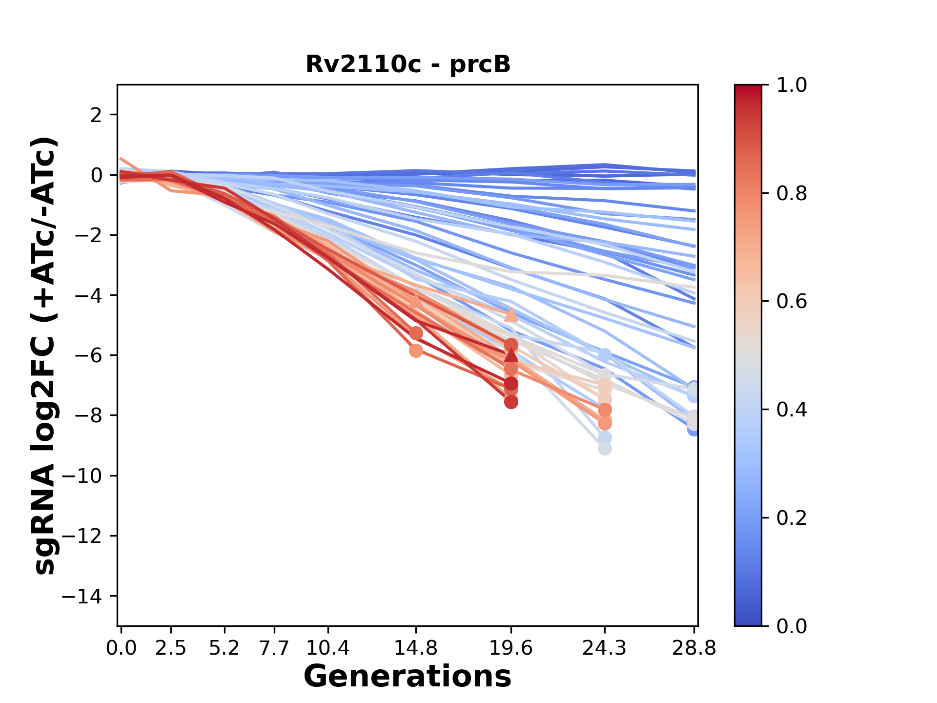 Here, we show sgRNA log2 fold-change values (L2FC) (plus versus minus ATc) over consecutive generations for sgRNAs targeting the gene you selected.