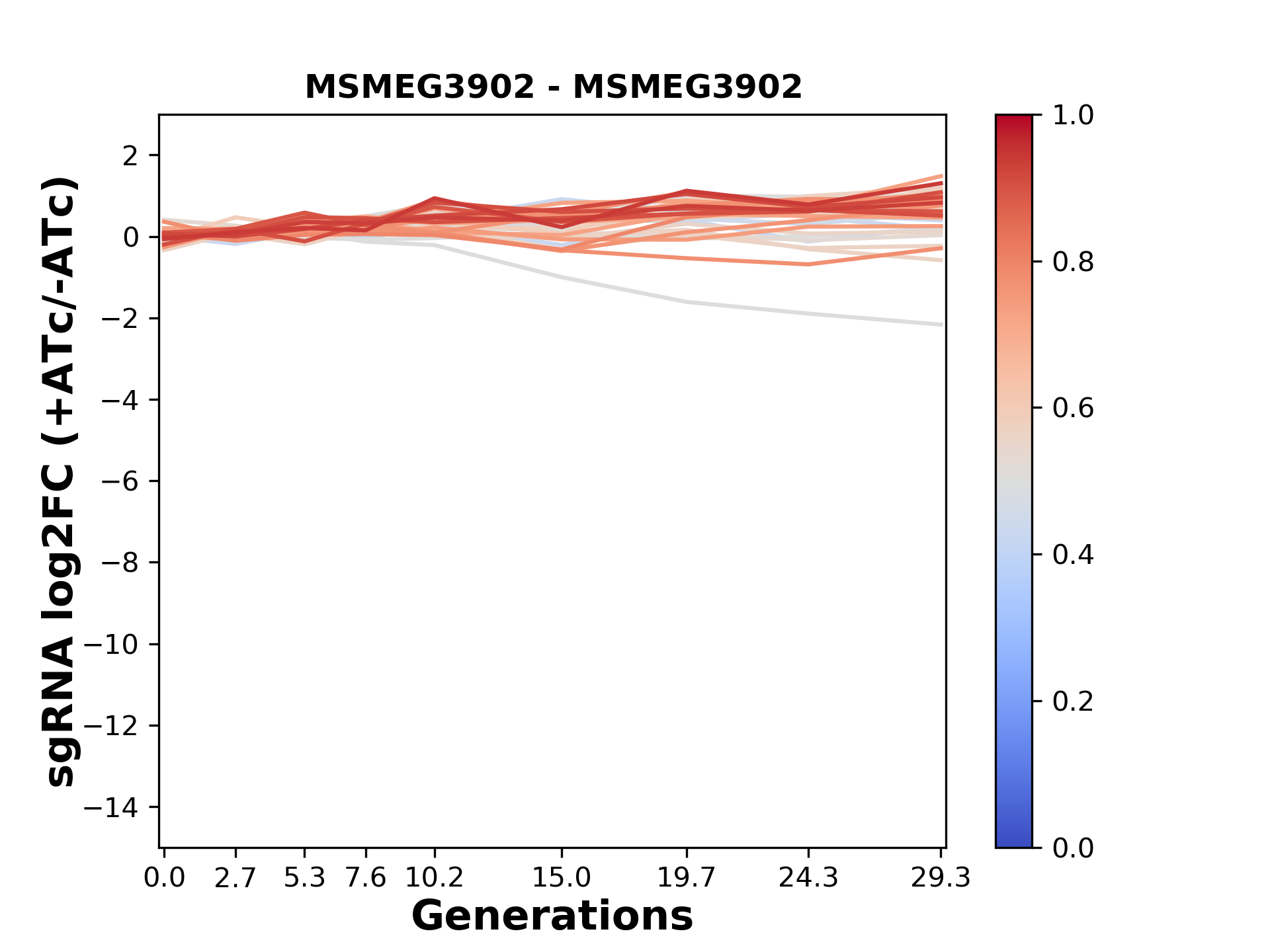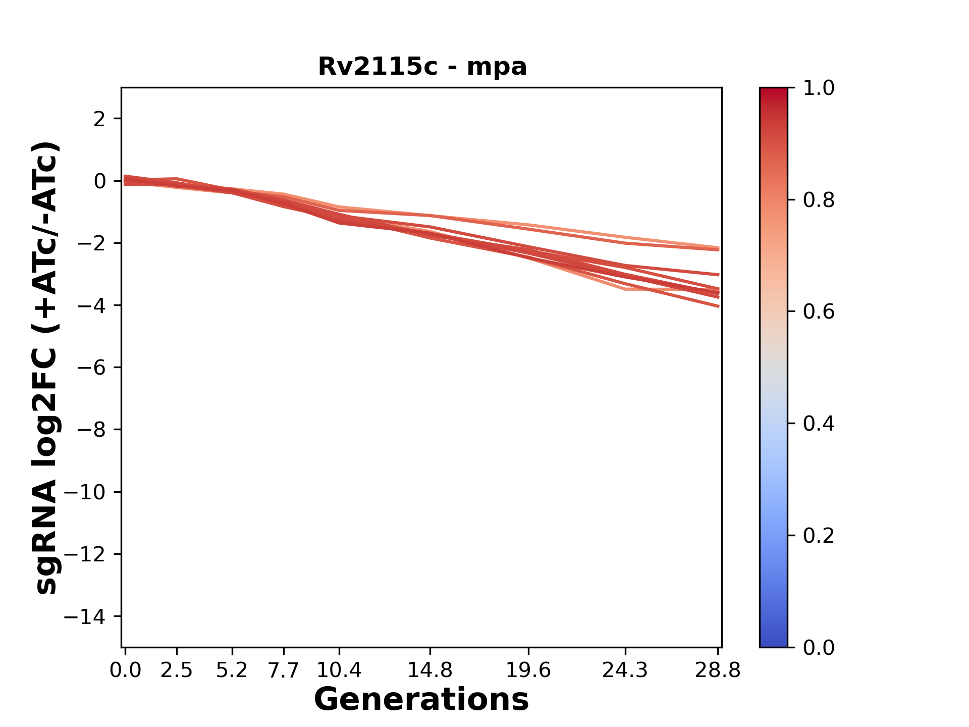 Here, we show sgRNA log2 fold-change values (L2FC) (plus versus minus ATc) over consecutive generations for sgRNAs targeting the gene you selected.