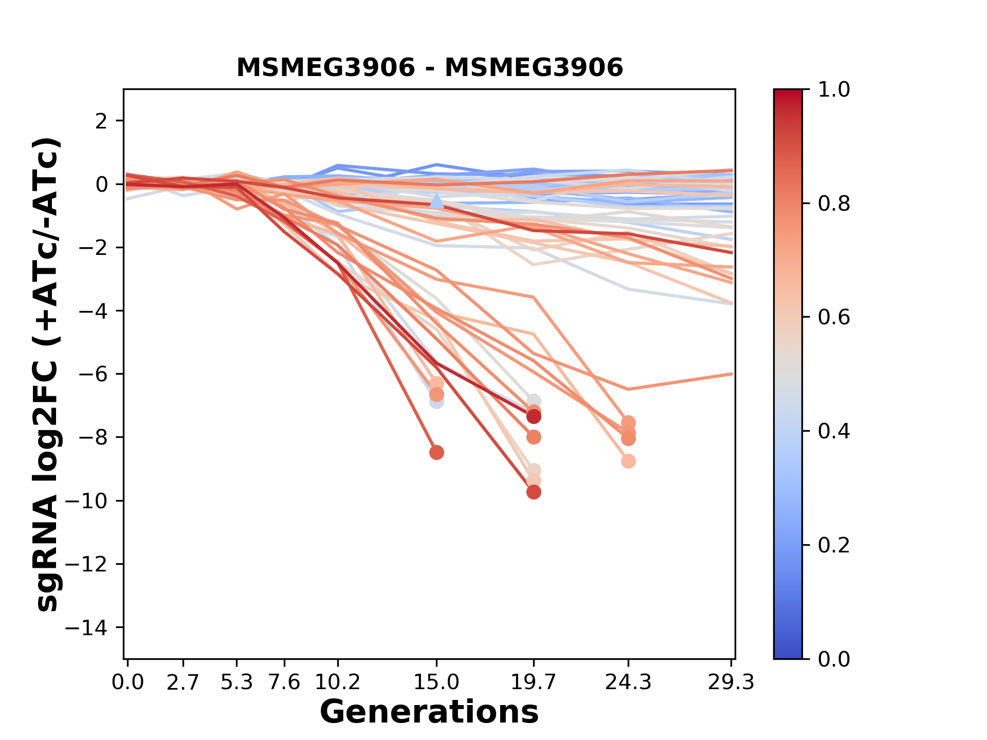 Here, we show sgRNA log2 fold-change values (L2FC) (plus versus minus ATc) over consecutive generations for sgRNAs targeting the gene you selected.