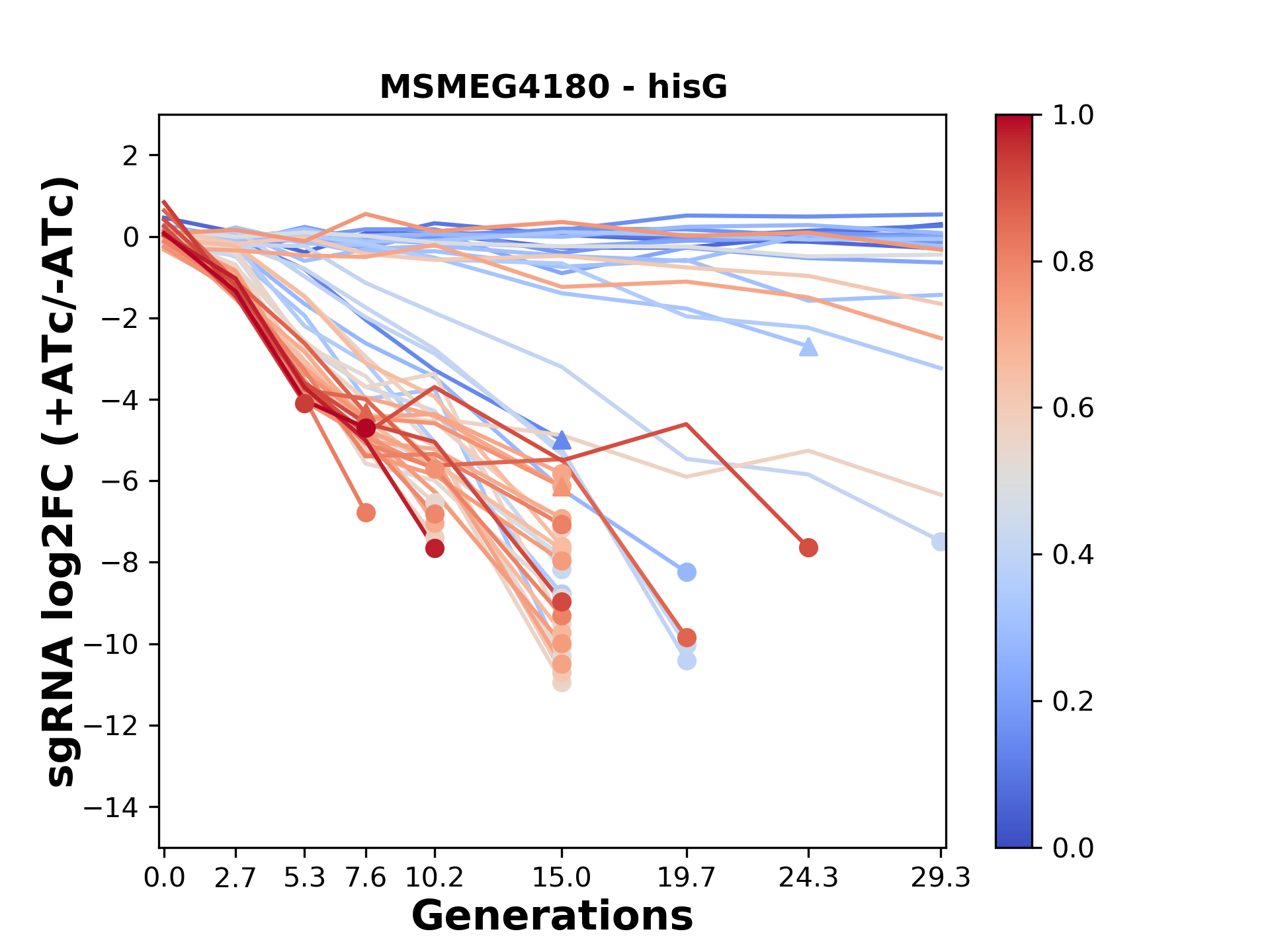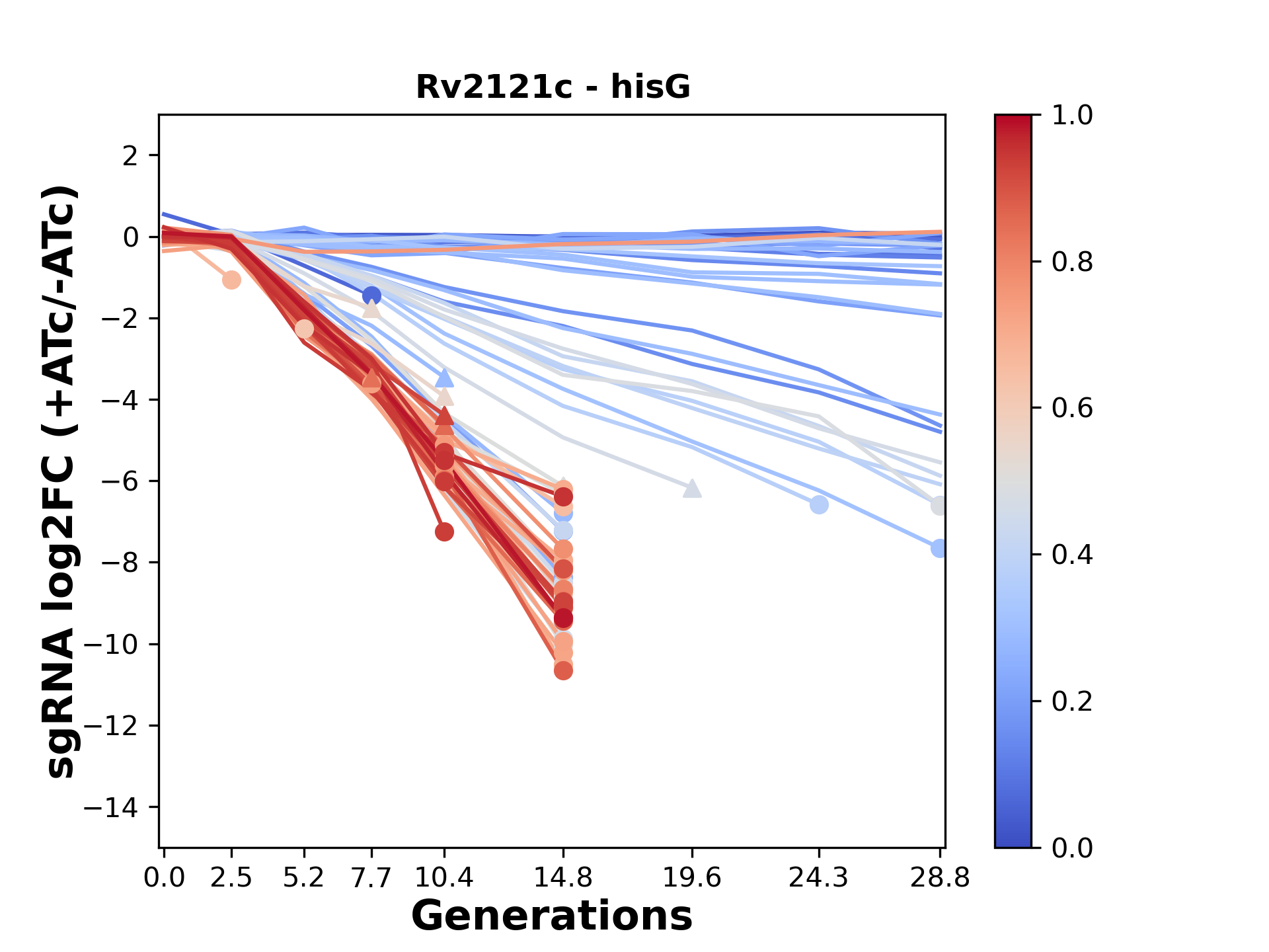 Experiment: We designed an M. tuberculosis CRISPRi library (RLC12) to target all annotated Mtb genes with single guide RNAs (sgRNAs) of varying predicted knockdown efficiencies. In parallel, we constructed a M. smegmatis CRISPRi library (RLC11) to target all annotated Msmeg genes, similar to the Mtb sgRNA library. RLC12 was transformed into M. tuberculosis H37Rv; RLC11 into M. smegmatis mc2-155. We passaged both CRISPRi libraries for nearly 30 generations in the presence or absence of the CRISPRi-inducer anhydrotetracycline (ATc). At the indicated timepoints, genomic DNA was harvested and the representation of individual sgRNAs was counted using Illumina sequencing. Here, we show sgRNA log2 fold-change values (L2FC) (plus versus minus ATc) over consecutive generations for sgRNAs targeting the gene you selected. sgRNAs are color-coded based on their predicted strength from blue (strength=0; weak) to red (strength=1; strong).