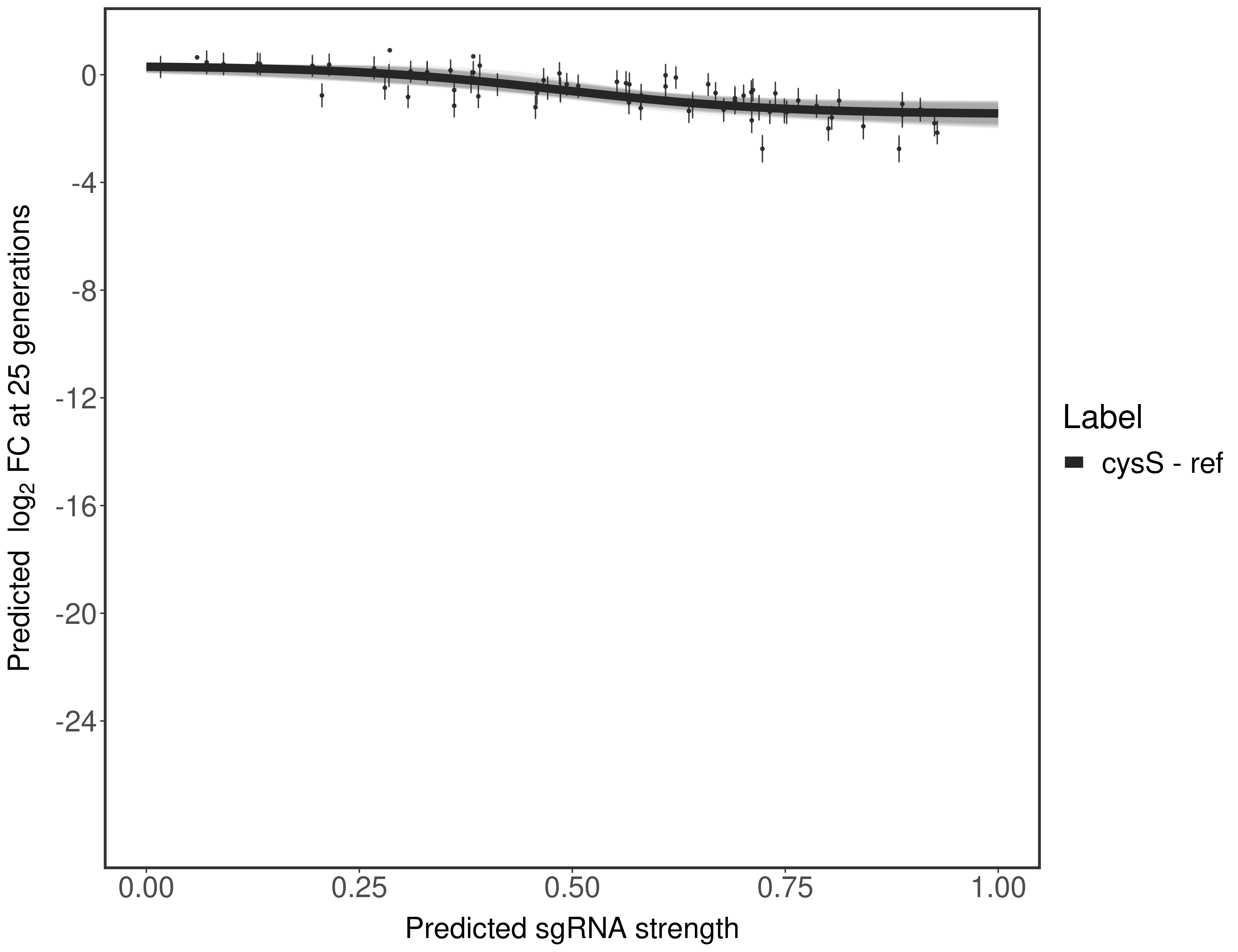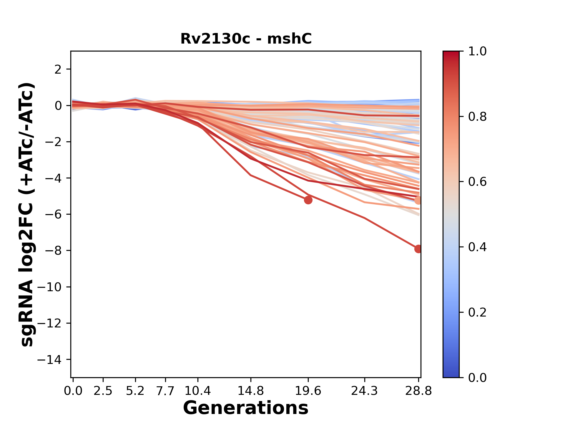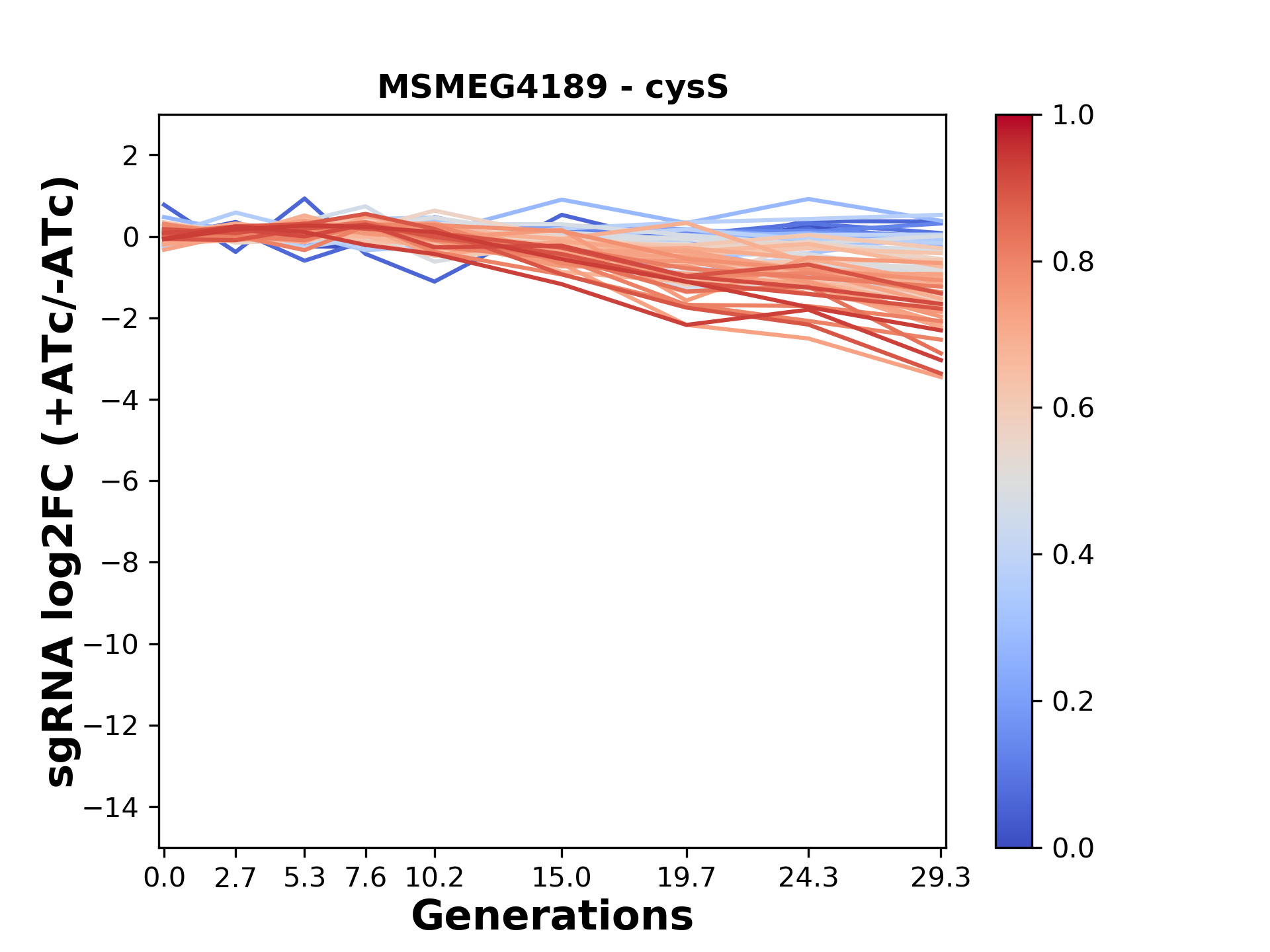 Here, we show sgRNA log2 fold-change values (L2FC) (plus versus minus ATc) over consecutive generations for sgRNAs targeting the gene you selected.