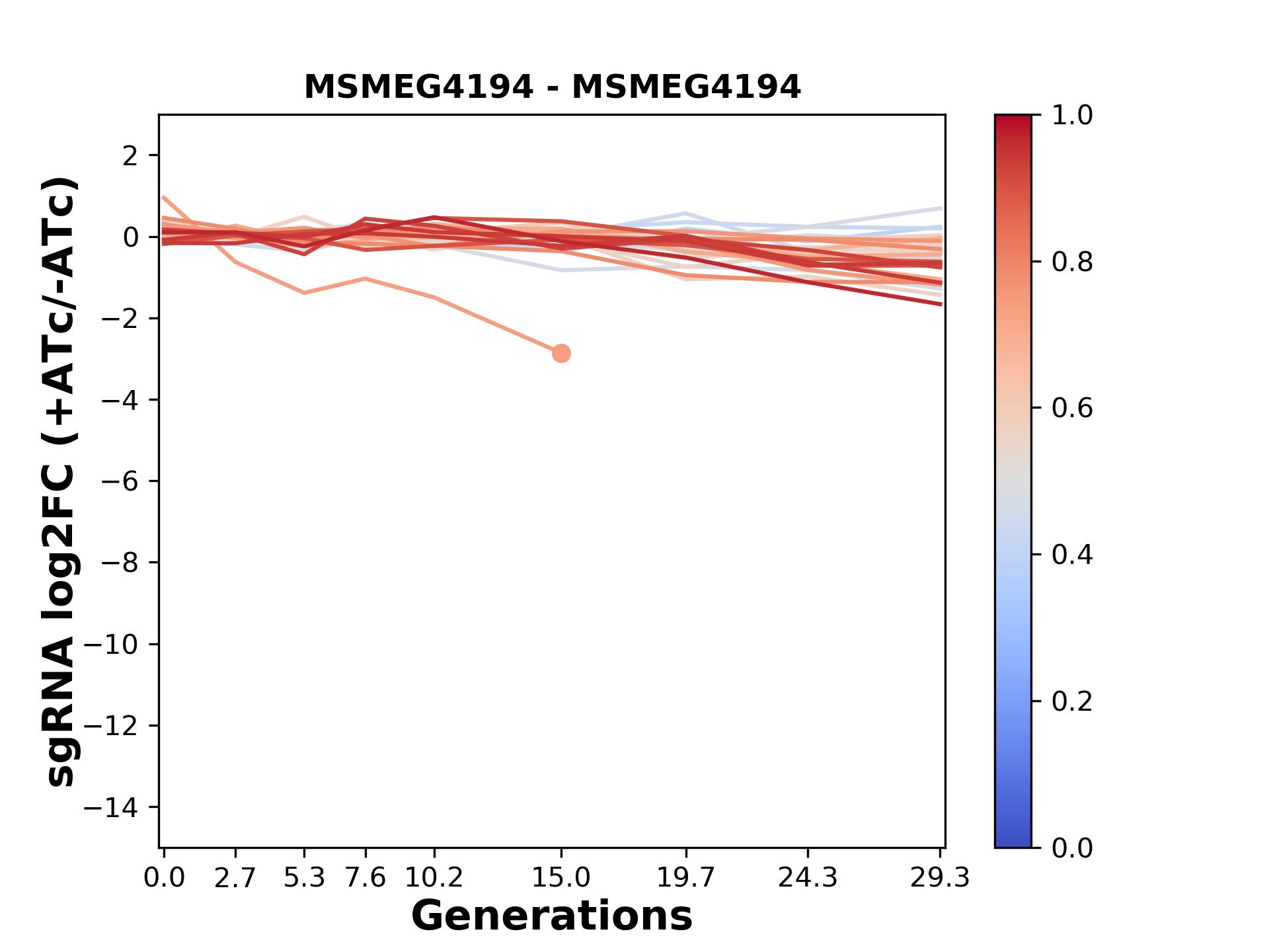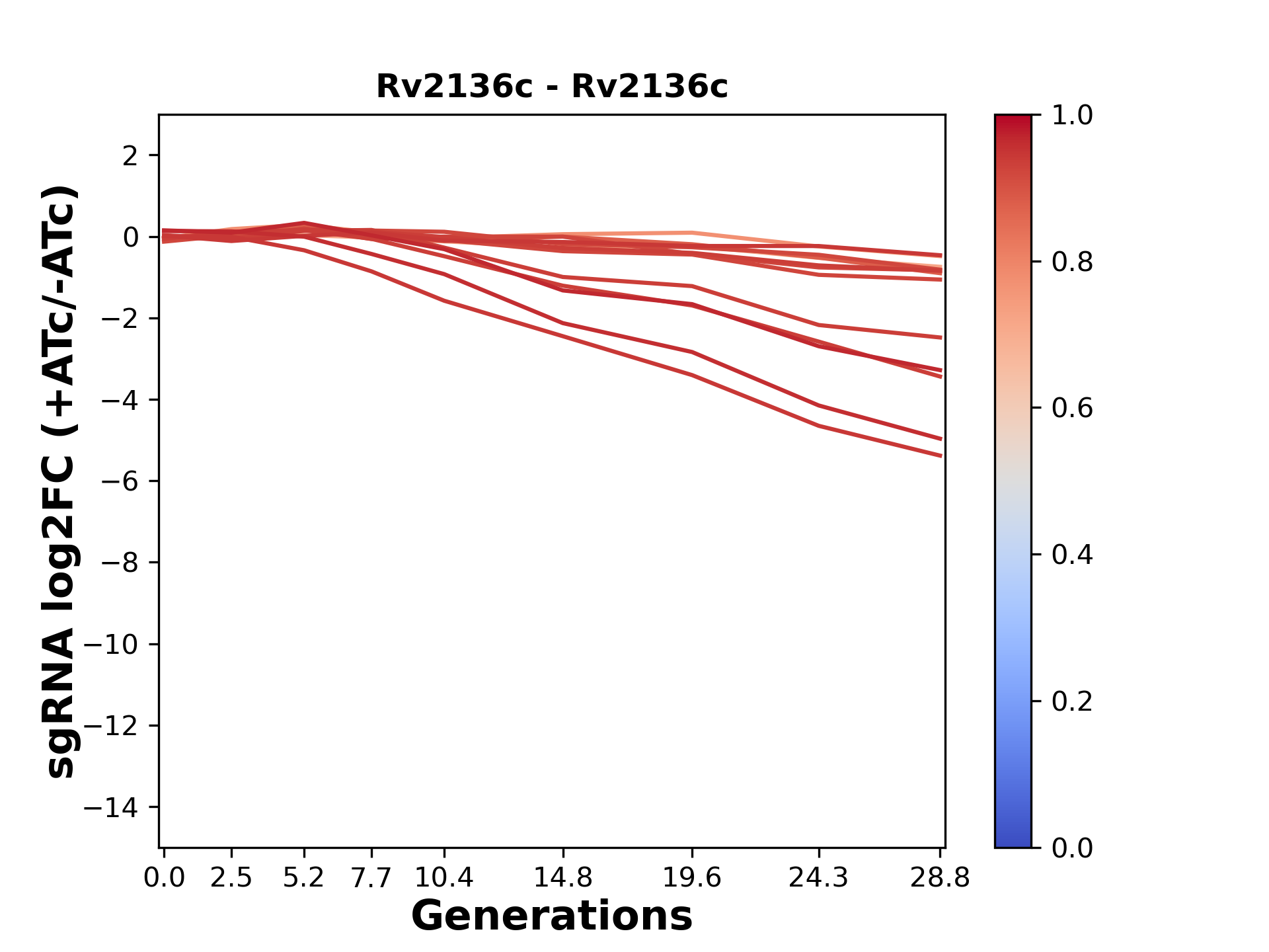 Here, we show sgRNA log2 fold-change values (L2FC) (plus versus minus ATc) over consecutive generations for sgRNAs targeting the gene you selected.