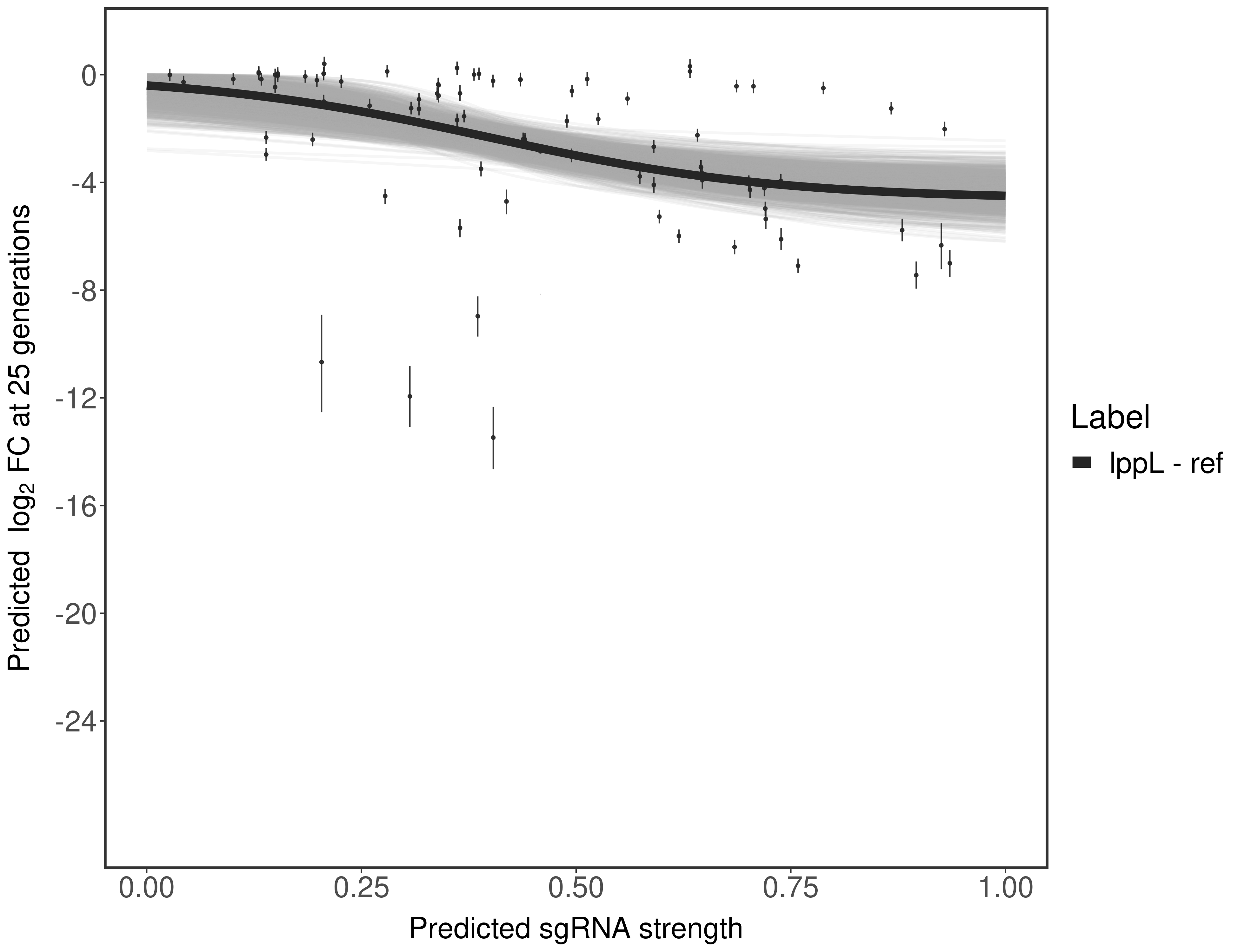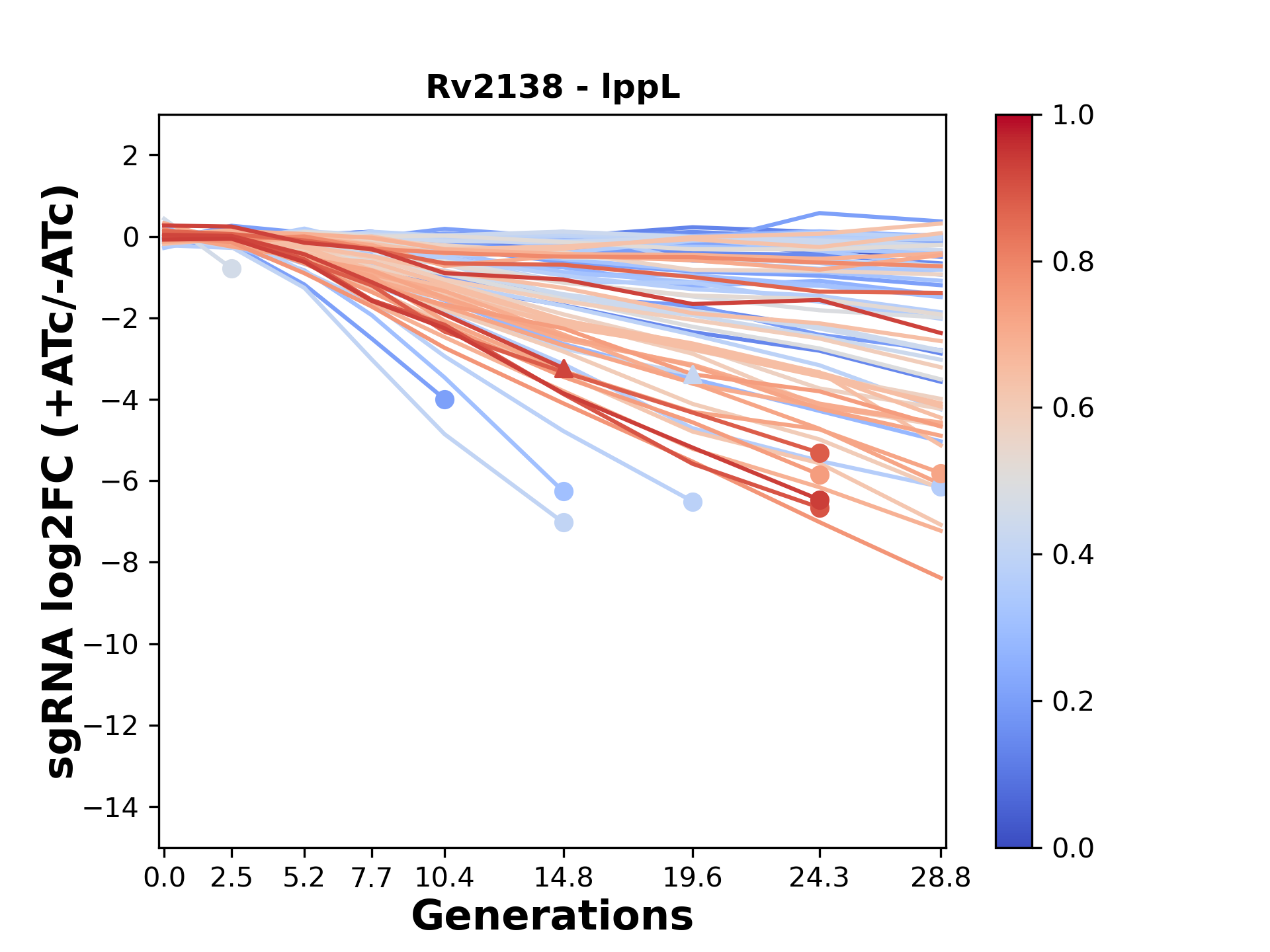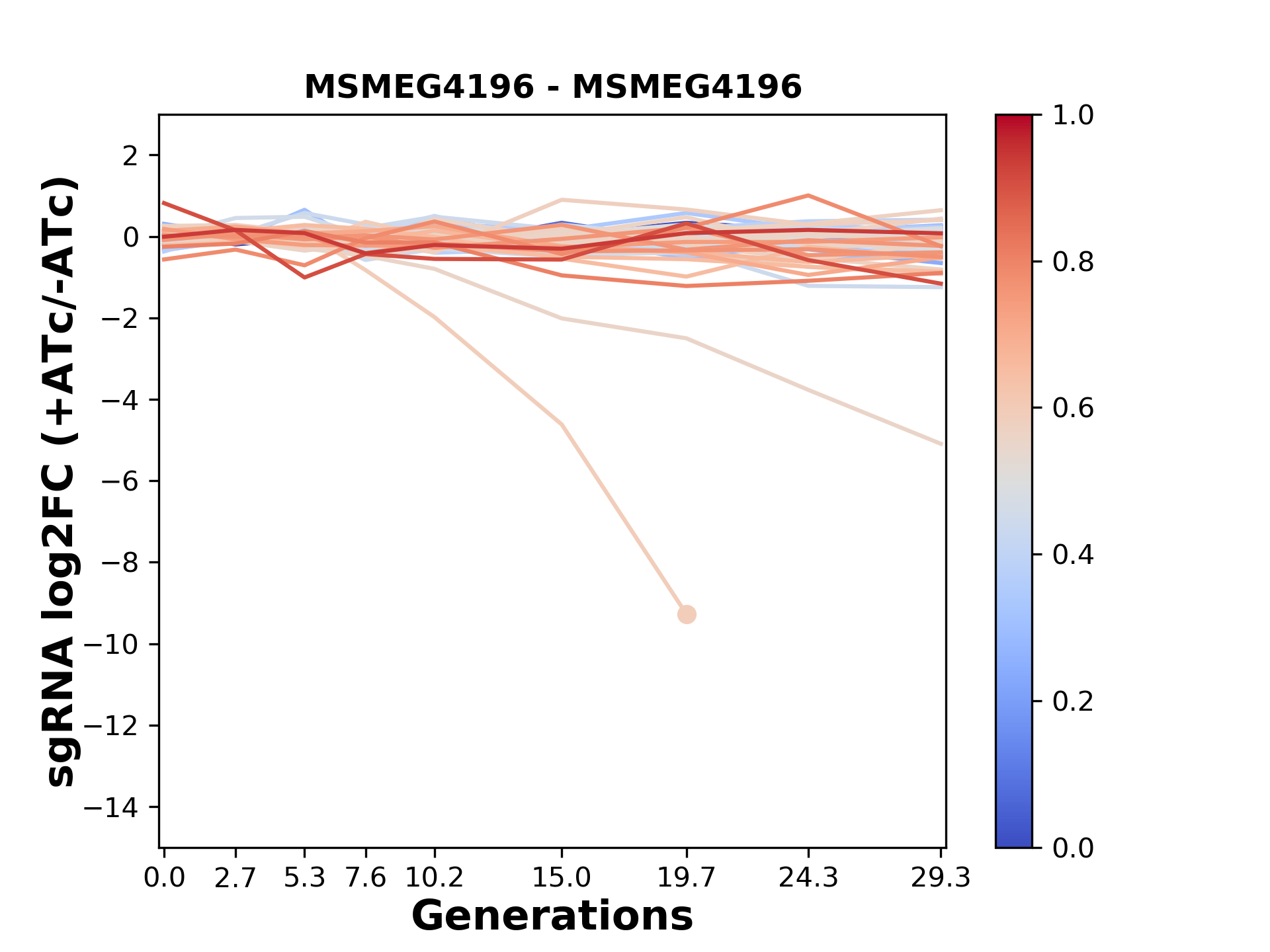 Here, we show sgRNA log2 fold-change values (L2FC) (plus versus minus ATc) over consecutive generations for sgRNAs targeting the gene you selected.