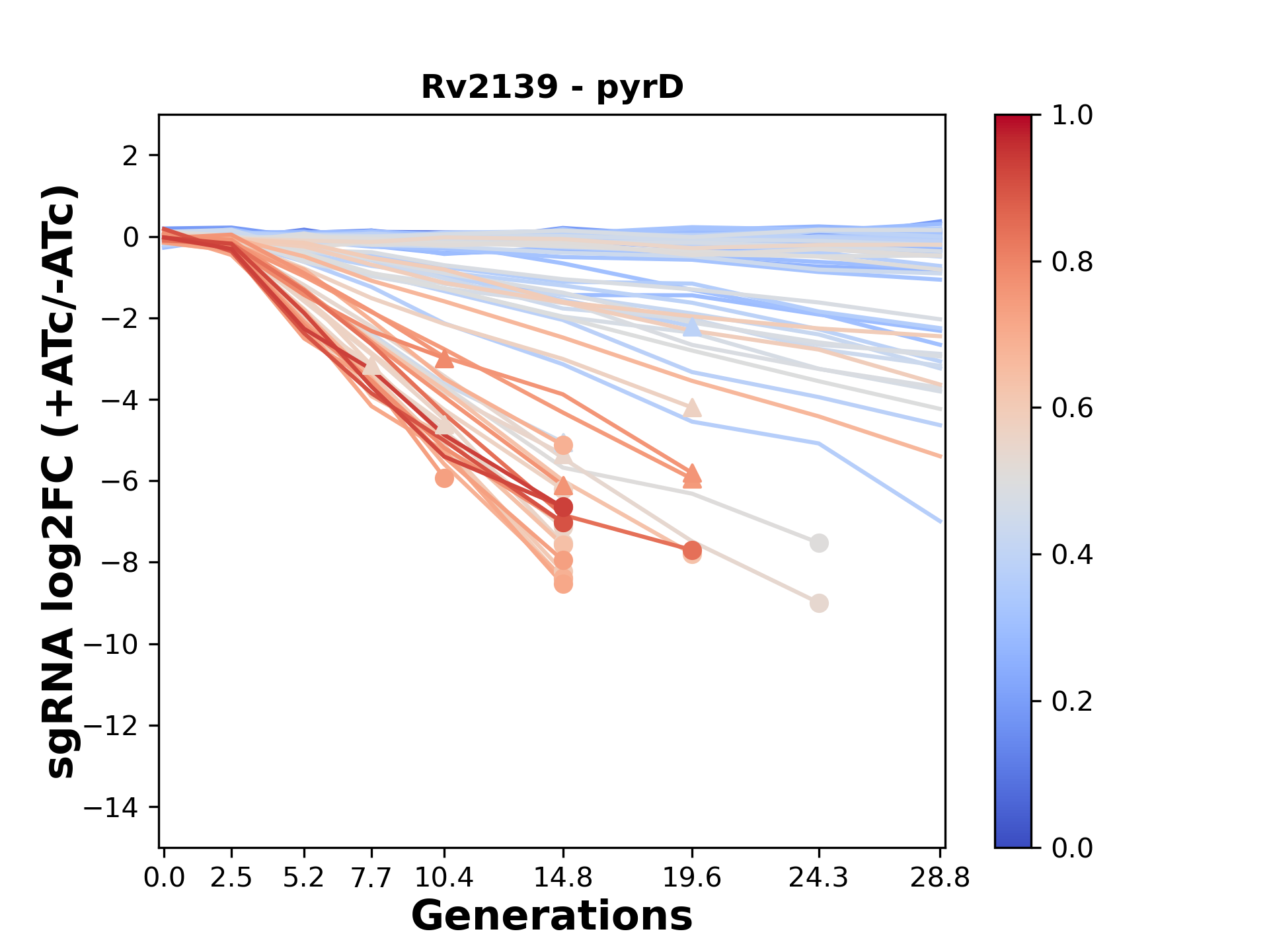 Here, we show sgRNA log2 fold-change values (L2FC) (plus versus minus ATc) over consecutive generations for sgRNAs targeting the gene you selected.