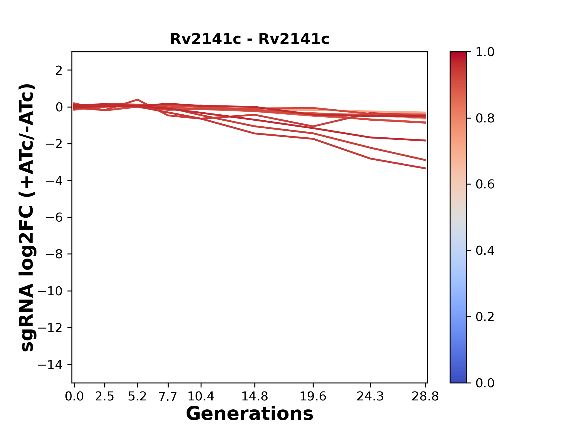 Here, we show sgRNA log2 fold-change values (L2FC) (plus versus minus ATc) over consecutive generations for sgRNAs targeting the gene you selected.