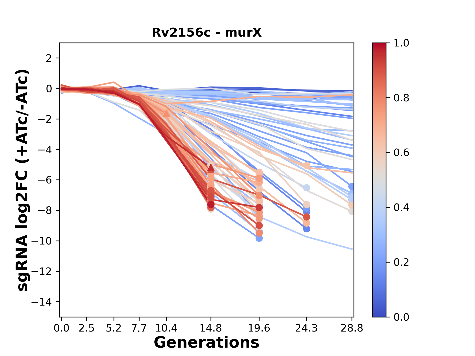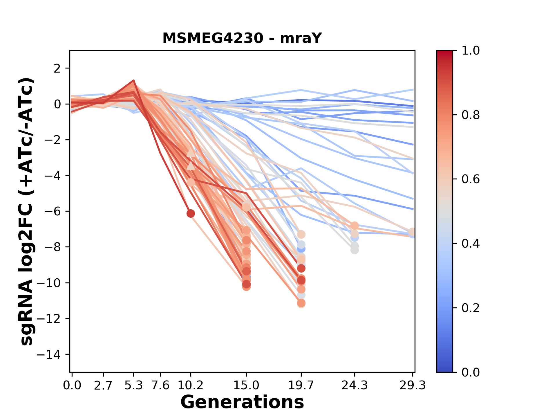 Here, we show sgRNA log2 fold-change values (L2FC) (plus versus minus ATc) over consecutive generations for sgRNAs targeting the gene you selected.